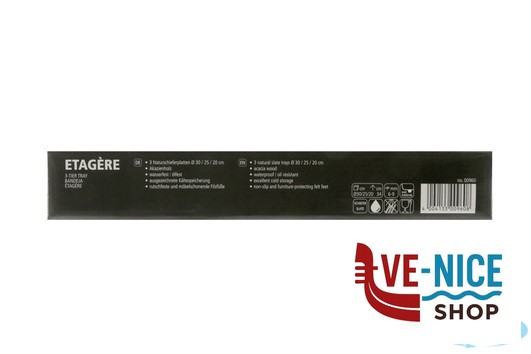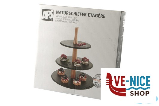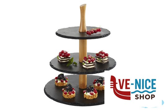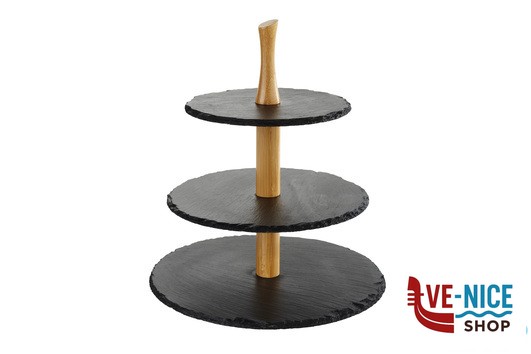 ARDESIA NATURALE-ALZATA IN ARDESIA 3 PIANI CM 30-25-20 CON PIANTANA IN LEGNO D’ACACIA H.34 00960