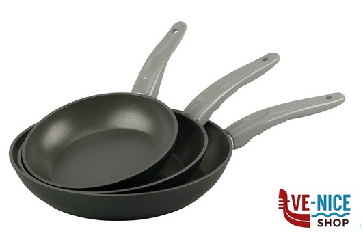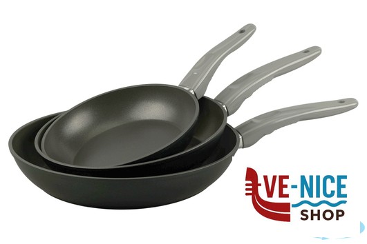 SET DI 3 PADELLE FORGIATE DI ALTA QUALITA, CORPO IN ALLUMINIO ANTIADERENTE NERO E MANICO IN BAKELITE GRIGIO. ANCHE PER COTTURA AD INDUZIONE