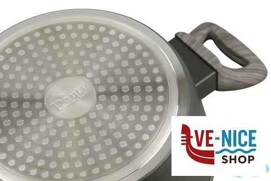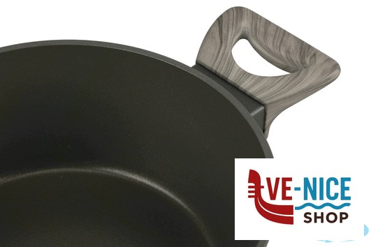 LINEA DI PENTOLAME FORGIATO DI ALTA QUALITA, CORPO IN ALLUMINIO ANTIADERENTE NERO E MANICO CON RIVESTIMENTO SOFTOUCH EFFETTO LEGNO. ANCHE PER COTTURA AD INDUZIONE