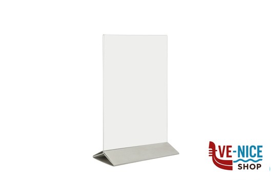 PORTA POSTER DA TAVOLA IN ACRILICO UTILIZZABILE SU DUE LATI, FACILE DA PULIRE E CON BASE IN ACCIAIO INOSSIDABILE.