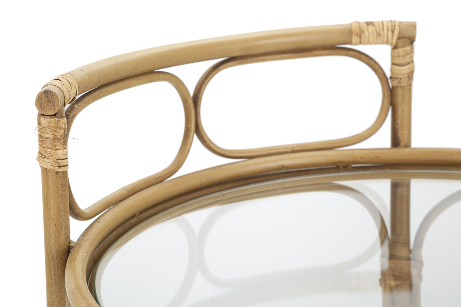 descrizione : BOHO CHICHIRON, GLASS AND PLASTICBROWNCARRELLO ROTONDO IN METALLO CON FINITURE IN RATTAN COMPLETO DI 2 RIPIANI IN VETRO E PRATICHE ROTELLE CON FRENO.