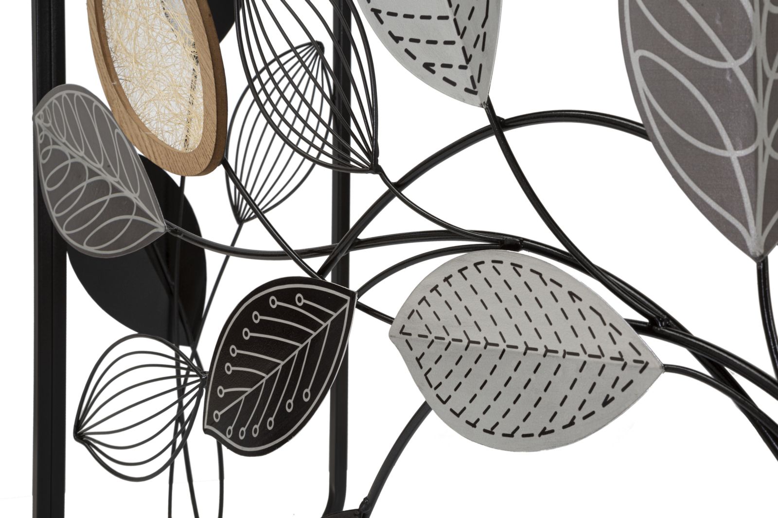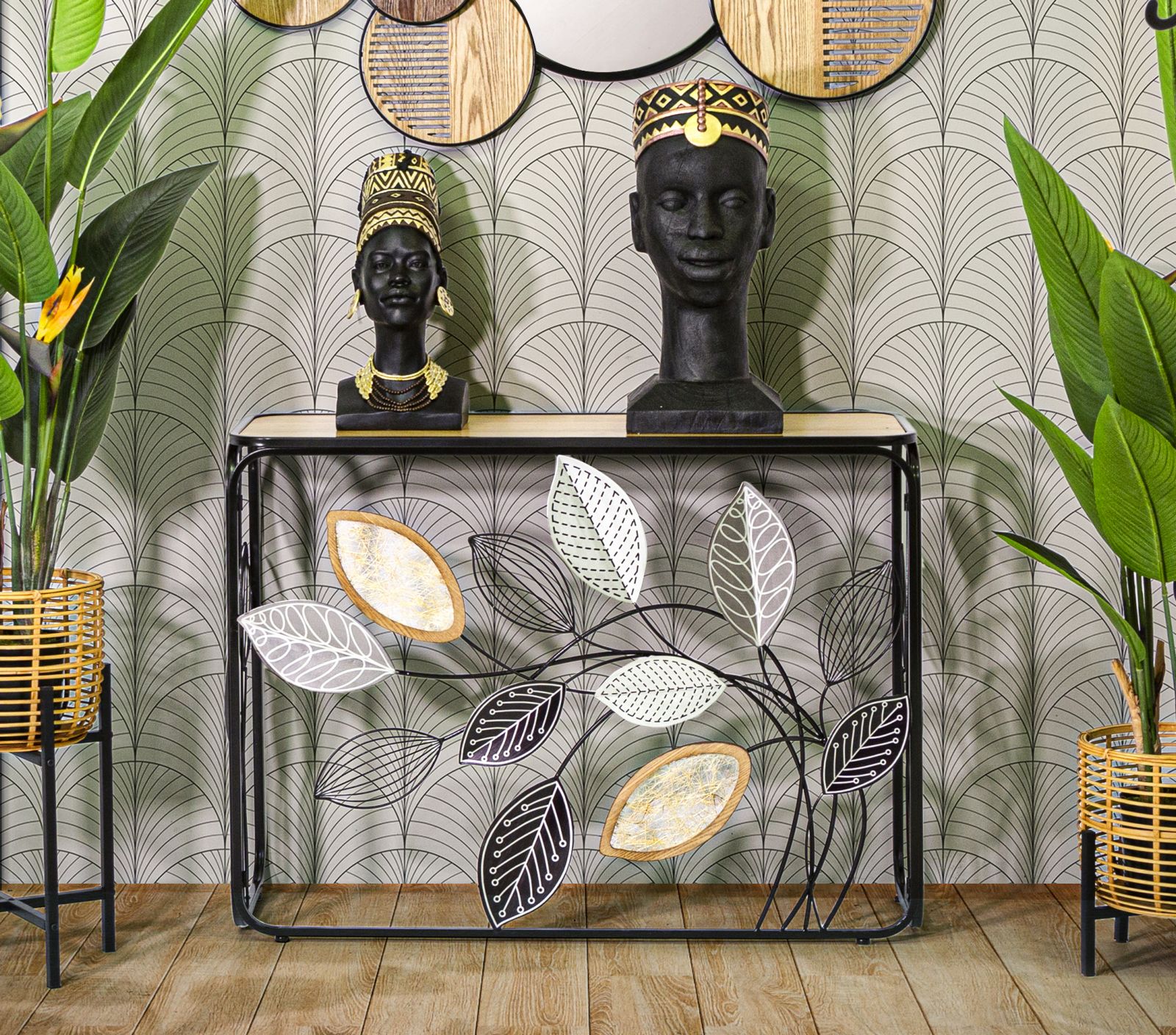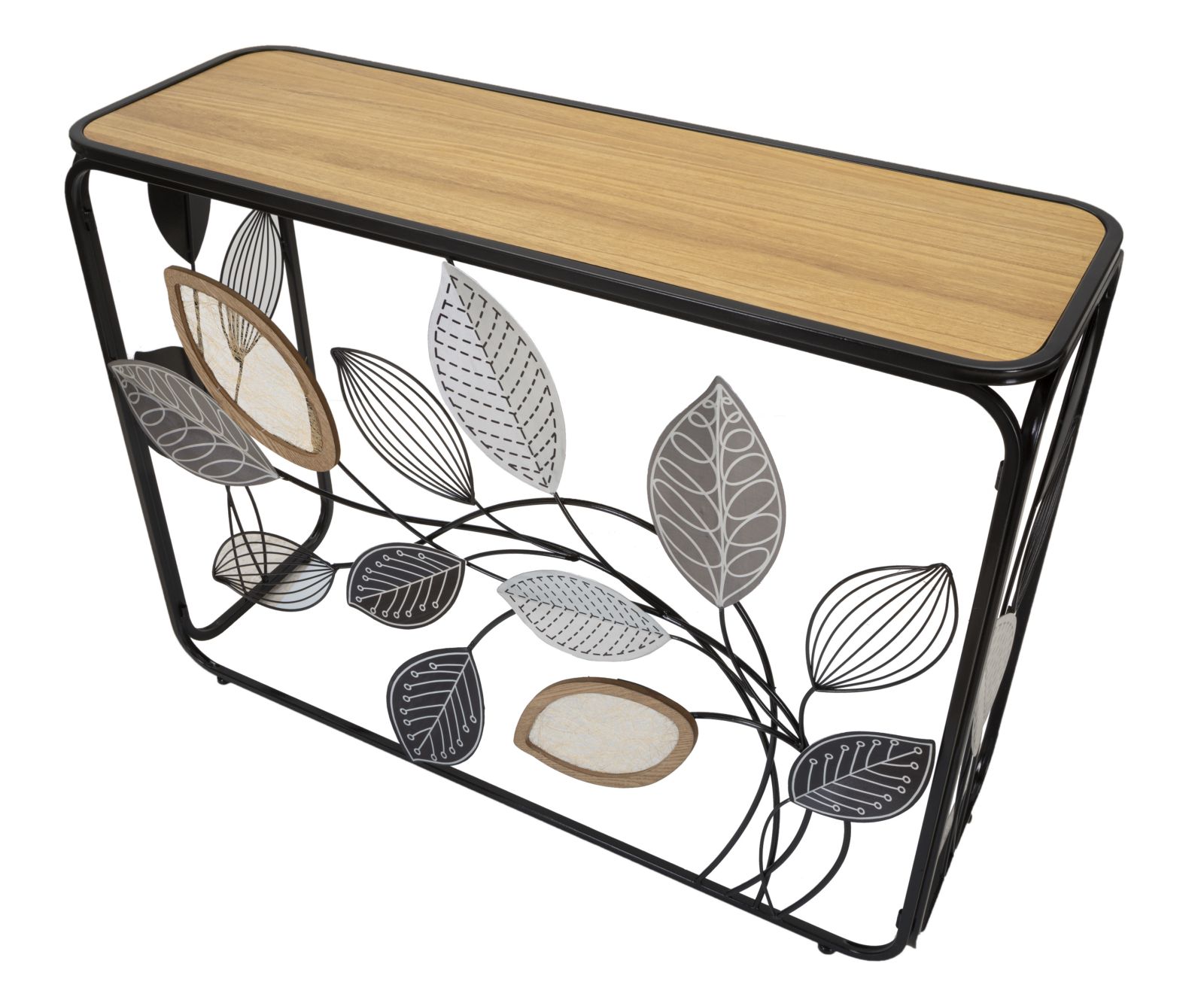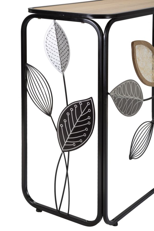 descrizione : BOHO CHICHIRON, MDF AND GLASSMULTICOLORCONSOLE RETTANGOLARE IN METALLO NERO CON FOGLIE DECORATIVE E PIANO IN LEGNO MARRONE.