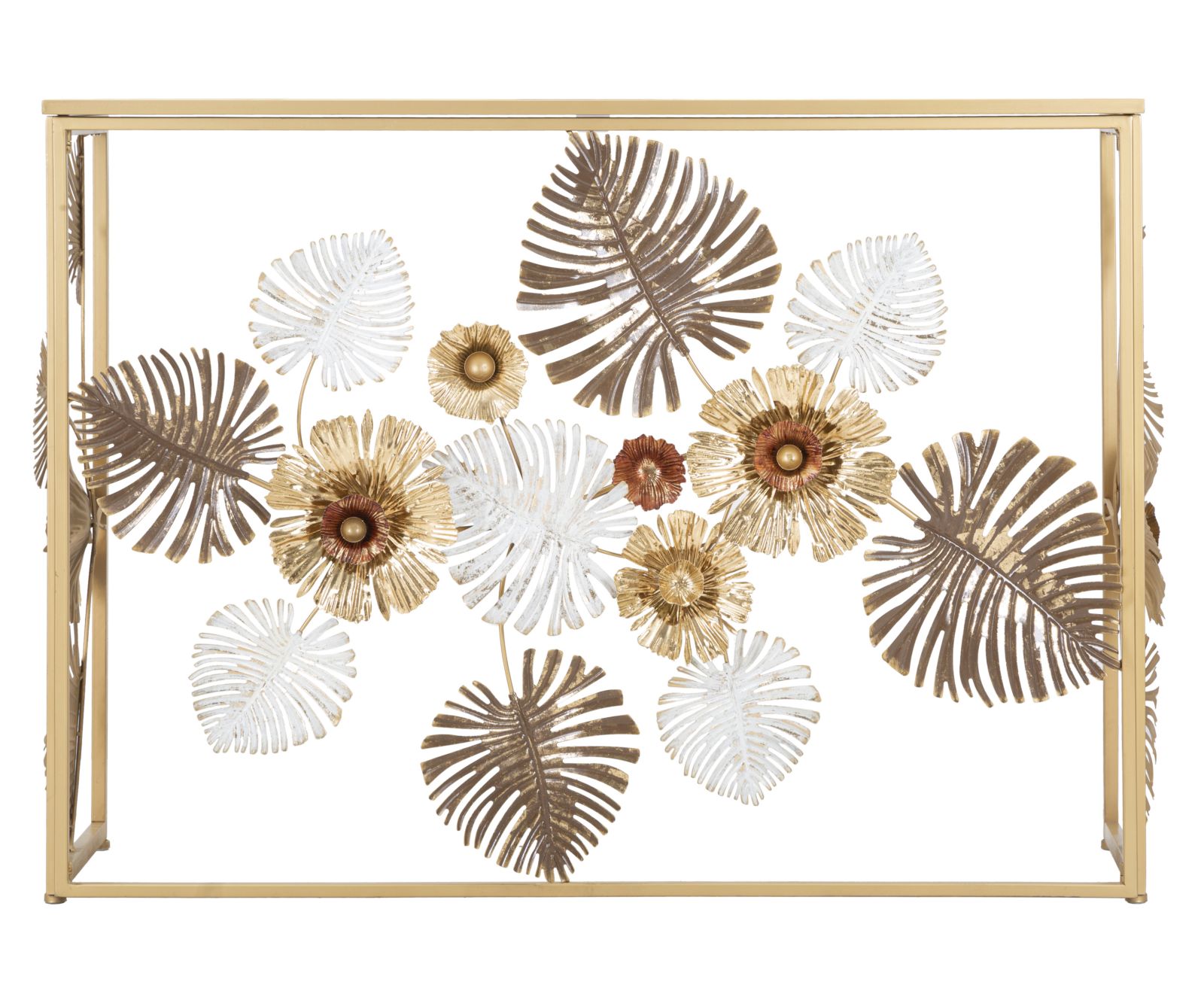 descrizione : GLAMIRON, MDF E SPECCHIOMULTICOLORCONSOLE IN METALLO DORATO CON PIANO IN VETRO A SPECCHIO. LA STRUTTURA È DECORATA DA FOGLIE E FIORI SU TUTTI I LATI. IL PARTICOLARE DESIGN E LA SEMPLICITÀ DELLE LINEE DELLA STRUTTURA DONANO UN TOCCO DI CLASSE ED ELEGANZA AD OGNI AMBIENTE.