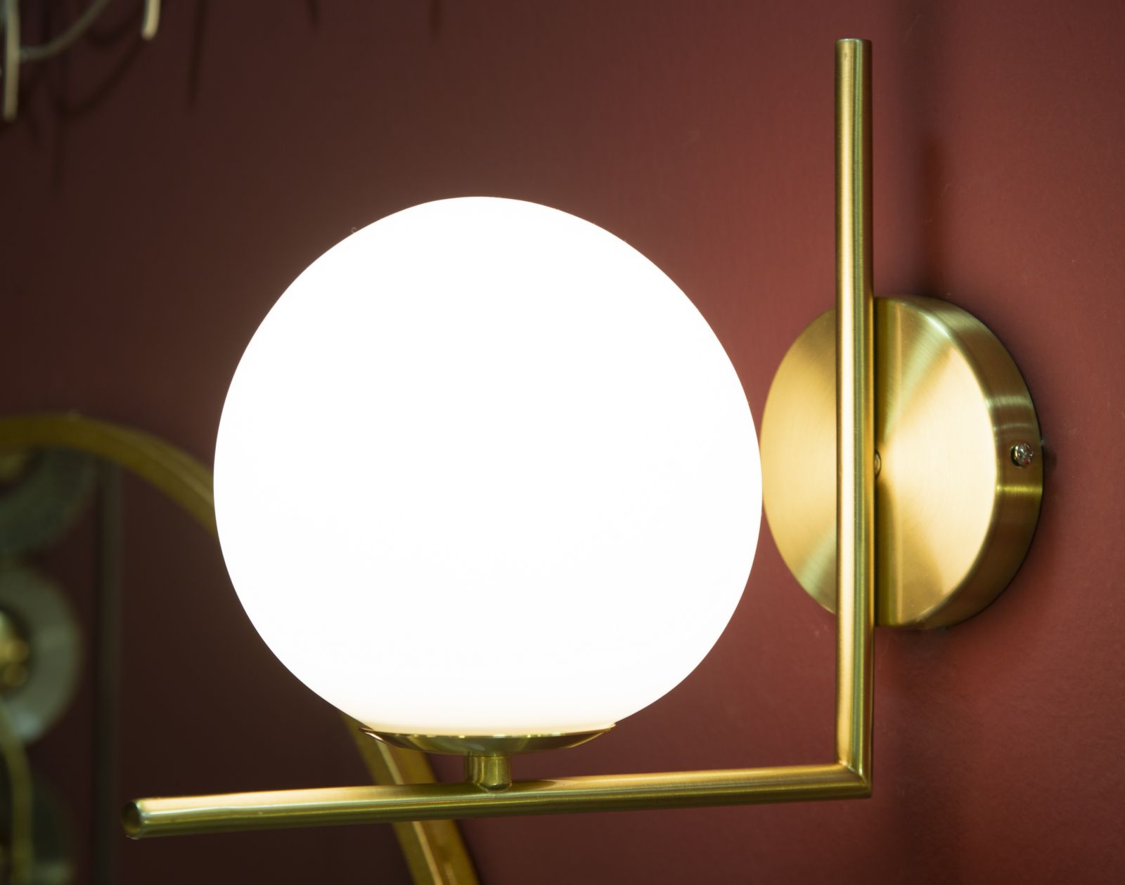 descrizione : GLAMIRON ANG GLASSWHITE/GOLDAPPLIQUE IN METALLO DORATO CON SFERA IN VETRO OPACO. LINEE ESSENZIALI E PULITE NE CARATTERIZZANO L’ELEGANZA. LAMPADE DA TERRA, DA TAVOLO, APPLIQUE E LAMPADARI! CON LE SUE SFERE E LE SUE FINITURE IN ORO LA LINEA GLAMY DONA UNA LUCE SOFFUSA E SICURAMENTE GLAM ALLE TUE STANZE!220 V50 HZ40 WATT MAXE141NO
