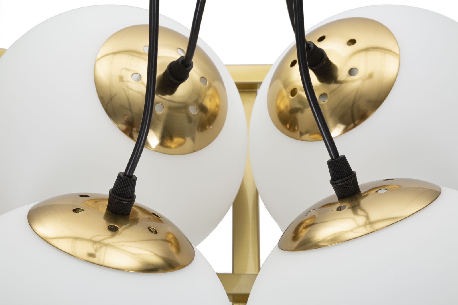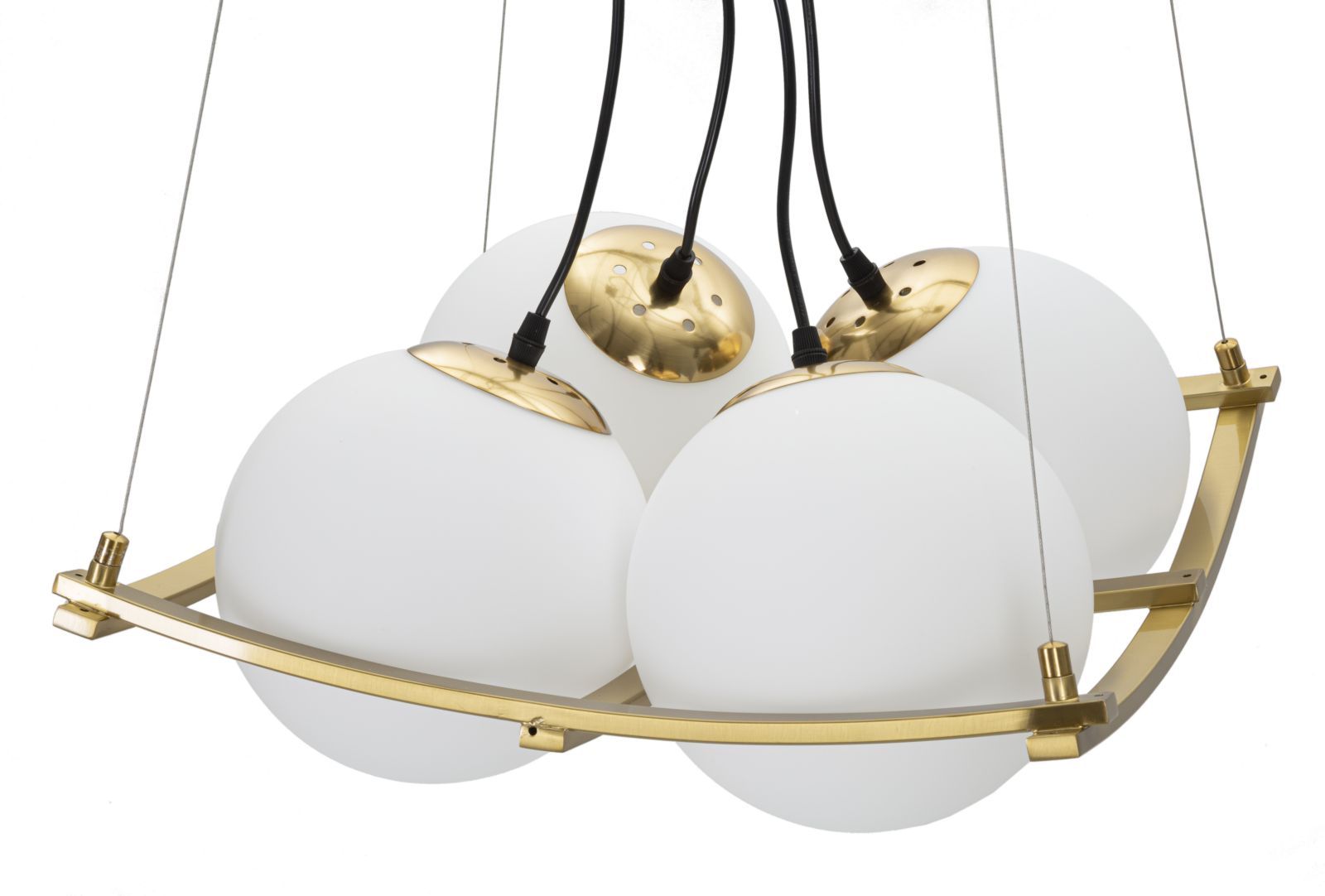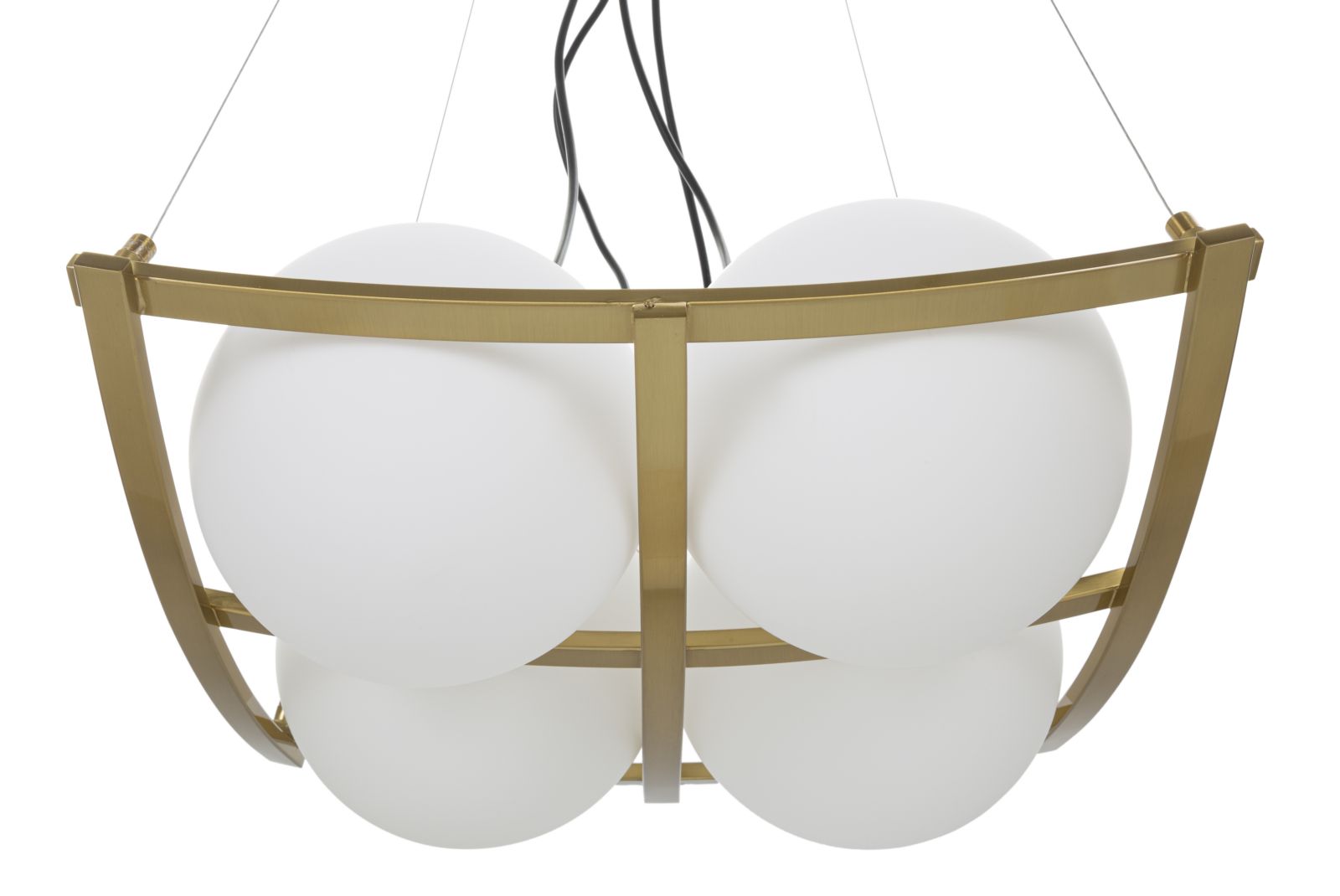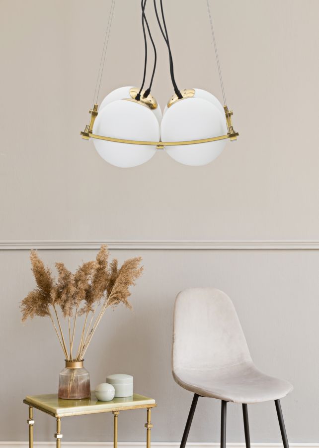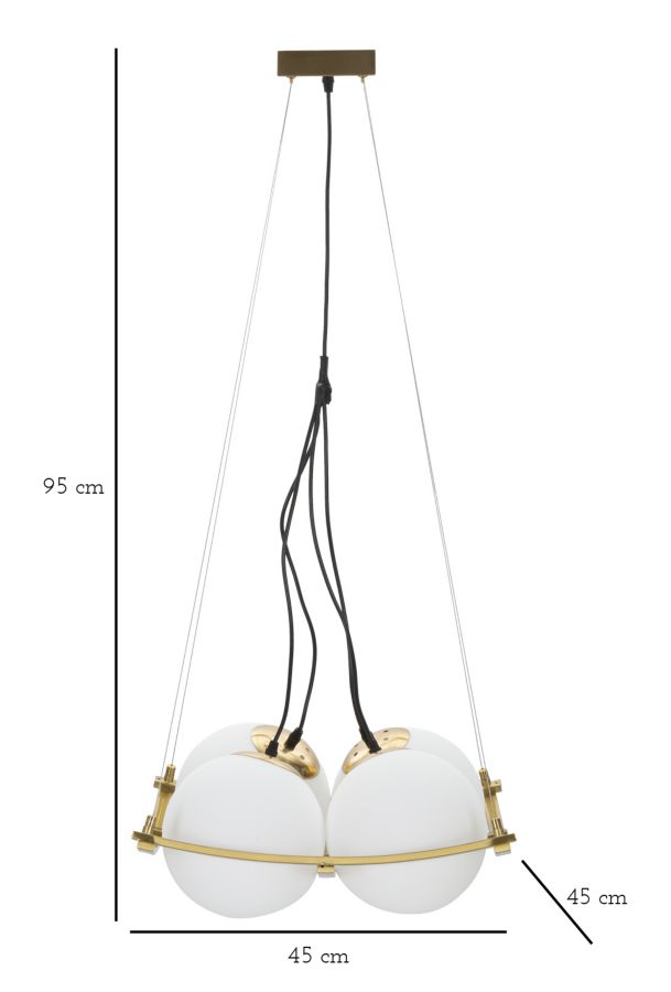descrizione : GLAMIRON AND GLASSGOLD AND WHITELAMPADARIO IN METALLO DORATO DALLE LINEE GEOMETRICHE CON 4 PUNTI LUCE IN ELEGANTI SFERE DI VETRO BIANCO.220V50HZ20 WATT MAX ESE274NOtotal lheight cm 95