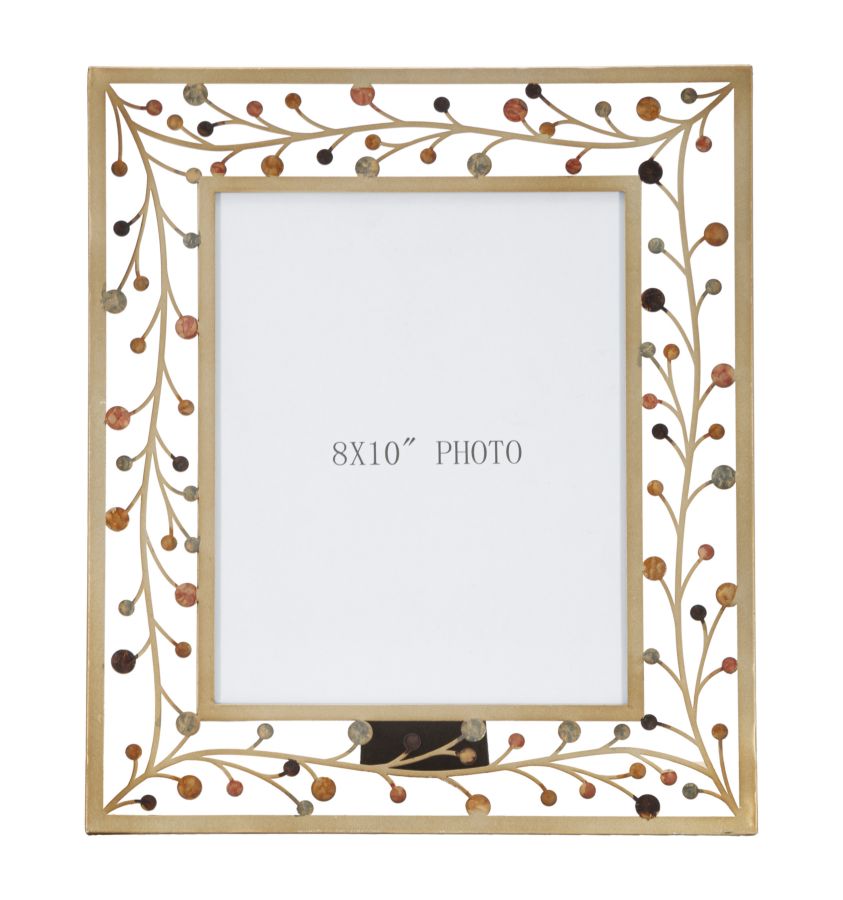 descrizione : GLAMIRON MULTICOLORPORTAFOTO IN METALLO CON CORNICE ELEGANTEMENTE DECORATA DA RAMOSCELLI IMPREZIOSITI DA DECORAZIONI COLORATE. FORMATO FOTO CM 20X25INSIDE SIZES CM 20X25