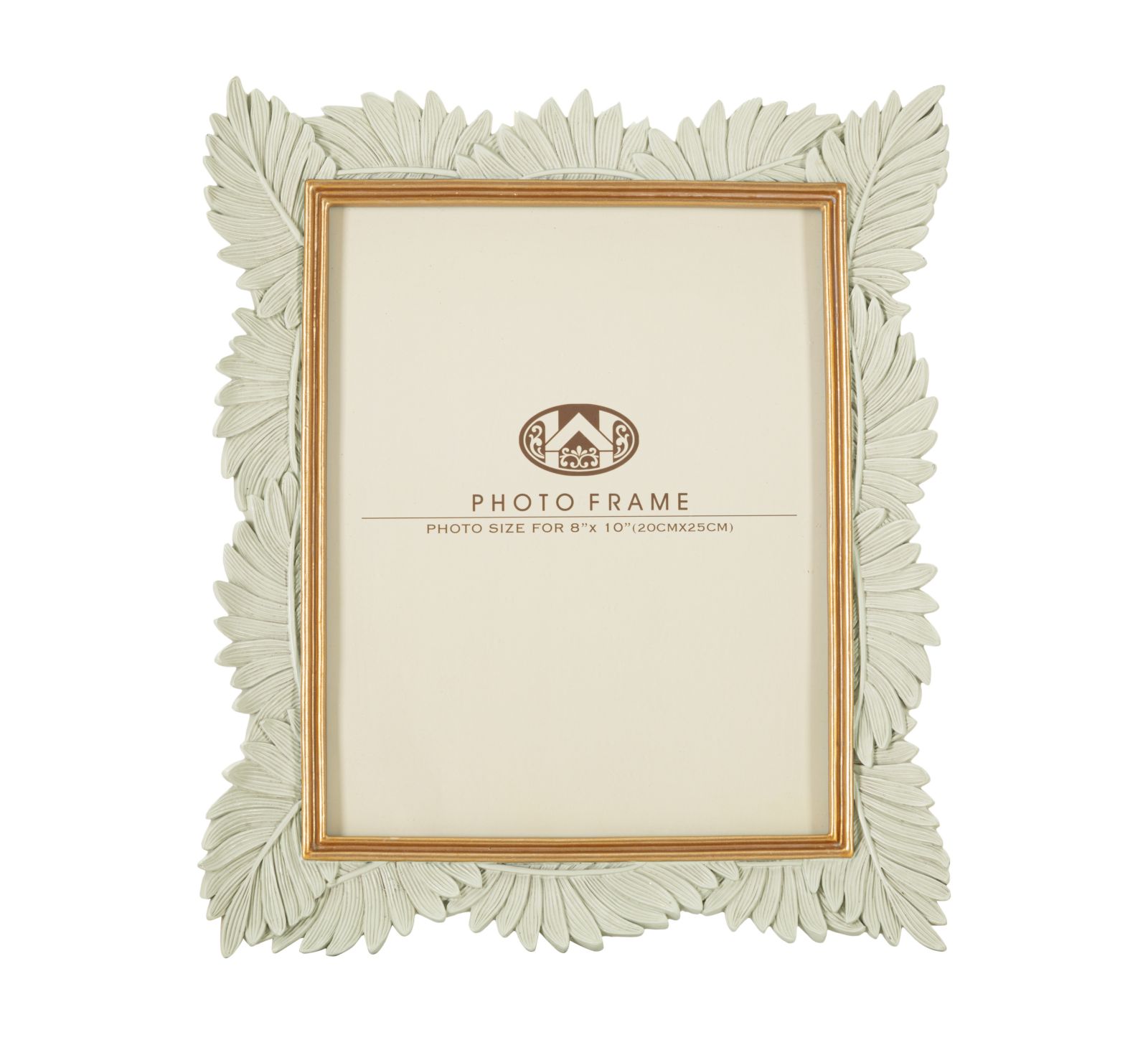 descrizione : GLAMPOLYRESIN AND GLASSCREAM/GOLDELEGANTE PORTAFOTO CON CORNICE DECORATA DA FOGLIE. FORMATO FOTO CM 20X25INSIDE SIZES CM 20X25