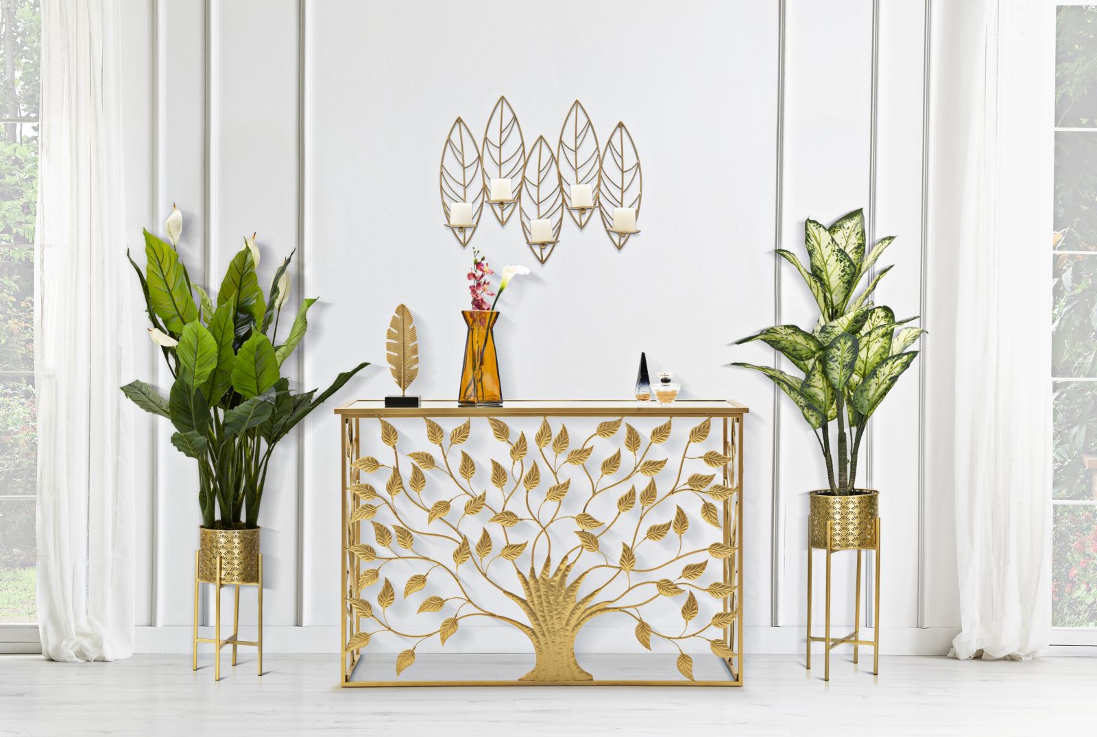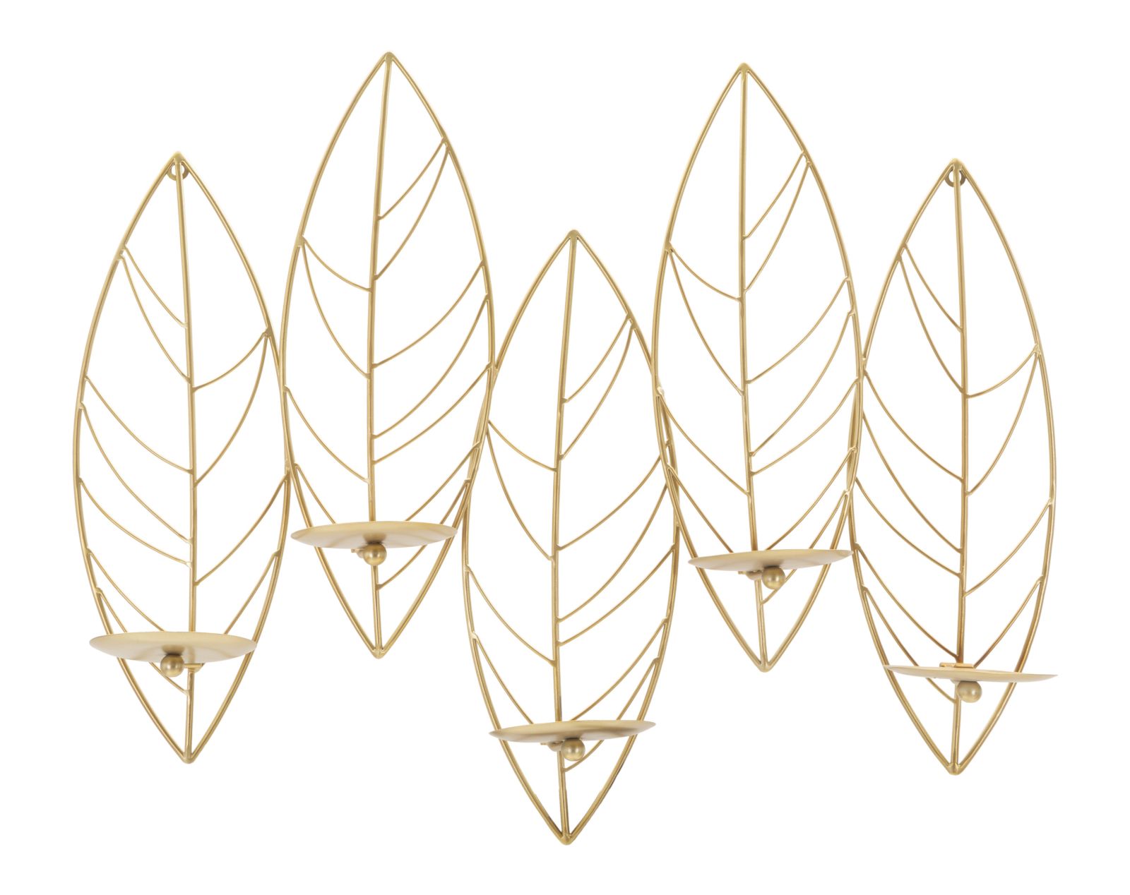 Confrontadescrizione : GLAMIRON GOLDPORTACANDELE DA PARETE IN METALLO DORATO DAL DESIGN CHE RICHIAMA UNA SERIE DI FOGLIE. PUÒ CONTENERE 5 CANDELE.