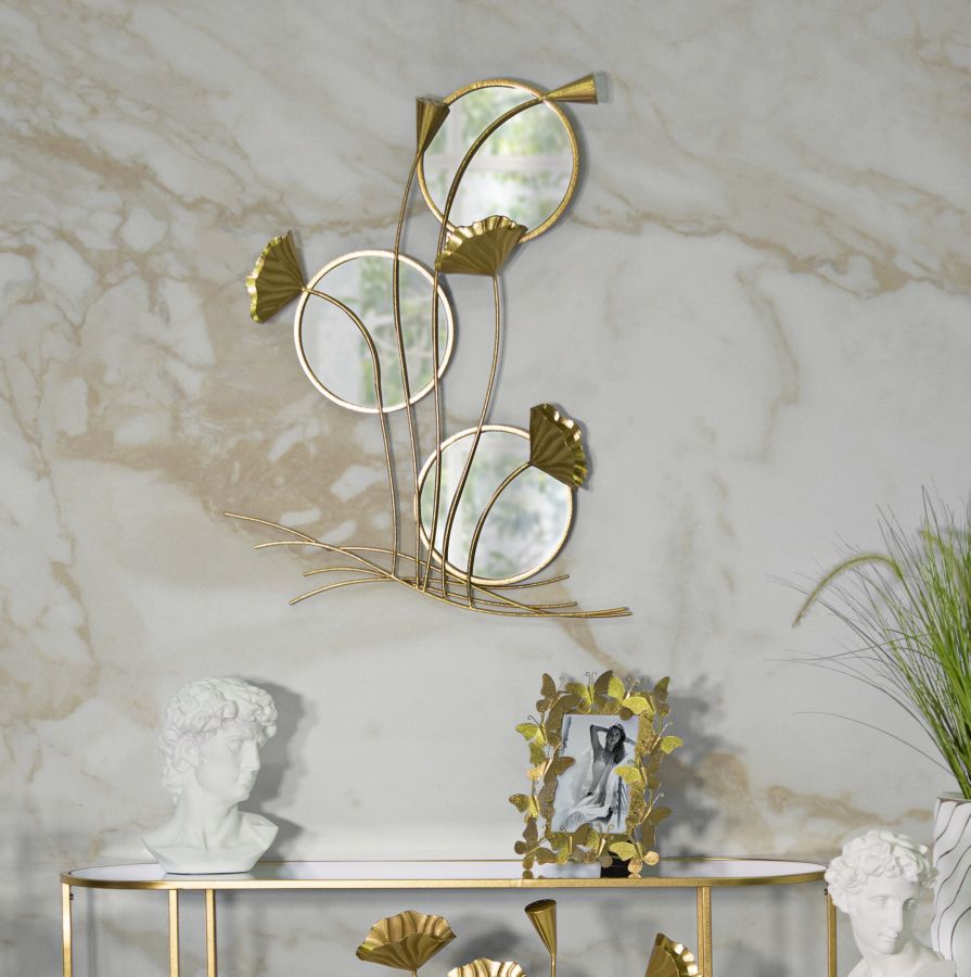 descrizione : GLAMIRON, MIRROR AND MDFGOLDCOMPOSIZIONE DI 3 SPECCHI ROTONDI DA PARETE CON CORNICE DORATA RACCORDATI DA DECORAZIONI COMPOSTE DA FOGLIE.inside mirror size cm Ø 23