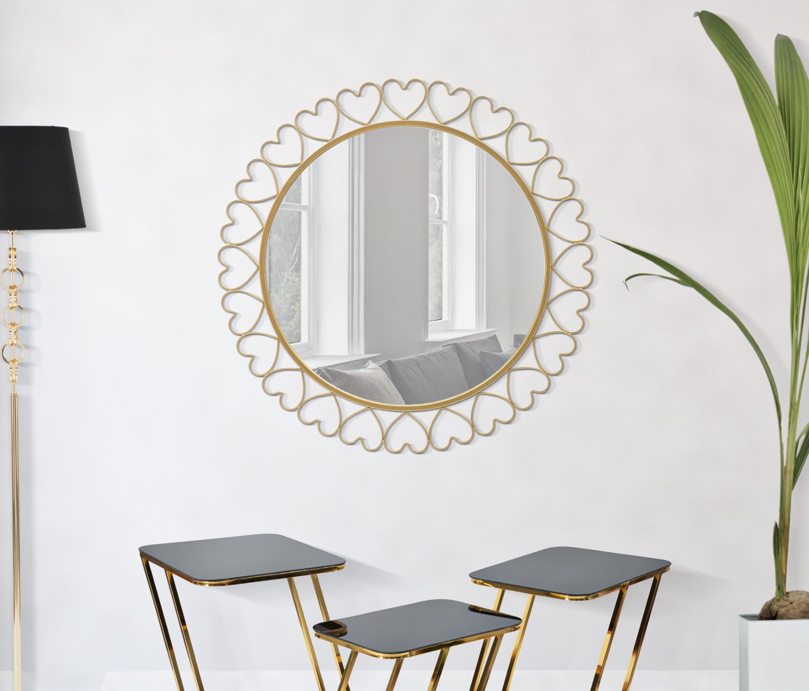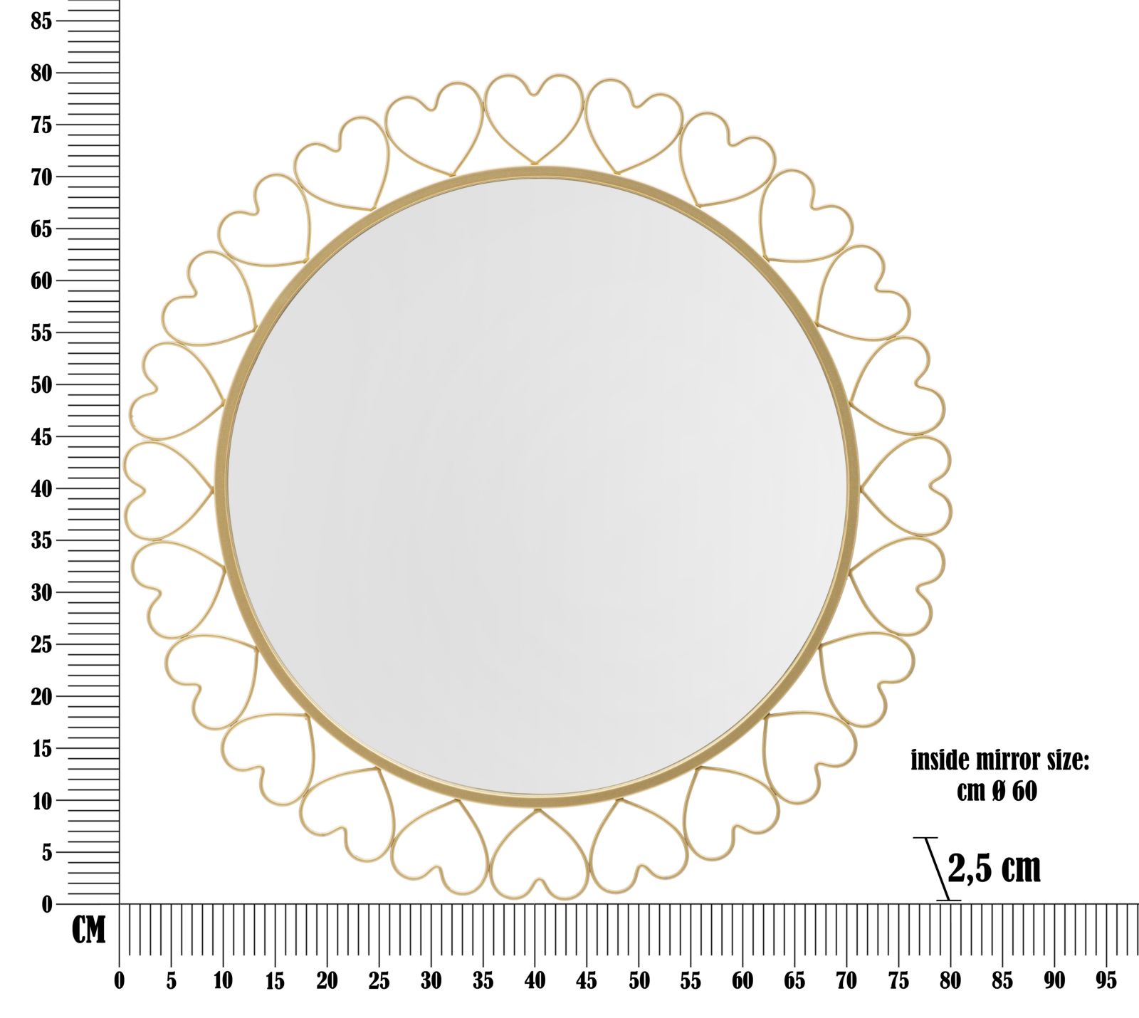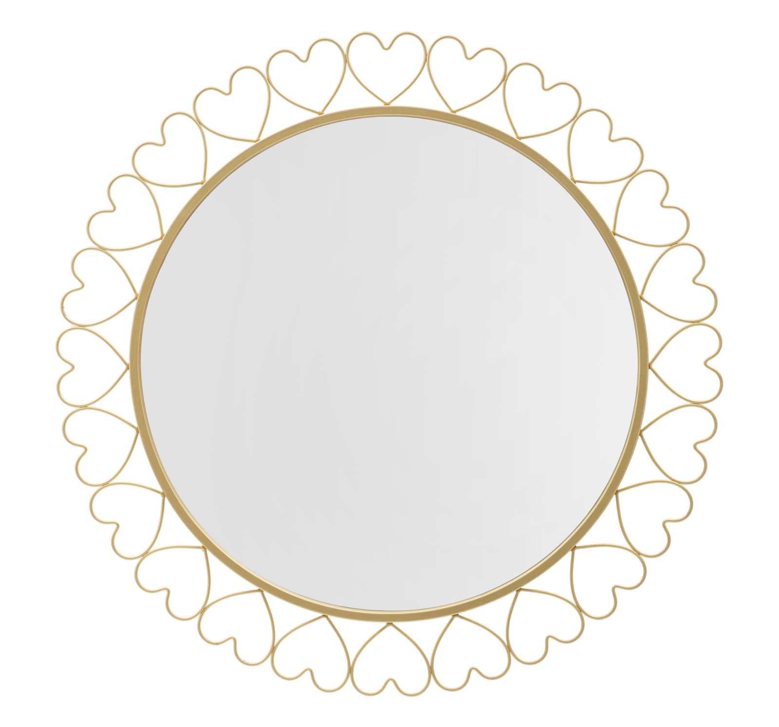 descrizione : GLAMIRON, MDF AND MIRRORGOLDSPECCHIO ROTONDO DA PARETE IN METALLO DORATO CON LA CORNICE COMPOSTA DA TENERI CUORICINI. UN TOCCO DI DELICATEZZA PER IMPREZIOSIRE OGNI AMBIENTE.*mirror size cm Ø 60