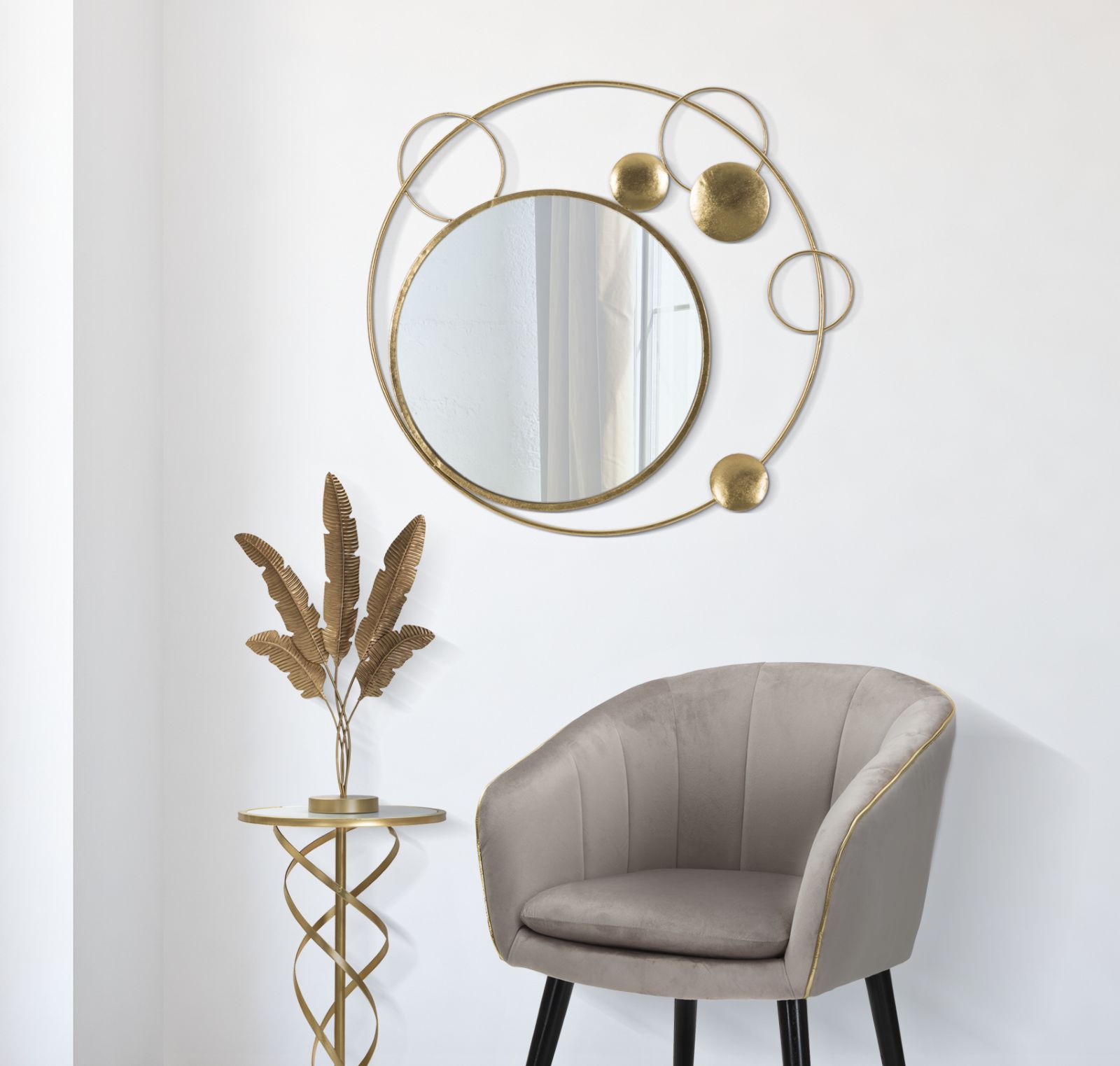 descrizione : GLAMIRON, MDF AND MIRRORGOLDSPECCHIO ROTONDO DA PARETE CON CORNICE IN METALLO DORATO. I SEMPLICI ED ESSENZIALI CERCHI SULLA CORNICE RIMANDANO AL SISTEMA SOLARE ED AL MOTO DEI PIANETI PER DONARE UN TOCCO UNIVERSALE AD OGNI AMBIENTE.inside mirror size cm 57