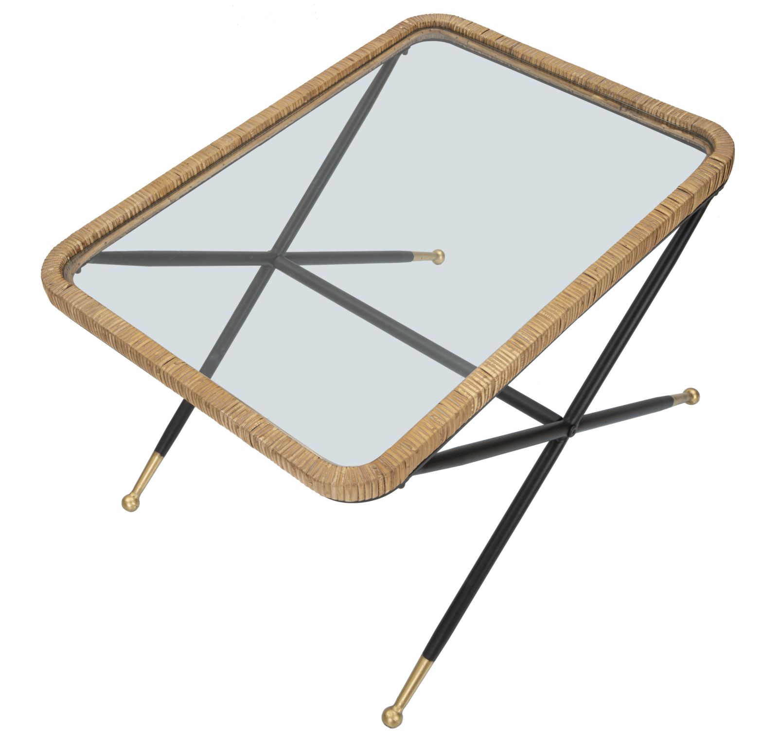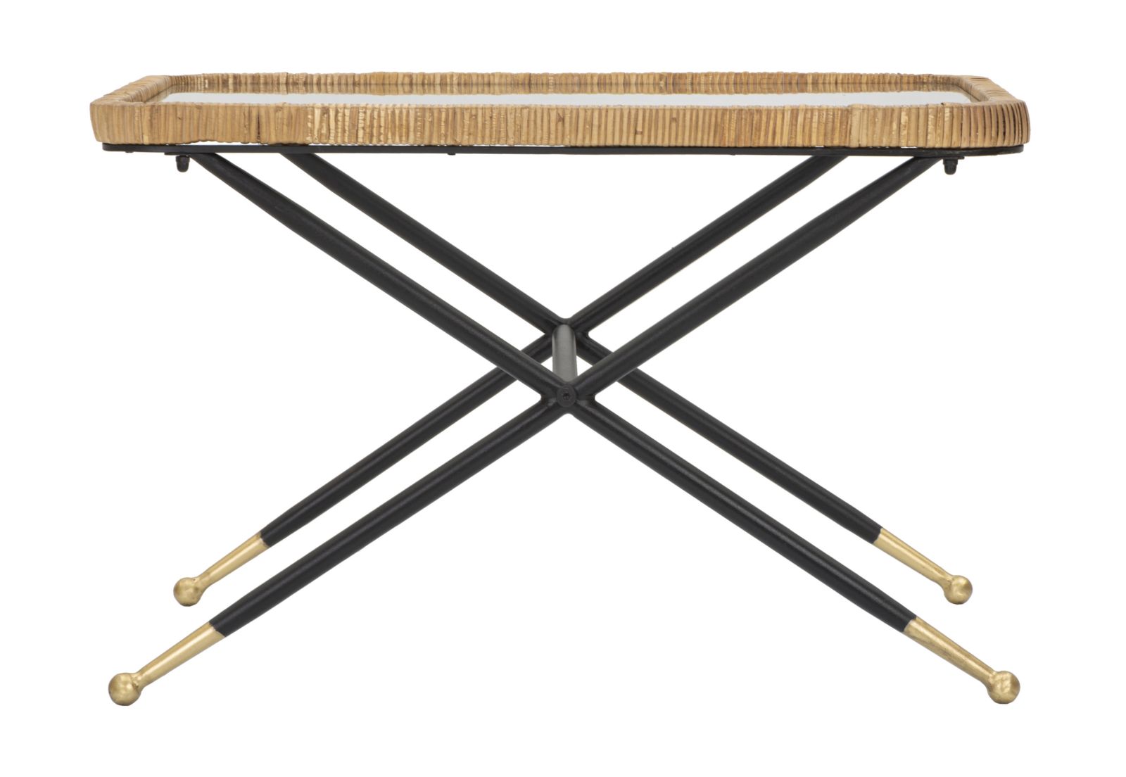 descrizione : BOHO CHICIRON, GLASS AND RATTANMULTICOLORTAVOLO DA CAFFÈ RETTANGOLARE CON STRUTTURA IN METALLO NERO E PIANO IN VETRO CON ANGOLI SMUSSATI INCORNICIATO IN UN INTRECCIO DI RATTAN. PARTICOLARE È LA FINITURA DELLE GAMBE CON LA PARTE INFERIORE DORATA. IL DESIGN SEMPLICE MA ACCATTIVANTE LO RENDE UN COMPLEMENTO PERFETTO PER OGNI TIPOLOGIA DI ARREDO.*glass cm 65X45