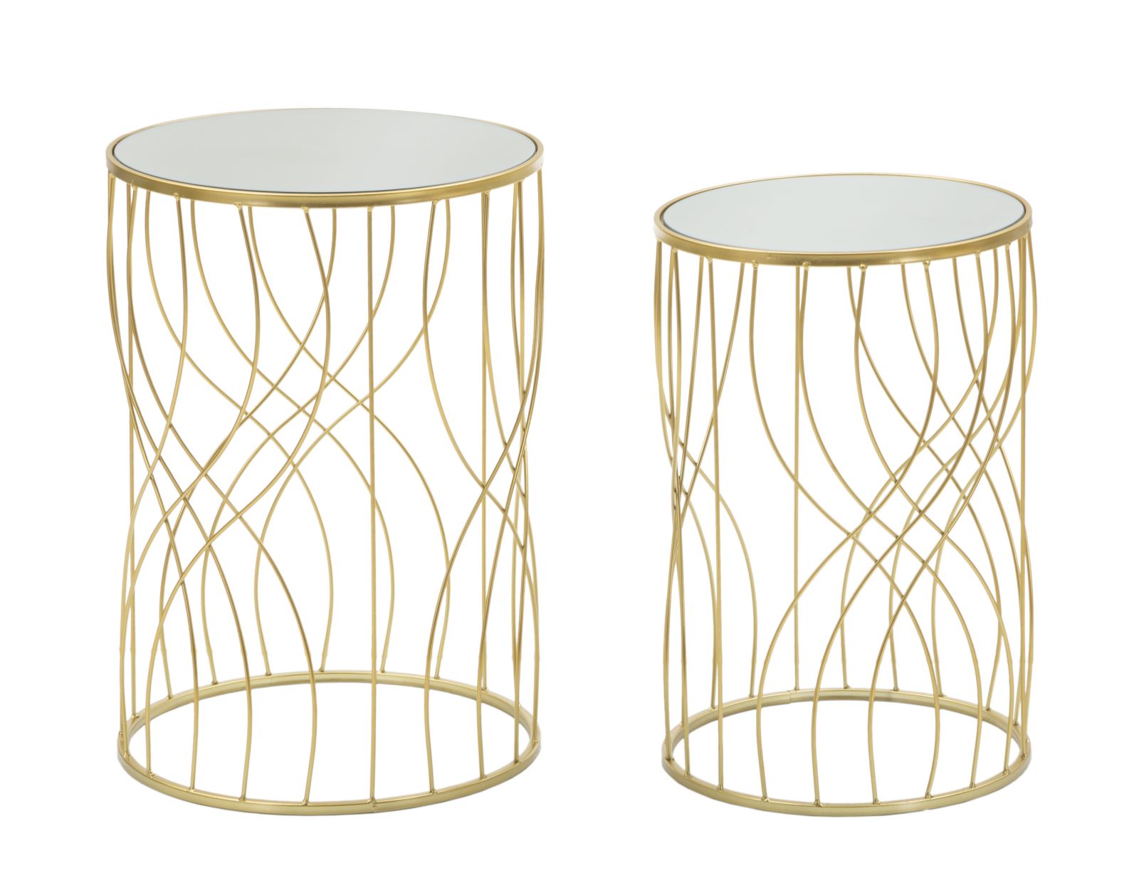 descrizione : GLAMIRON, MDF AND MIRRORGOLDCOPPIA DI TAVOLINETTI ROTONDI IN METALLO DORATO CON PIANO IN VETRO A SPECCHIO. LA PARTICOLARE ED ELEGANTE DECORAZIONE LINEARE E GEOMETRICA DONA UN TOCCO DI UNICITÀ ALL’ARTICOLO.