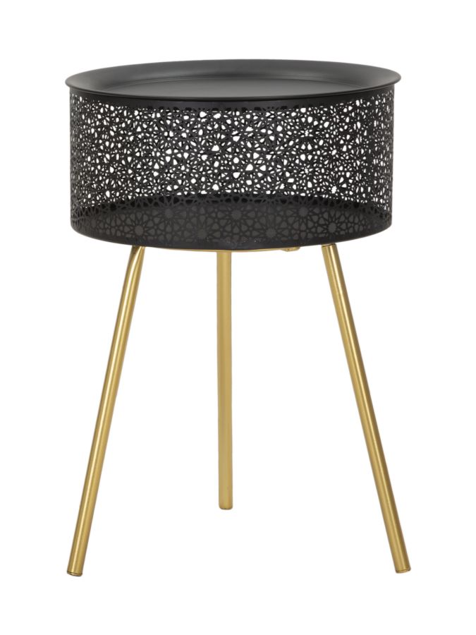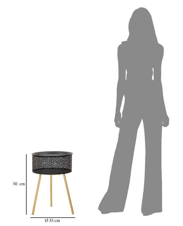 descrizione : GLAMIRONGOLD AND BLACKTAVOLINETTO ROTONDO IN METALLO NERO CON GAMBE DORATE. LA PARTE SUPERIORE È FINEMENTE INTAGLIATA PER DONARE UN TOCCO DI ELEGANZA. IL TOP È REMOVIBILE, ALL’INTERNO È PRESENTE UN PRATICO CONTENITORE.*basked inside sizes cm Ø 33×15