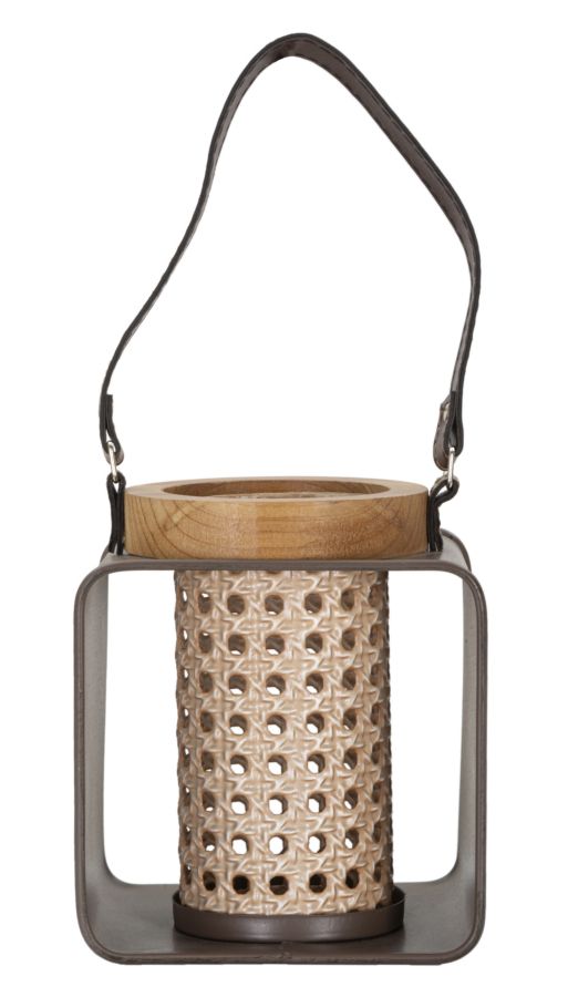 descrizione : BOHO CHICFIR WOOD, IRON AND PUMULTICOLORLANTERNA IN METALLO E LEGNO CON INTAGLI DAL DESIGN CHE RICHIAMA L’800.*total height with handle cm 38 *inside candle holder size cm Ø 8×18