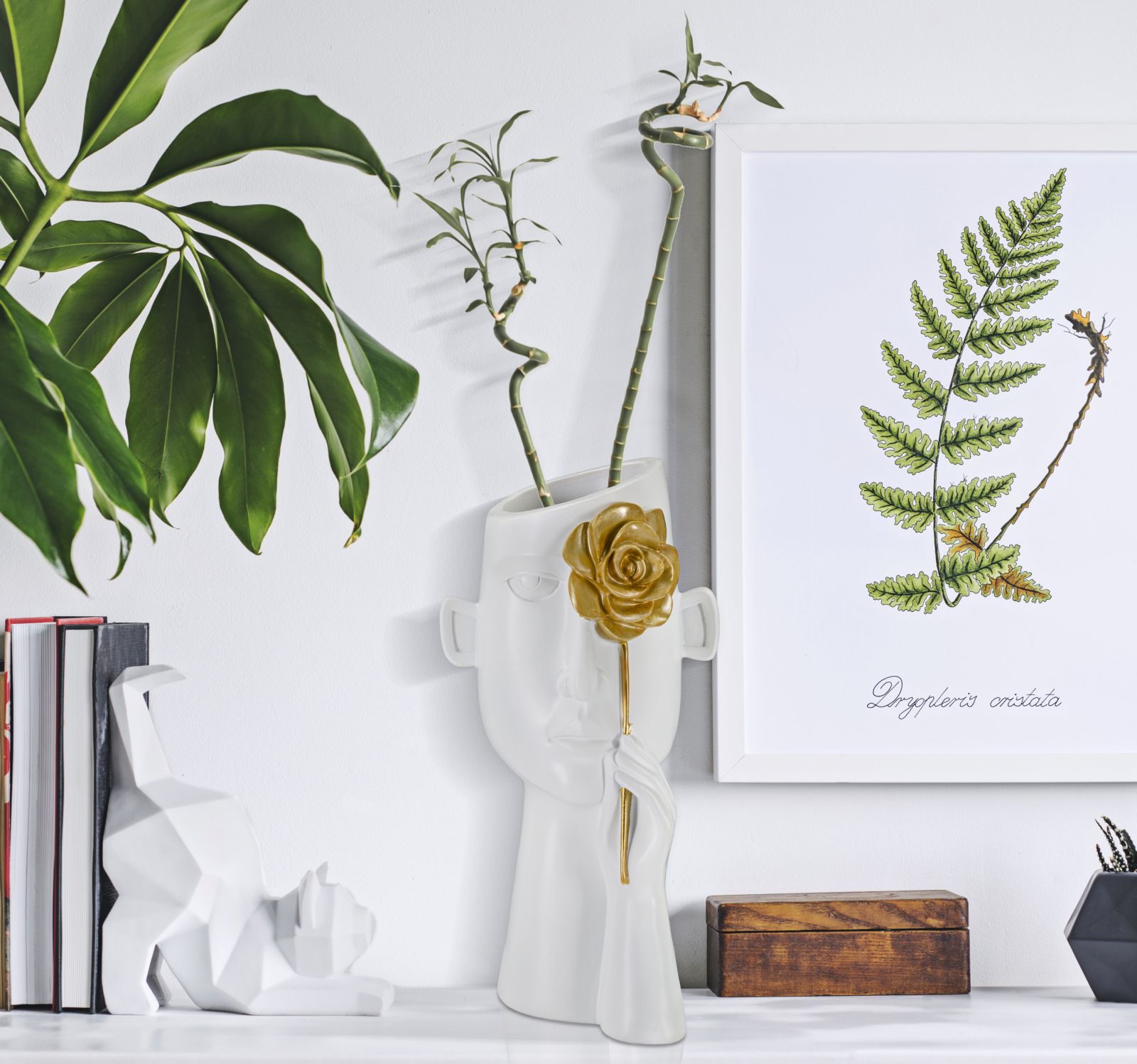 Confrontadescrizione : GLAMPOLYSTERWHITE/GOLDELEGANTE VASO A FORMA DI FACCIA DALLE LINEE CHE RICORDANO IL CUBISMO, IMPREZIOSITO DA UN FIORE DORATO