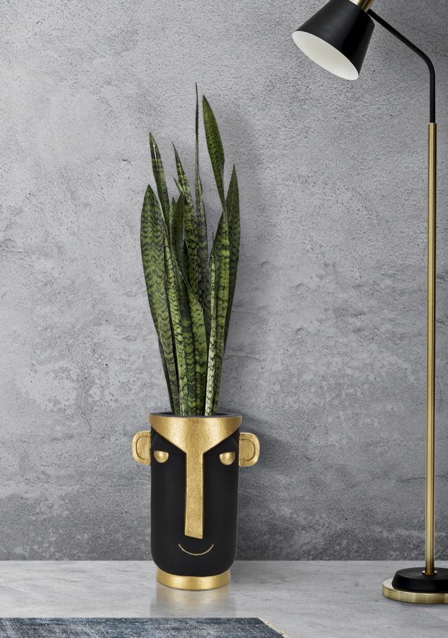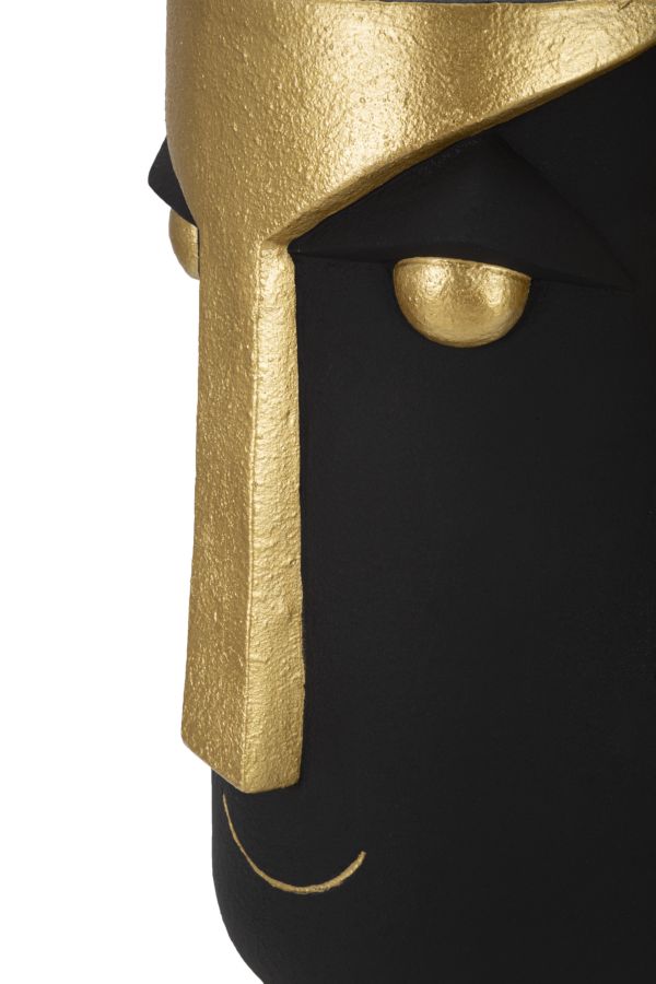 descrizione : GLAMPOLYRESINBLACK AND GOLDVASO RAFFIGURANTE UN VOLTO STILIZZATO CON ELEGANTI TRATTI DORATI ISPIRATO ALLE TRIBÙ PRIMITIVE.VASE HOLE CM Ø 17