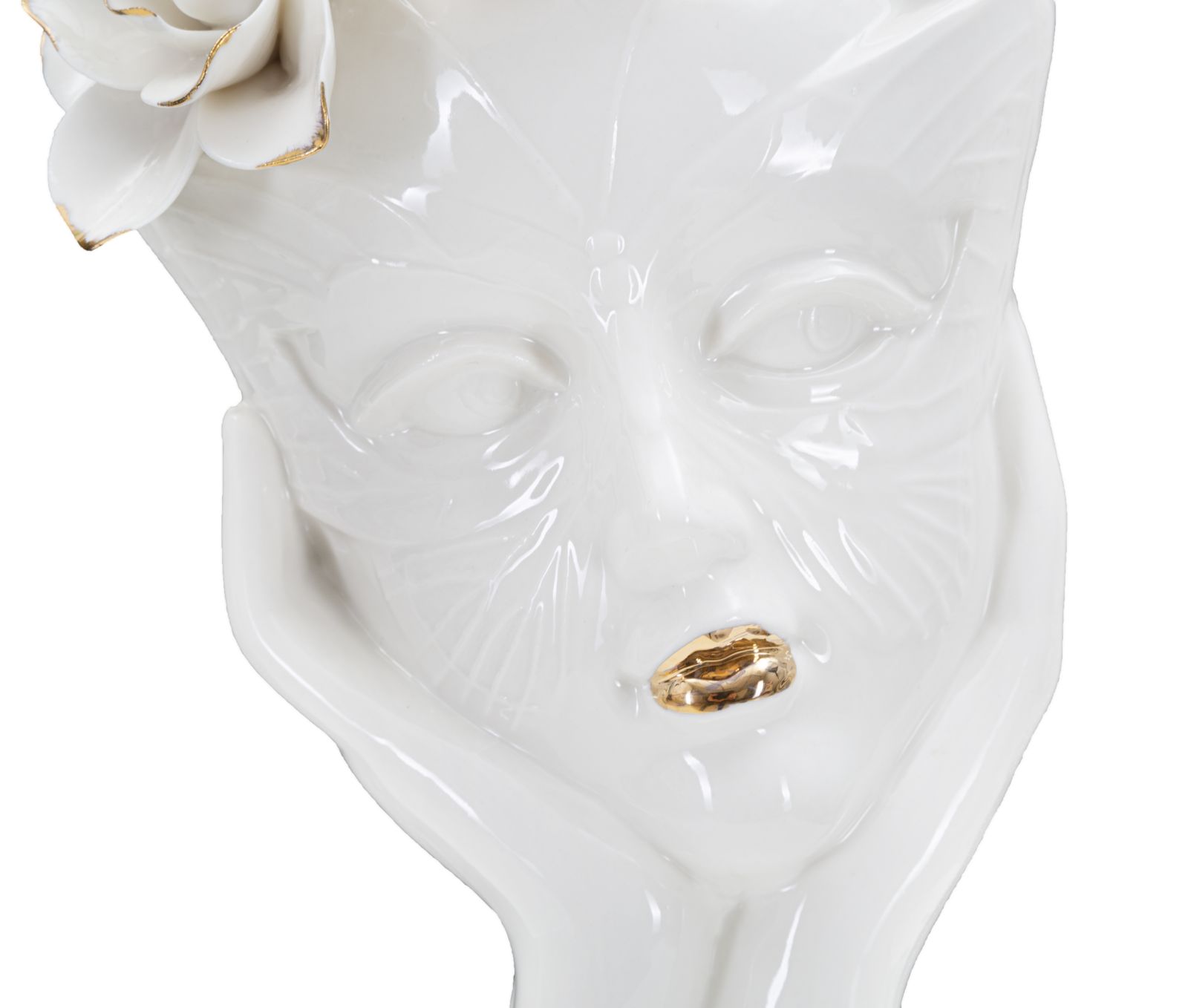 descrizione : GLAMPORCELAINWHITE AND GOLDVASO A FORMA DI VOLTO DI DONNA CON UNA CORONA DI FIORI E CON UNA MASCHERA CHE RICHIAMA IL CARNEVALE VENEZIANO. LE DECORAZIONI DORATE DONANO UN TOCCO DI LUCENTEZZA E CLASSE.