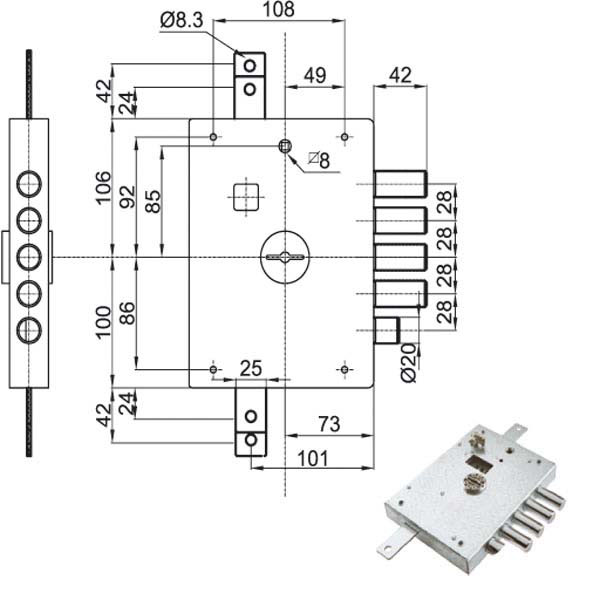 Serratura doppia mappa a planare 2 chiusure verticali Catenacci laterali 4 pistoni e scrocco Scrocco azionato da maniglia quadro mm 8 e chiave Misurascatola mm 206x152x30 – Entrata mm 73 3 chiavi