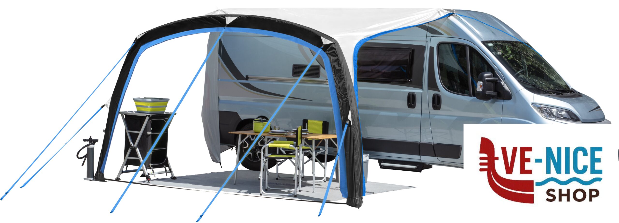 The Skia is very easy to assemble thanks to its pneumatic structure consisting of a front support pole and a roof stabilisation pole. It is connected to the vehicle by means of a pre-stitched awning pipe. With a modern and attractive design, this awning is manufactured from the special Polycotton fabric, a PU-coated polycotton that guarantees excellent UV resistance, excellent breathability and a long service life. All seams are taped to ensure a waterproof interior.