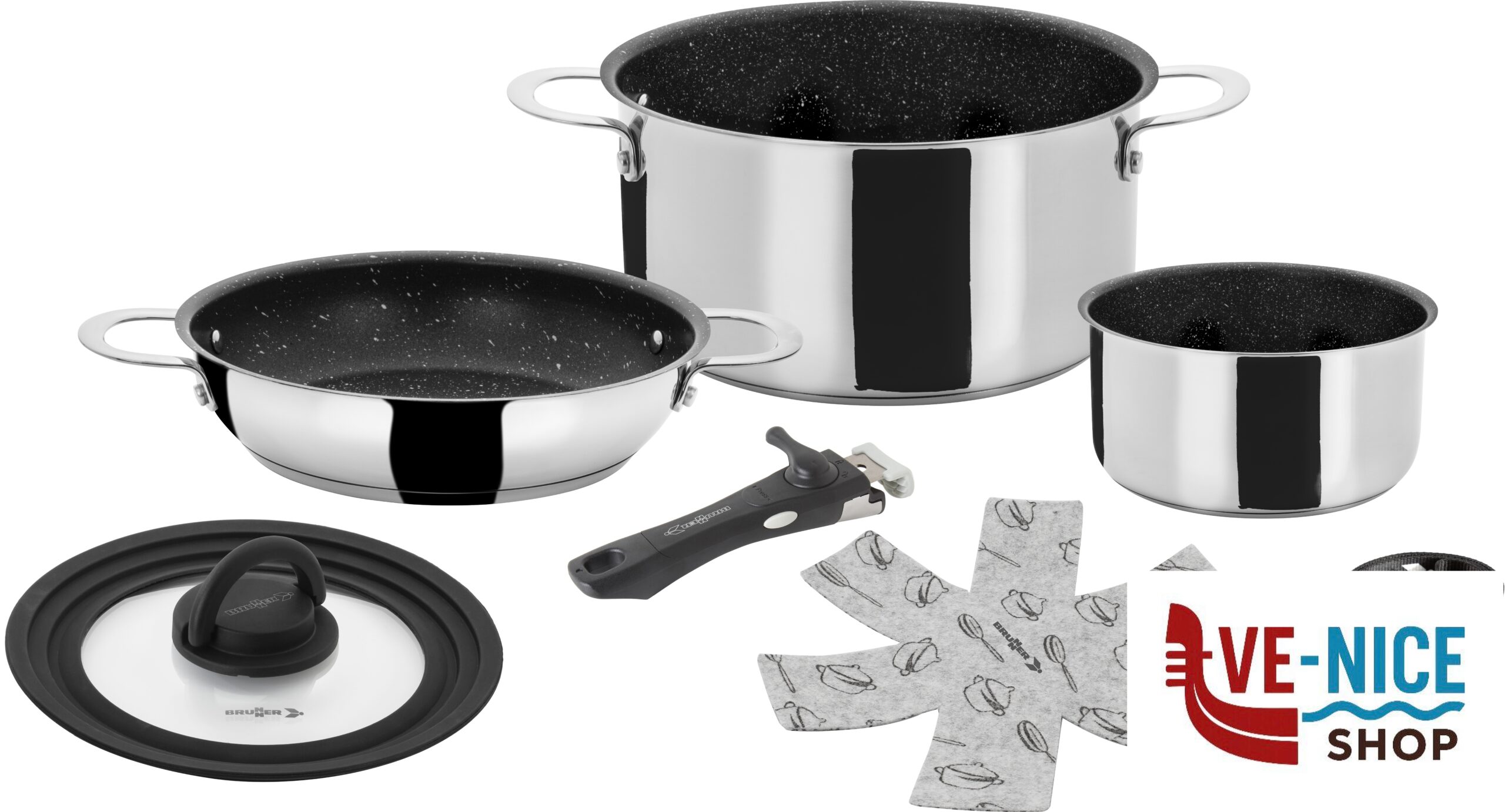 Casseruola media~Ø 16 cm – 1,4 l!!!Cinghia~1X!!!Coperchio medio~Ø 20 / 18 / 16 cm!!!Padella con manici~Ø 20 cm!!!Pentola grande~Ø 20 cm – 3,4 l!!!Peso~3,15 kg!!!Pinza staccabile~1X
