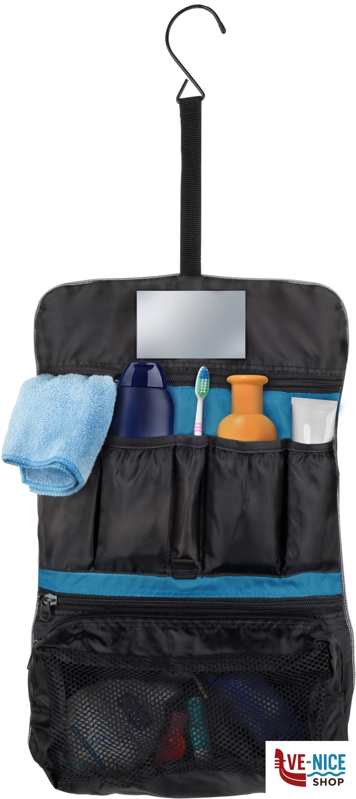 Wash bag with small internal mirror. Metal hook. Many inner buckets. Buckle locking.