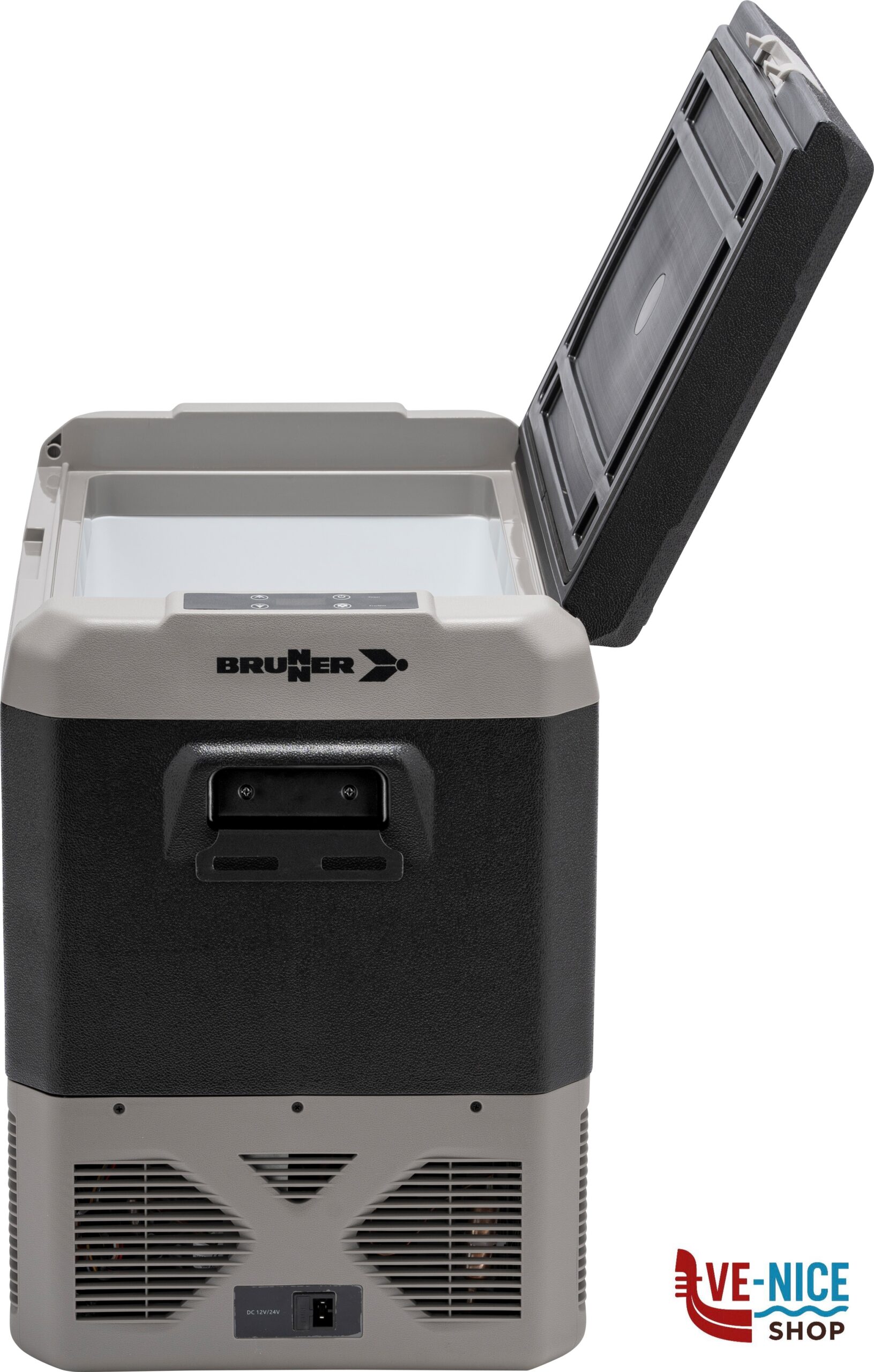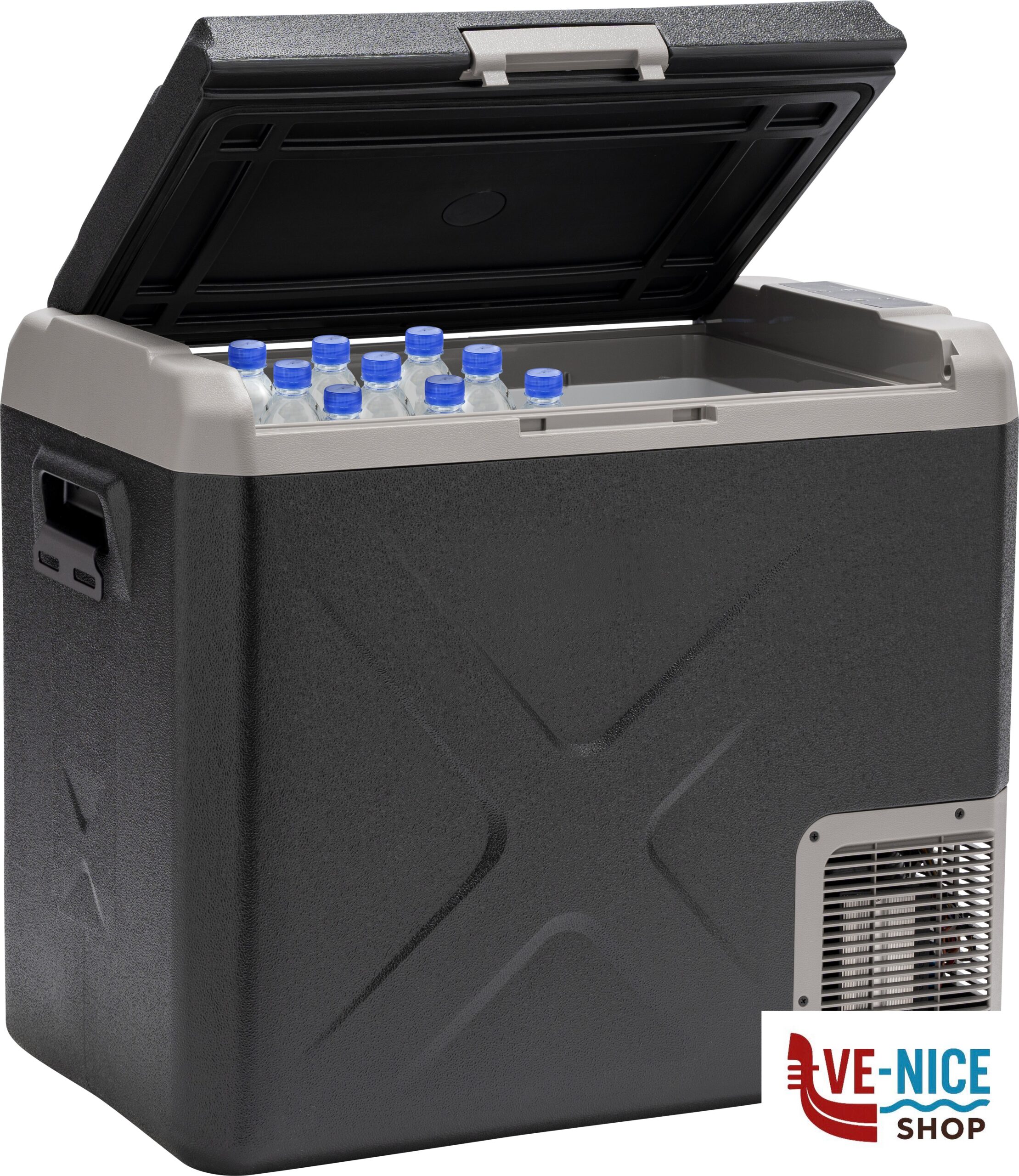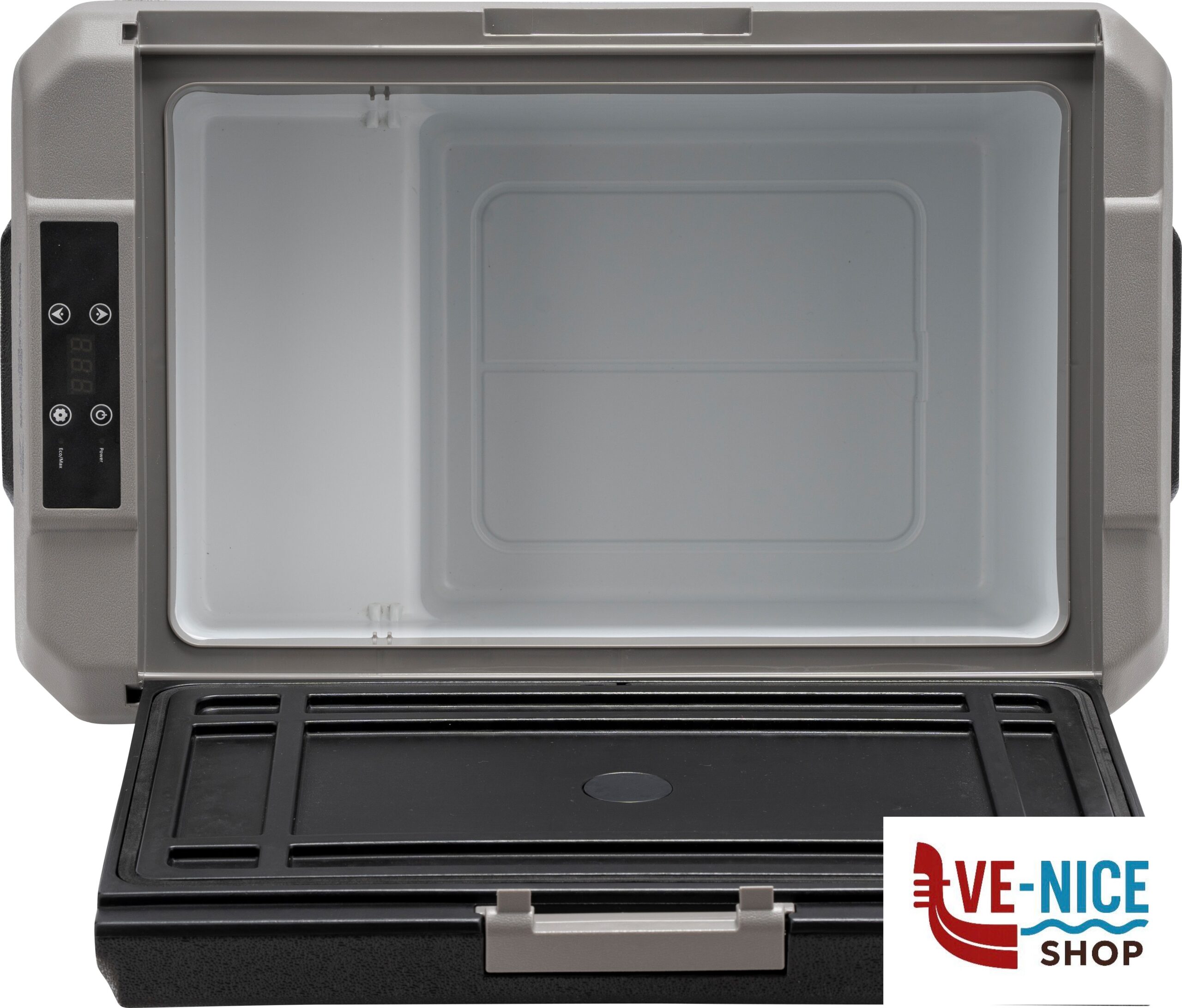 Frigo/congelatore portatile a compressore con scomparto unico dal design moderno e compatto. Dotato di resistente corpo in materiale plastico antiurto ad alta capacità isolante ed un display digitale per il controllo della temperatura.