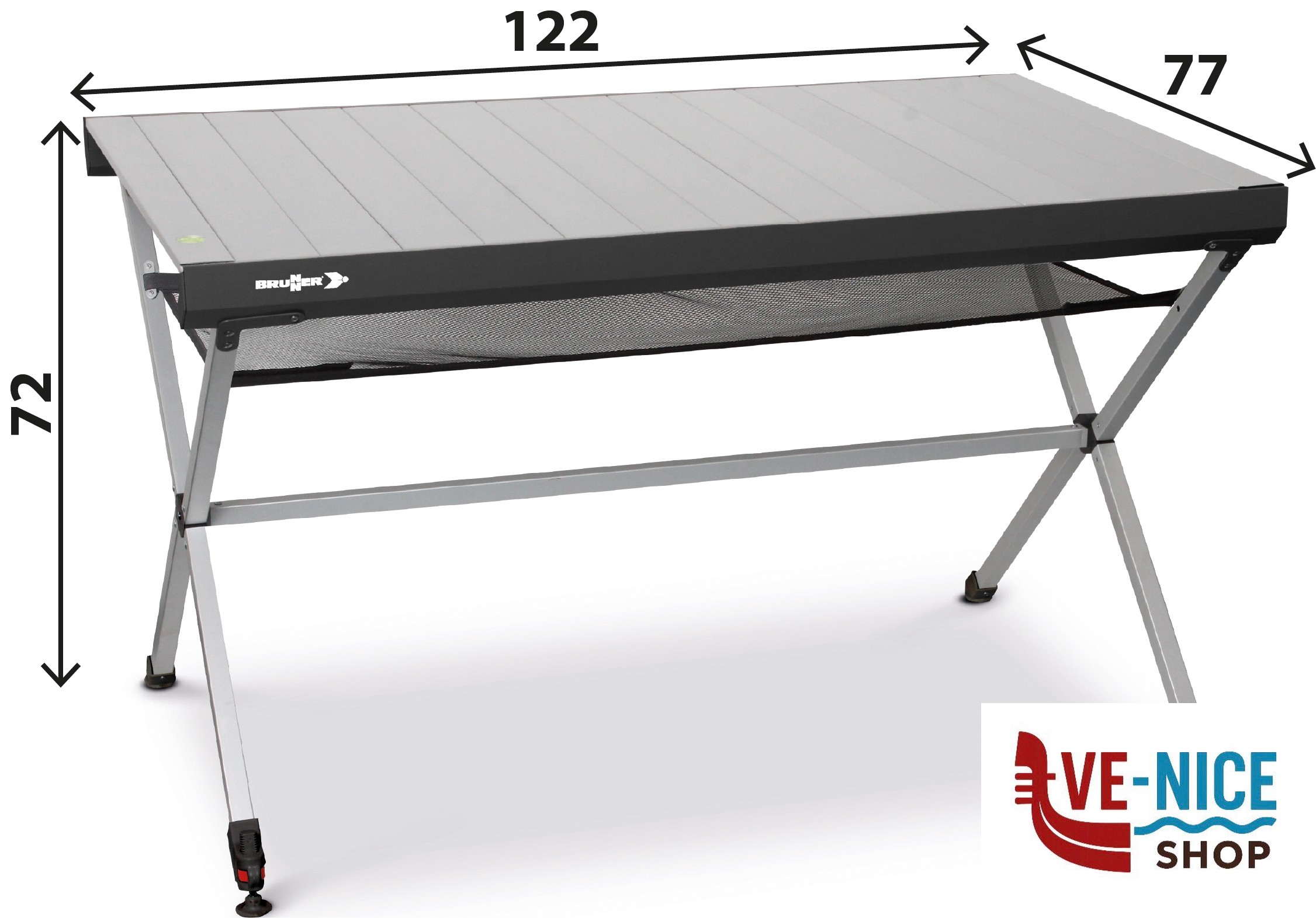 Tavolo in alluminio brevettato con ripiano arrotolabile e speciale telaio pieghevole di facile montaggio.
