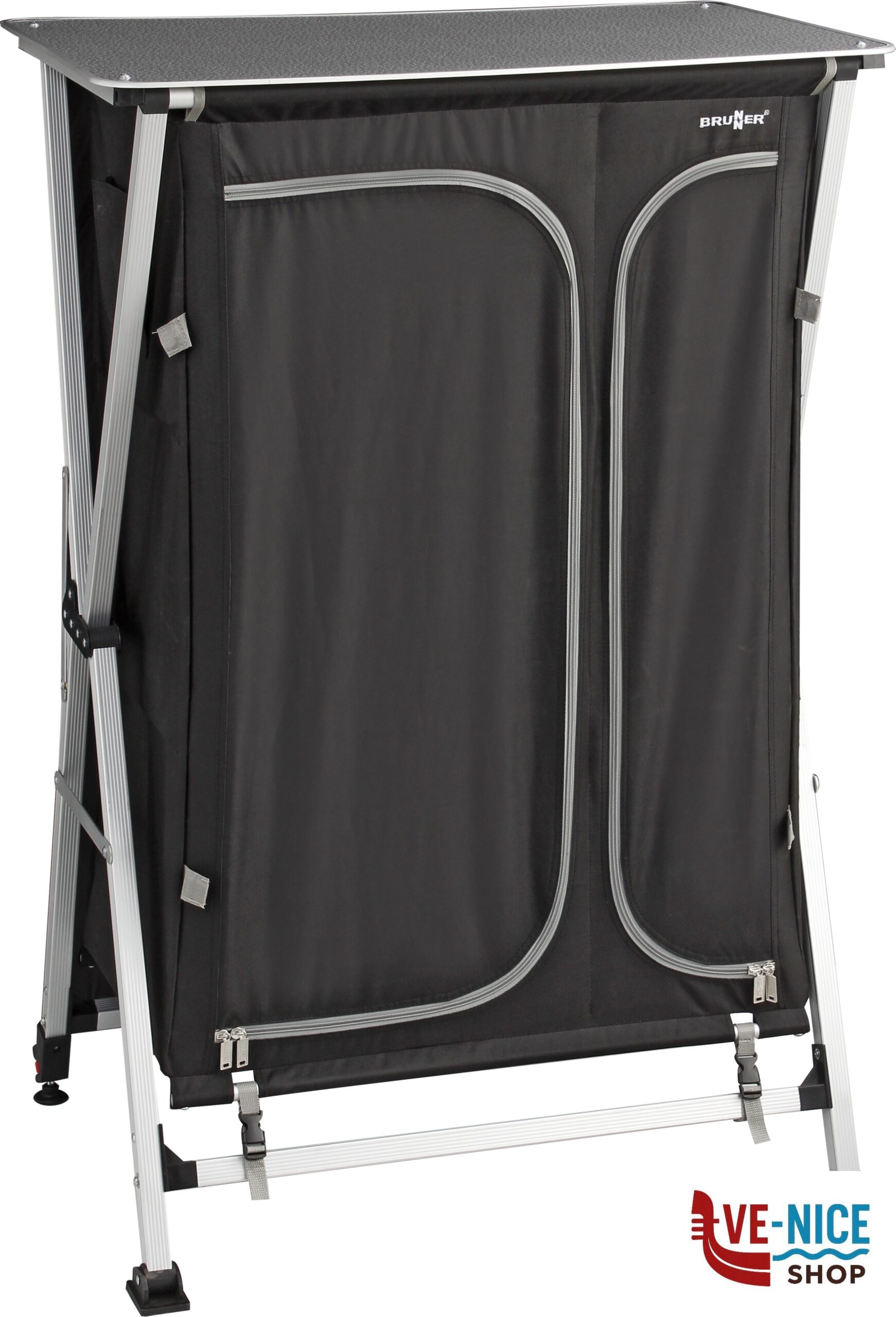 Struttura molto robusta con telaio trasversale in alluminio e profili rettangolari resistenti alla torsione. Le pareti anteriori e posteriori possono essere ulteriormente tese e stabilizzate da uno speciale dispositivo di tensionamento. Piastre di appoggio larghe e inclinabili impediscono che l’armadio sprofondi in un terreno soffice o prevengono possibili danni al pavimento della tenda o alla moquette. Il piedino regolabile in altezza consente una perfetta compensazione del livello su terreni irregolari. Una finestra in zanzariera nella parete posteriore fornisce la ventilazione interna all’armadio.