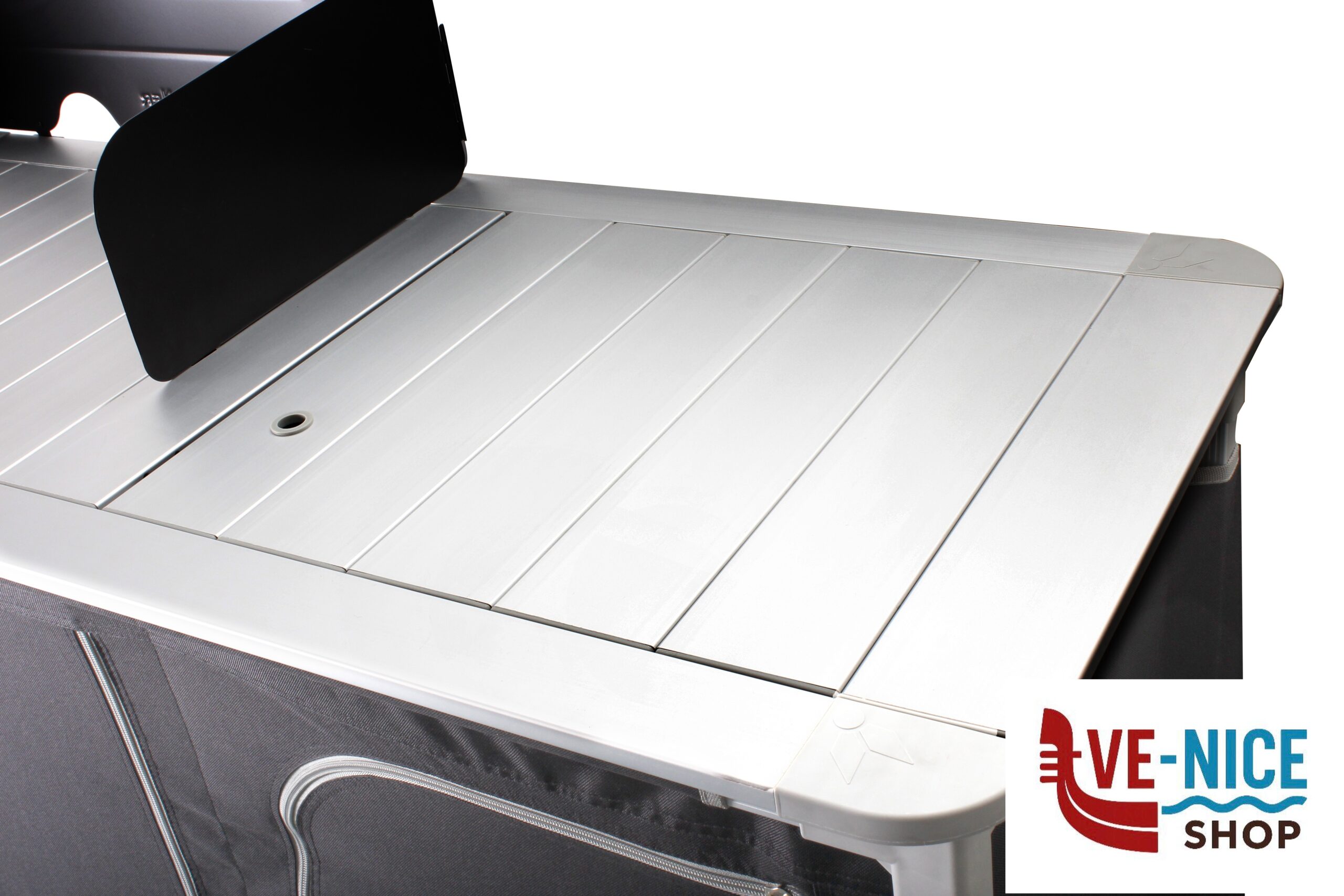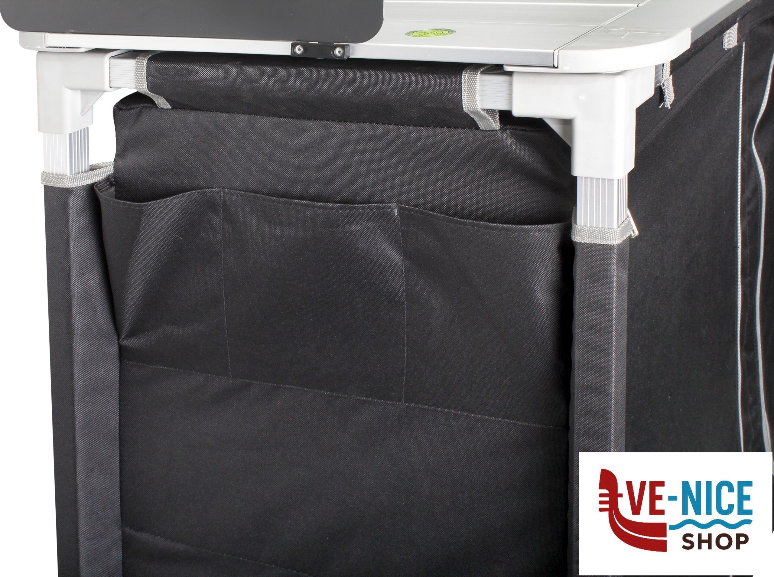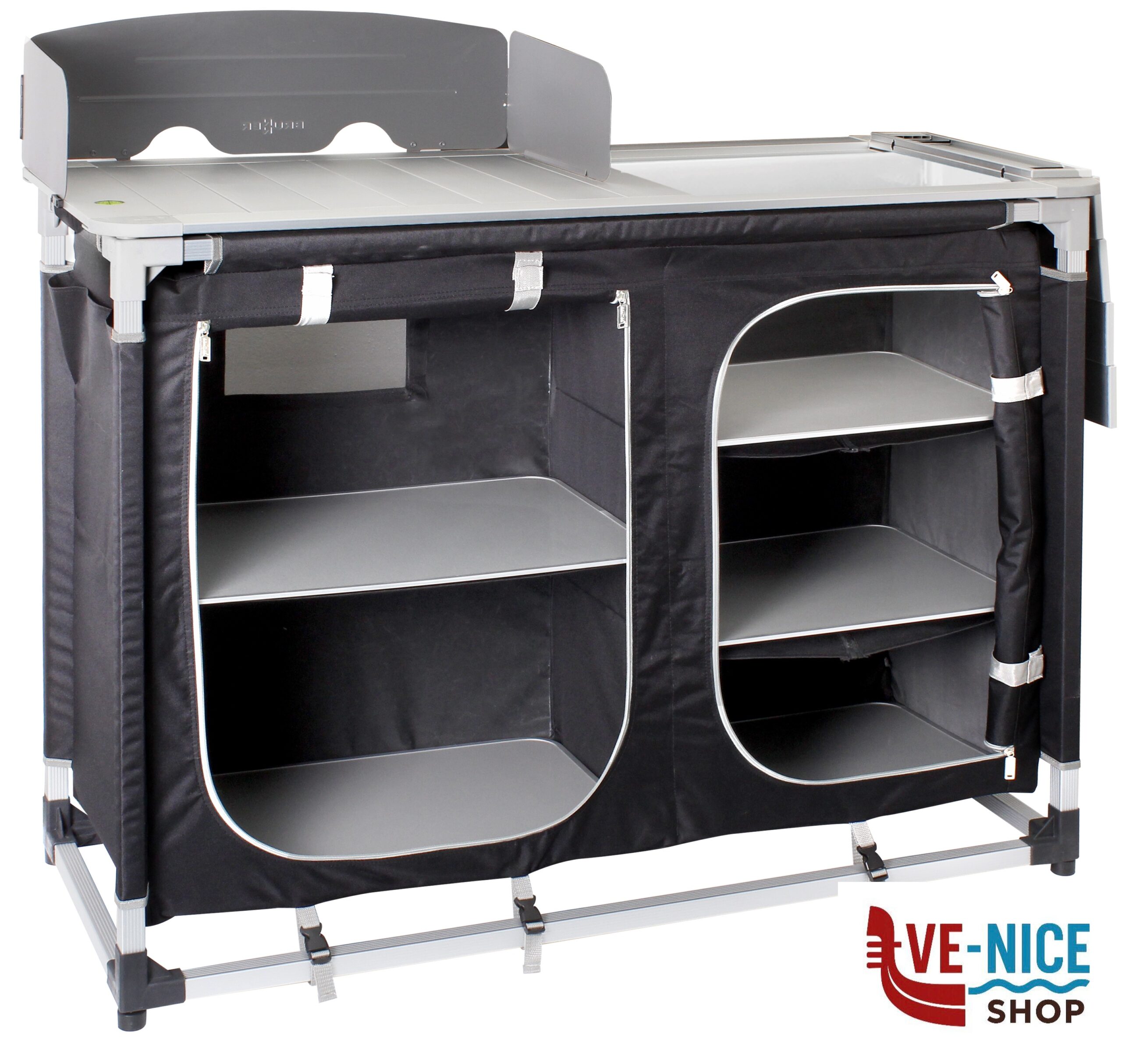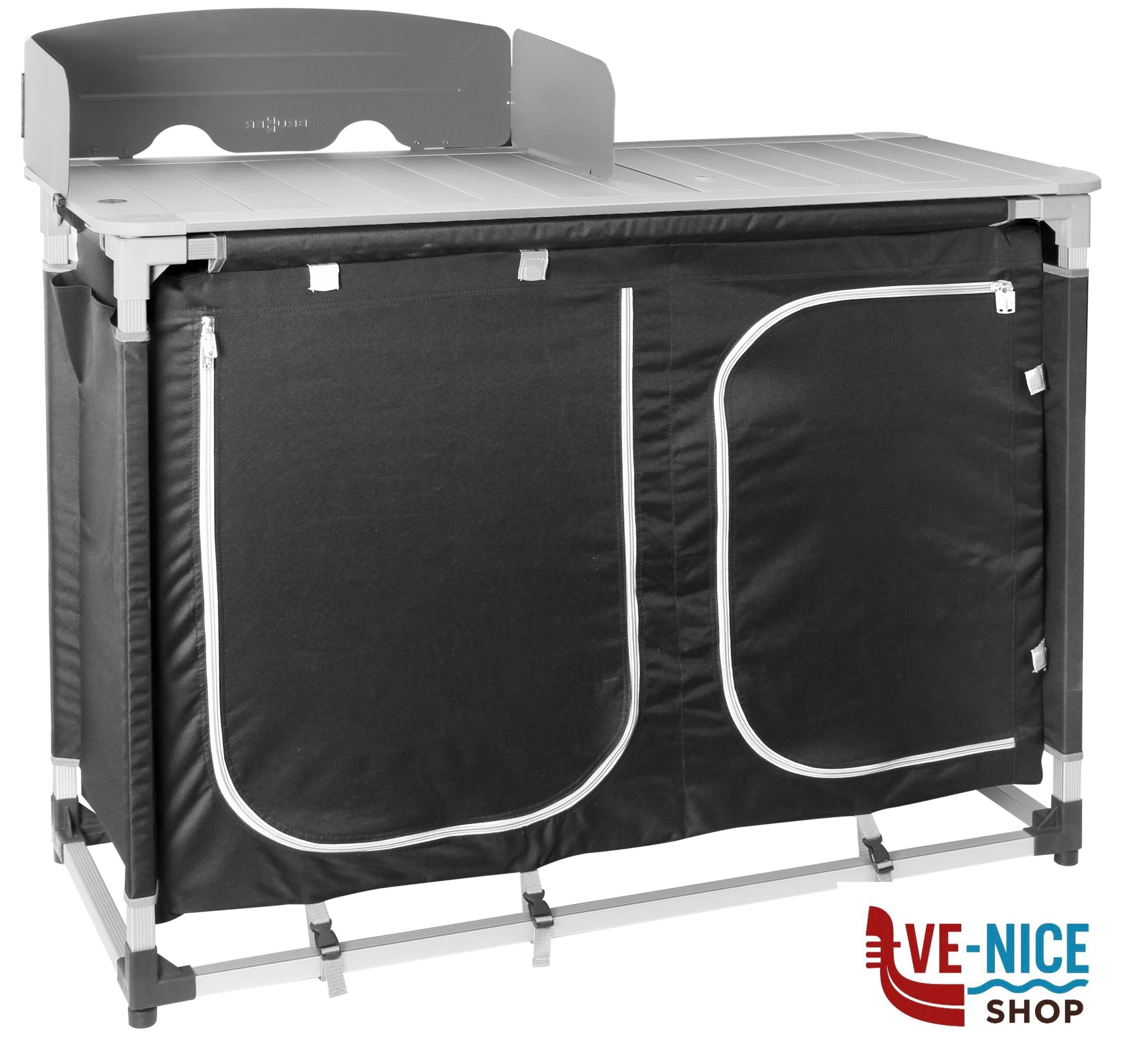 Pratica cucina da campeggio con lavello pieghevole integrato e rimovibile e 2 grandi vani portaoggetti con tanto spazio per il cibo e gli utensili da cucina. Con piano arrotolabile in alluminio di grandi dimensioni e gambe regolabili in altezza. Struttura estremamente stabile grazie all’impiego di profili rettangolari resistenti alla torsione. Montaggio semplice e veloce. Altezza di lavoro: 90 cm. La fornitura include un paravento ed un paraspruzzi, oltre ad una pratica borsa per il trasporto.