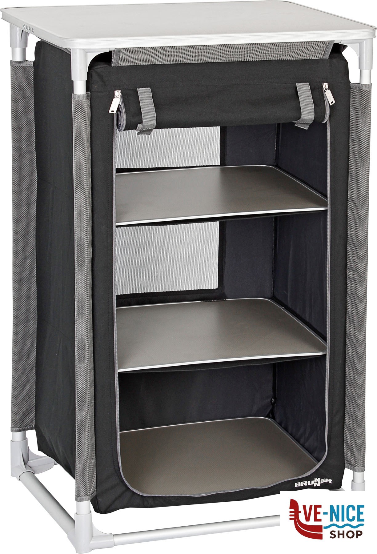 Multipurpose cabinet made of aluminium, with interior shelves.