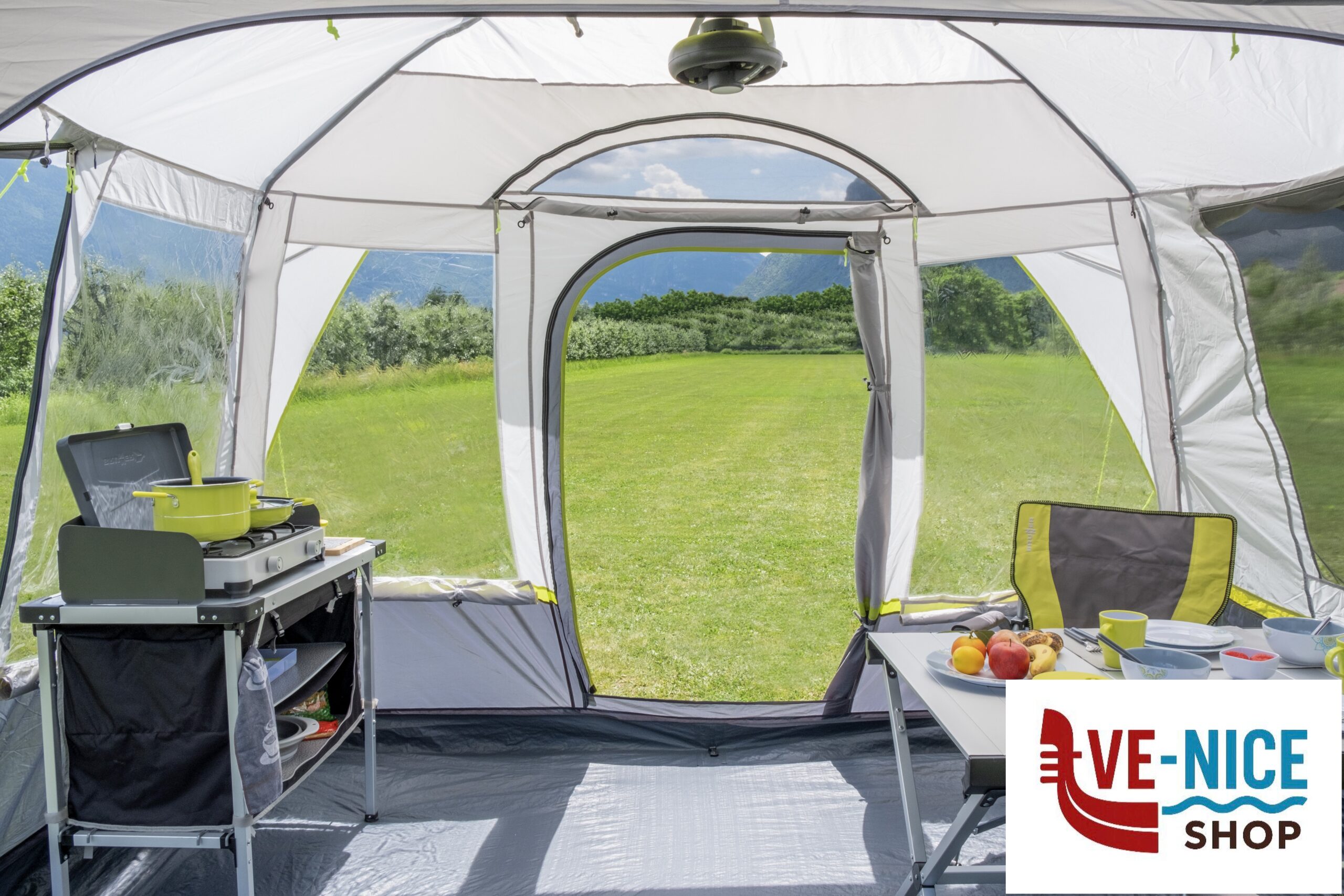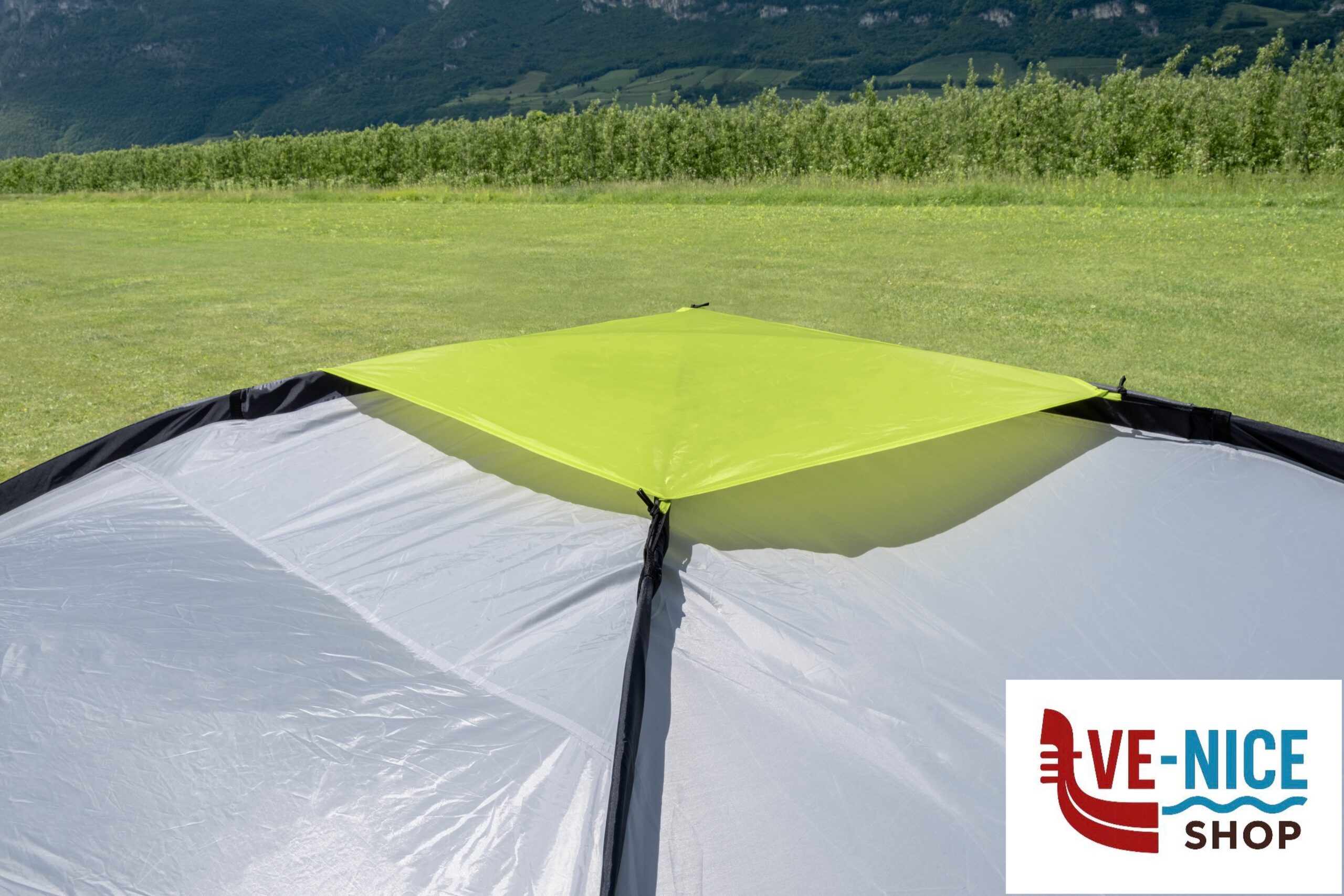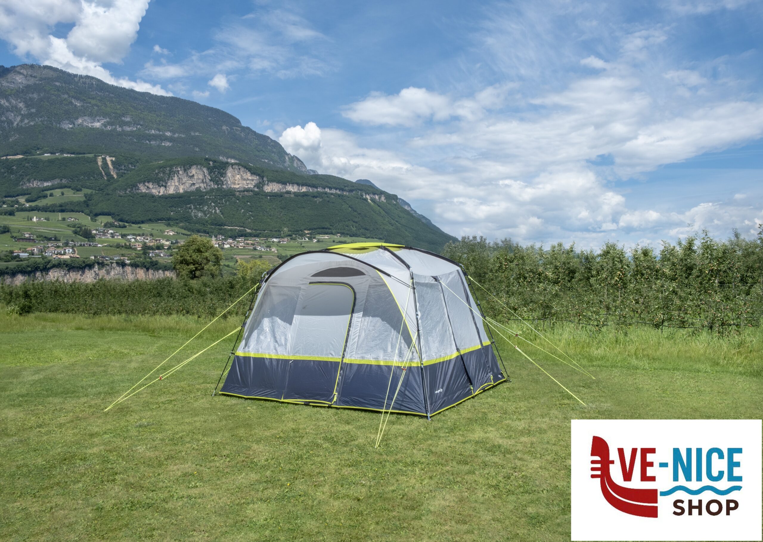 Accessori di serie: camera interna (abitacolo), telo tenda con catino, paleria, pali verticali, palo di collegamento, corde tensione, picchetti, sacca custodia.