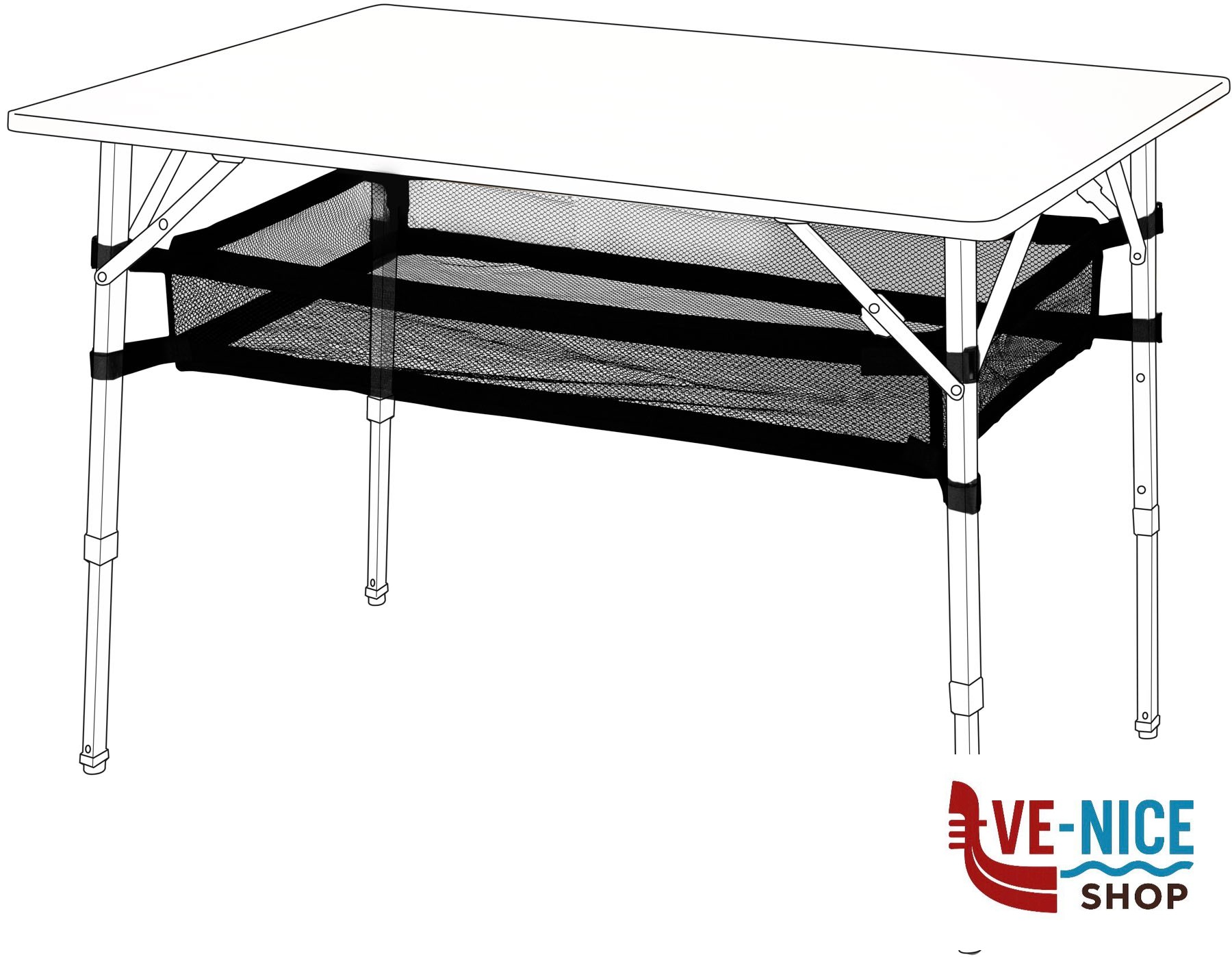 Pratico ripiano supplementare in rete per tavoli a 4 gambe verticali. Costruzione regolabile in lunghezza. Facilissimo da applicare mediante cinghiette munite di nastro Velcro. Completo di sacchetto custodia. Disponibile in 2 misure.