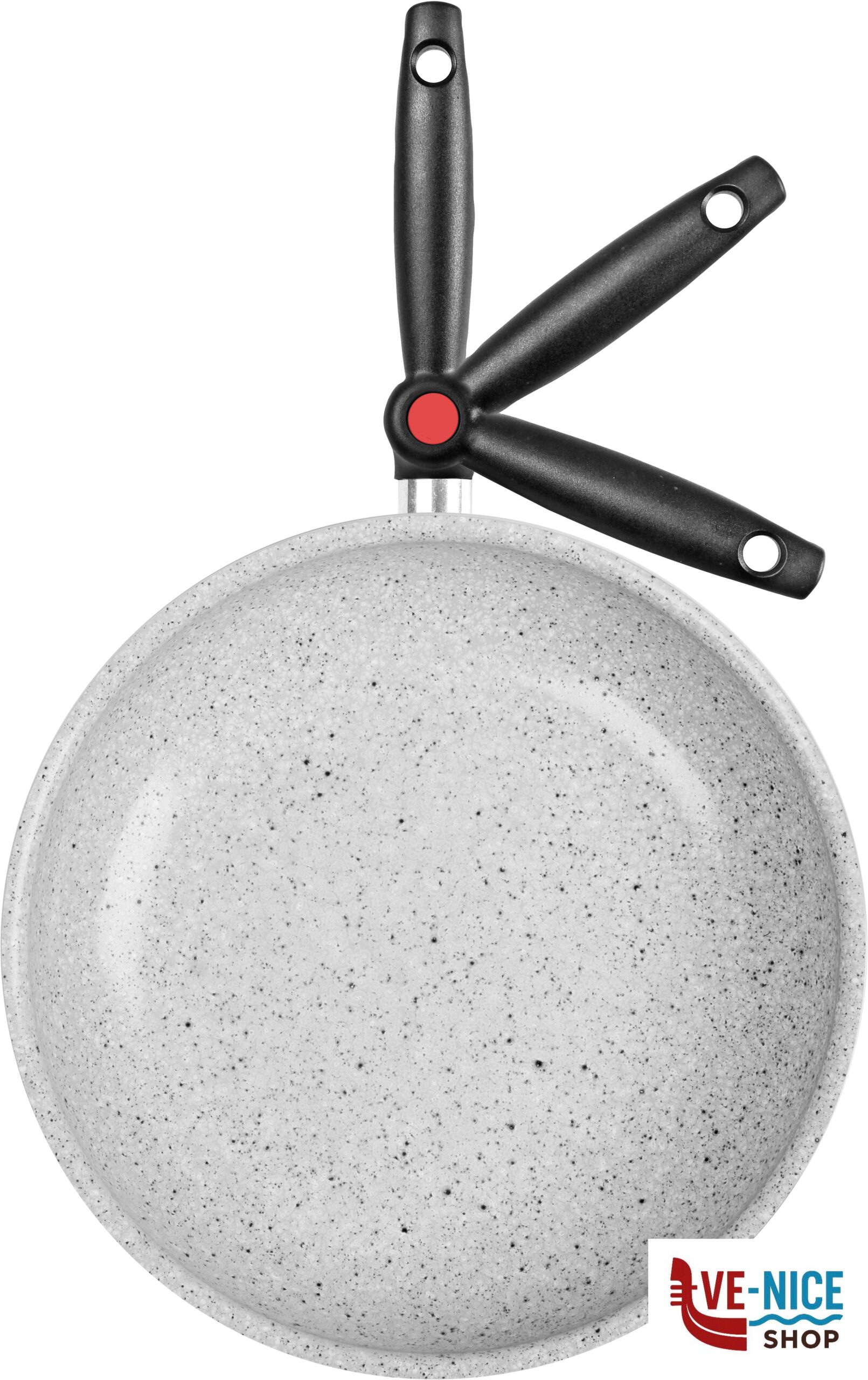 Carezza pans are made of 100% recycled aluminium and feature a high-quality ceramic coating. They cook exceptionally well and are easy to clean. The innovative folding handle maximises storage space, while universal compatibility guarantees trouble-free use on all types of hobs, including induction hobs.