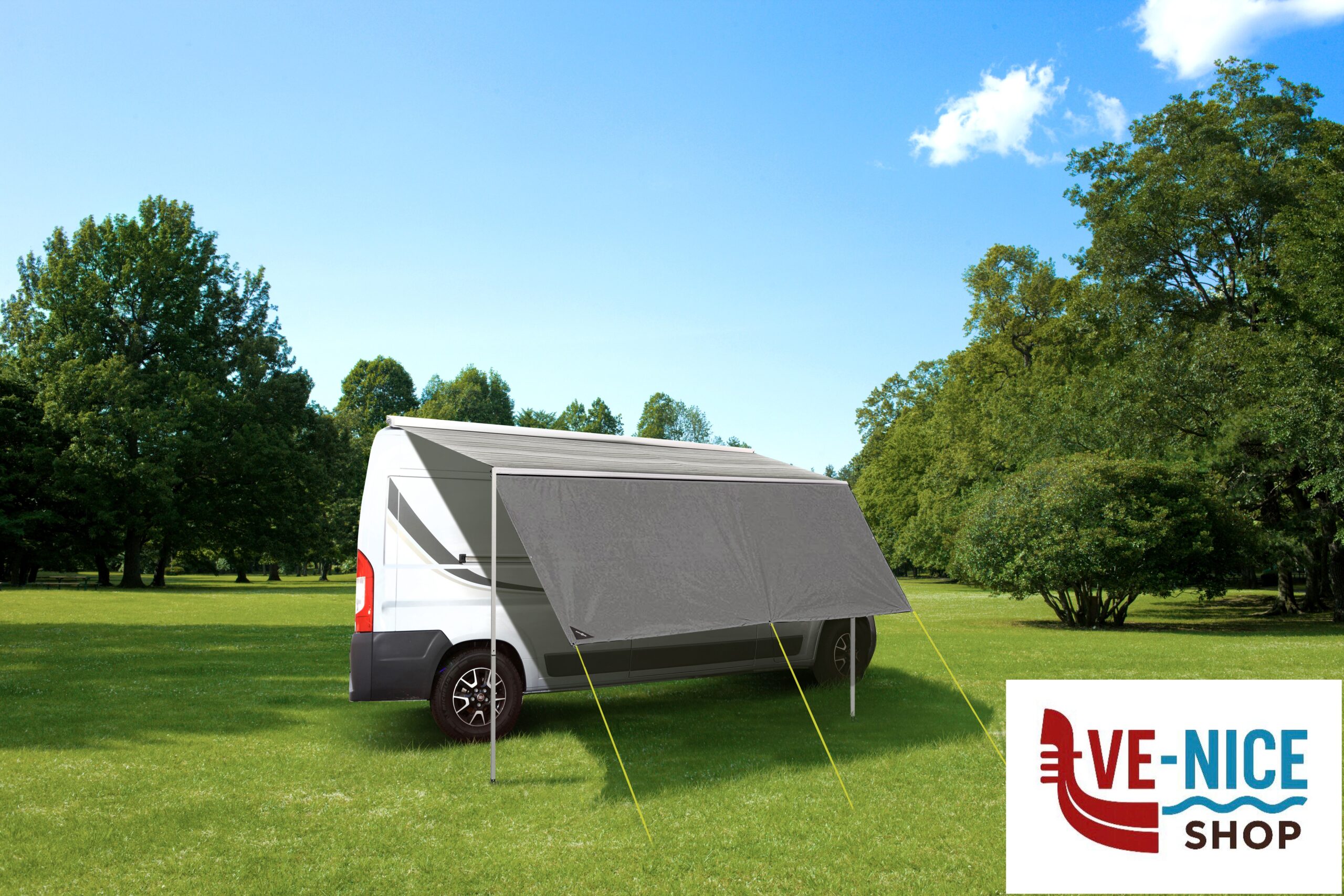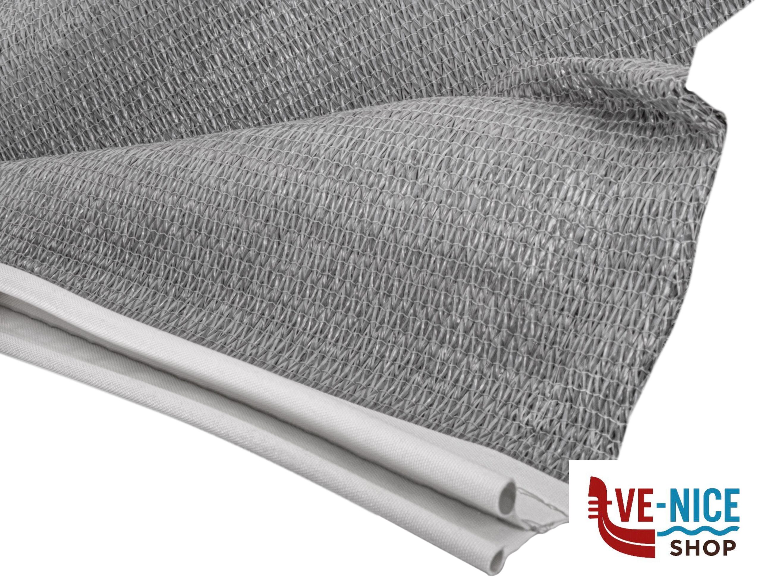Comoda vela parasole in tessuto sintetico resistente ai raggi UV. Bordata su tutto il perimetro, con occhielli. Facile da montare sulla guida di scorrimento di roulotte, camper, furgoni o autobus. Adatta alla maggior parte dei modelli di verande comunemente in commercio. Con picchetti e corde di fissaggio.