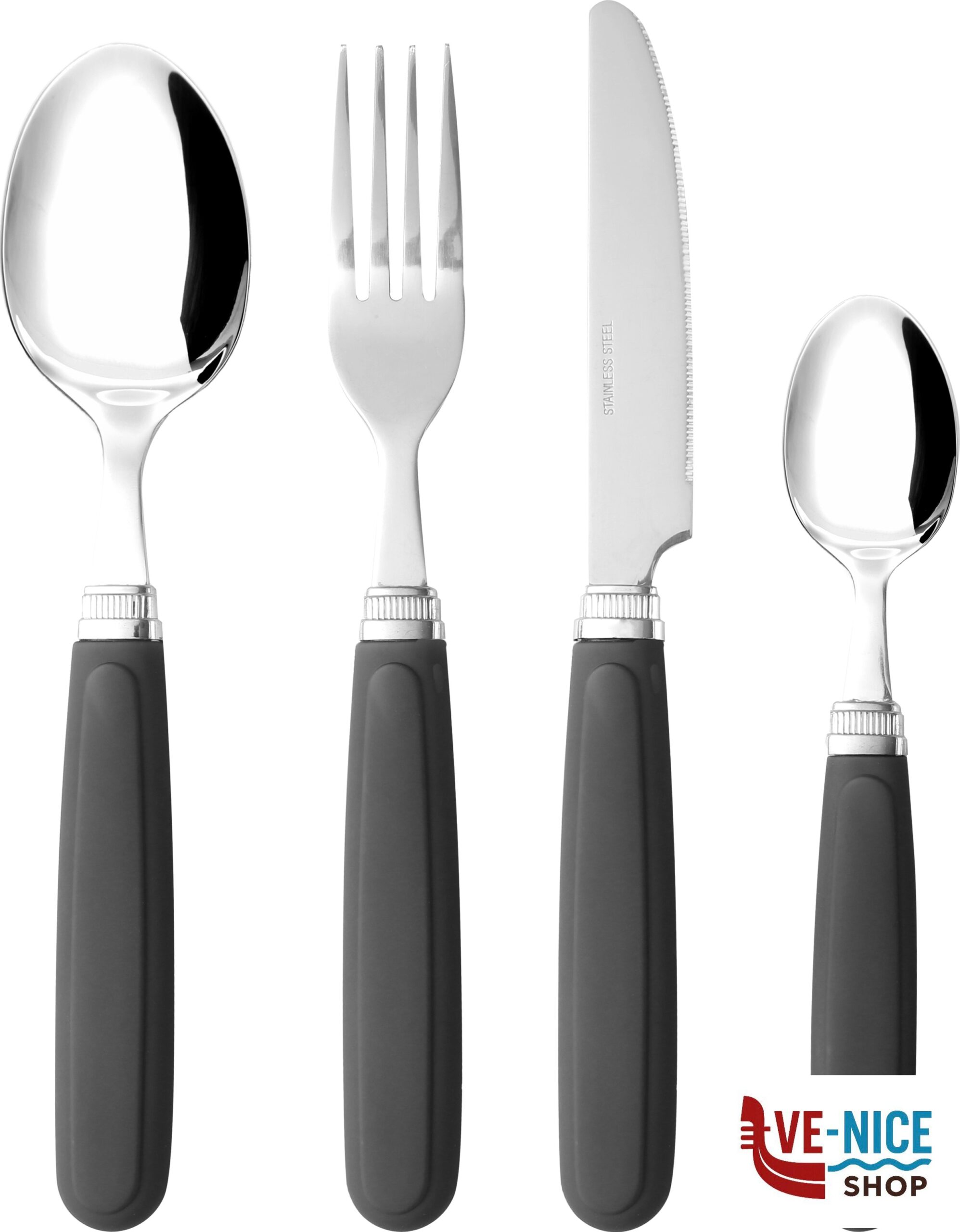 Posate in acciaio inox anti-ruggine con manico anti-scivolo. Set da 16 pezzi composto da quattro forchette, quattro coltelli, quattro cucchiai e quattro cucchiaini. Lavabile in lavastoviglie.