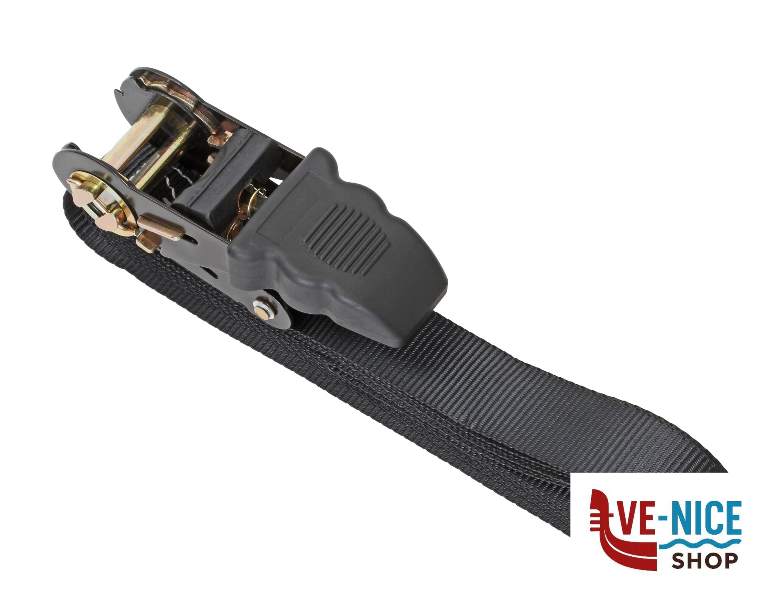 Cinghia di ancoraggio monopezzo con cricchetto robusto e antiscivolo in acciaio rivestito in gomma. Aree di applicazione: Kayak, barca, tenda, portapacchi, bicicletta, rimorchio, SUP, moto, tavola da surf, camper, caravan.