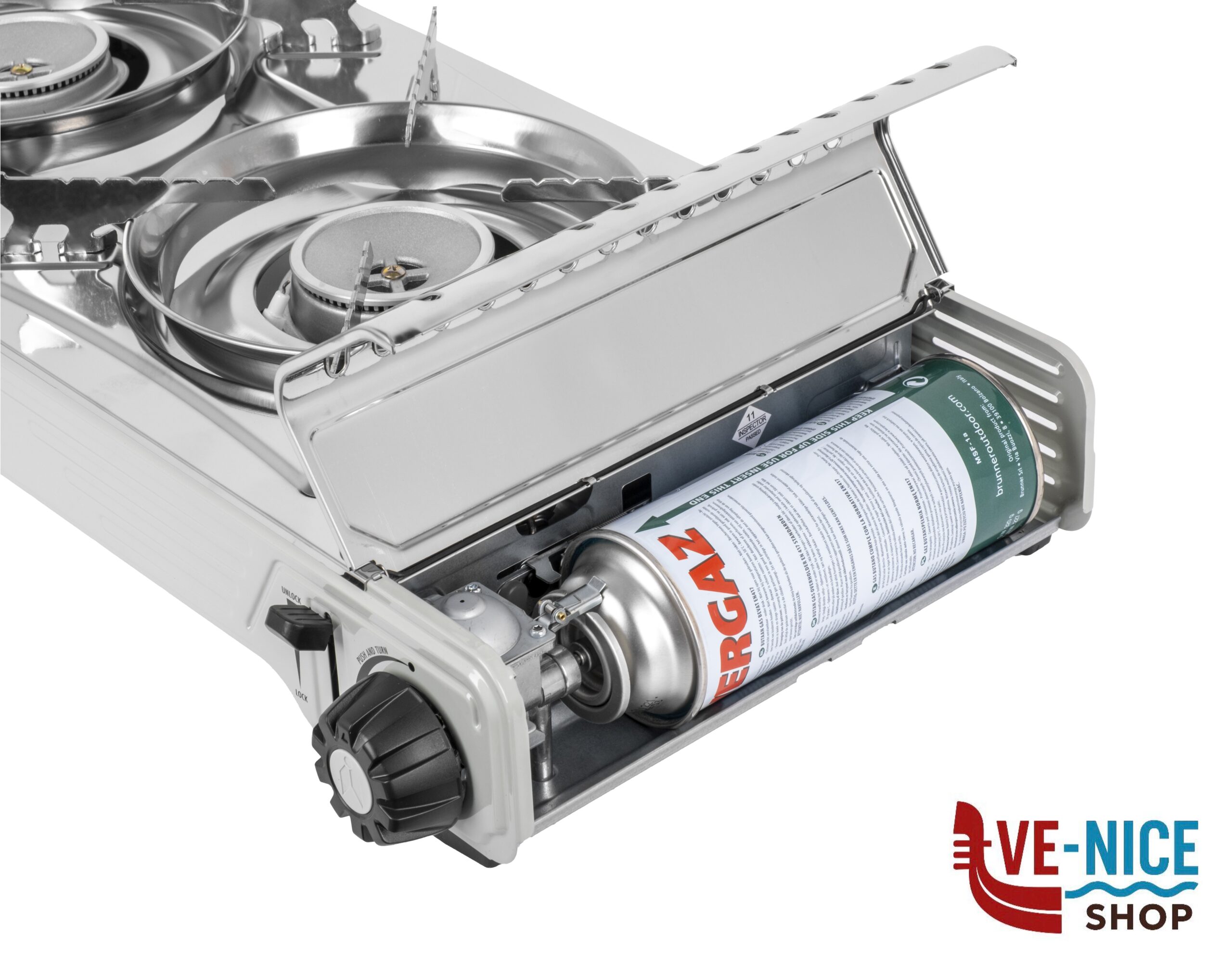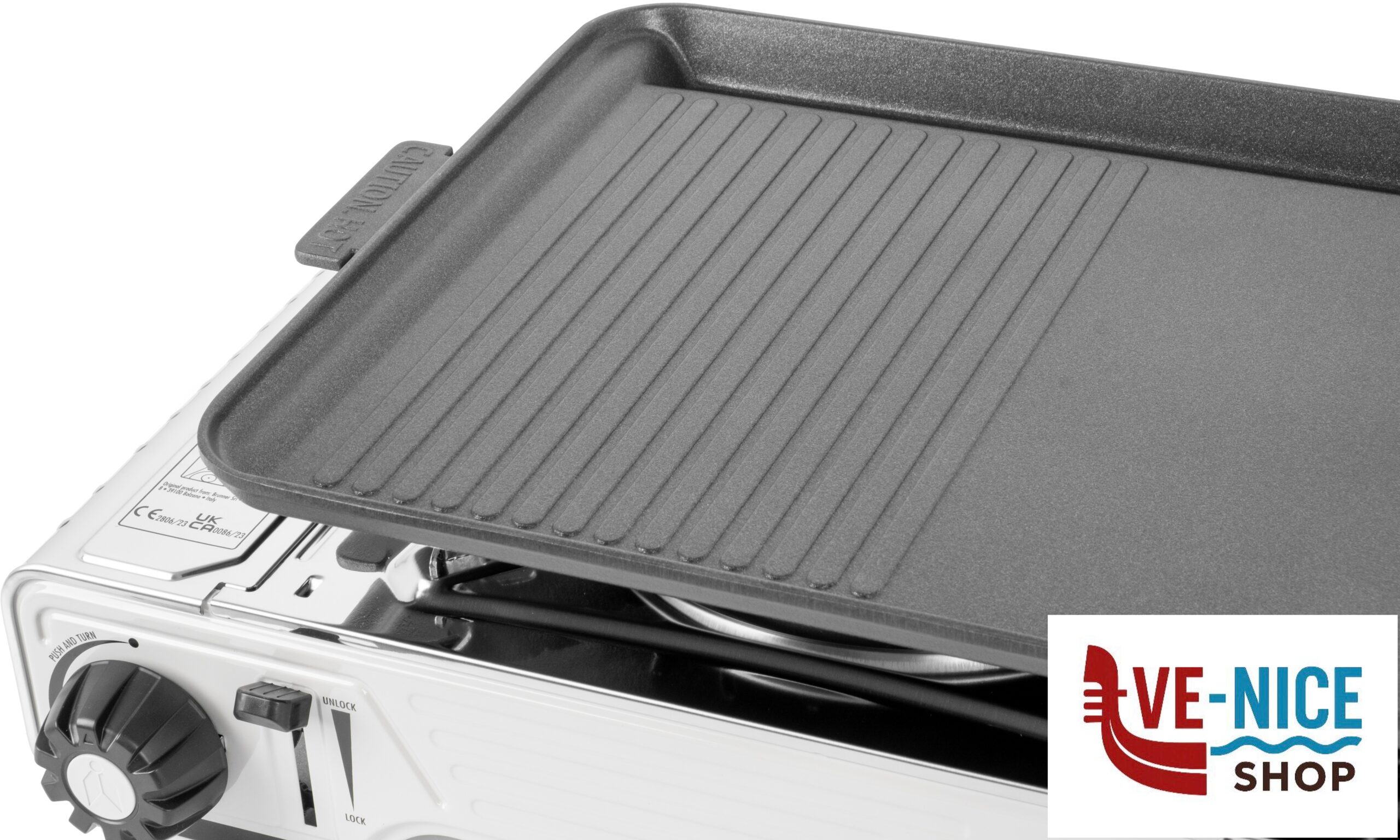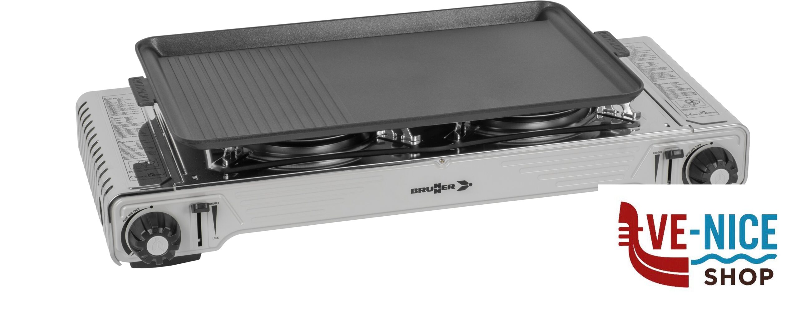 Fornello a gas a 2 fuochi completo di piastra grill, ideale per preparare diversi cibi contemporaneamente ovunque all’aperto.