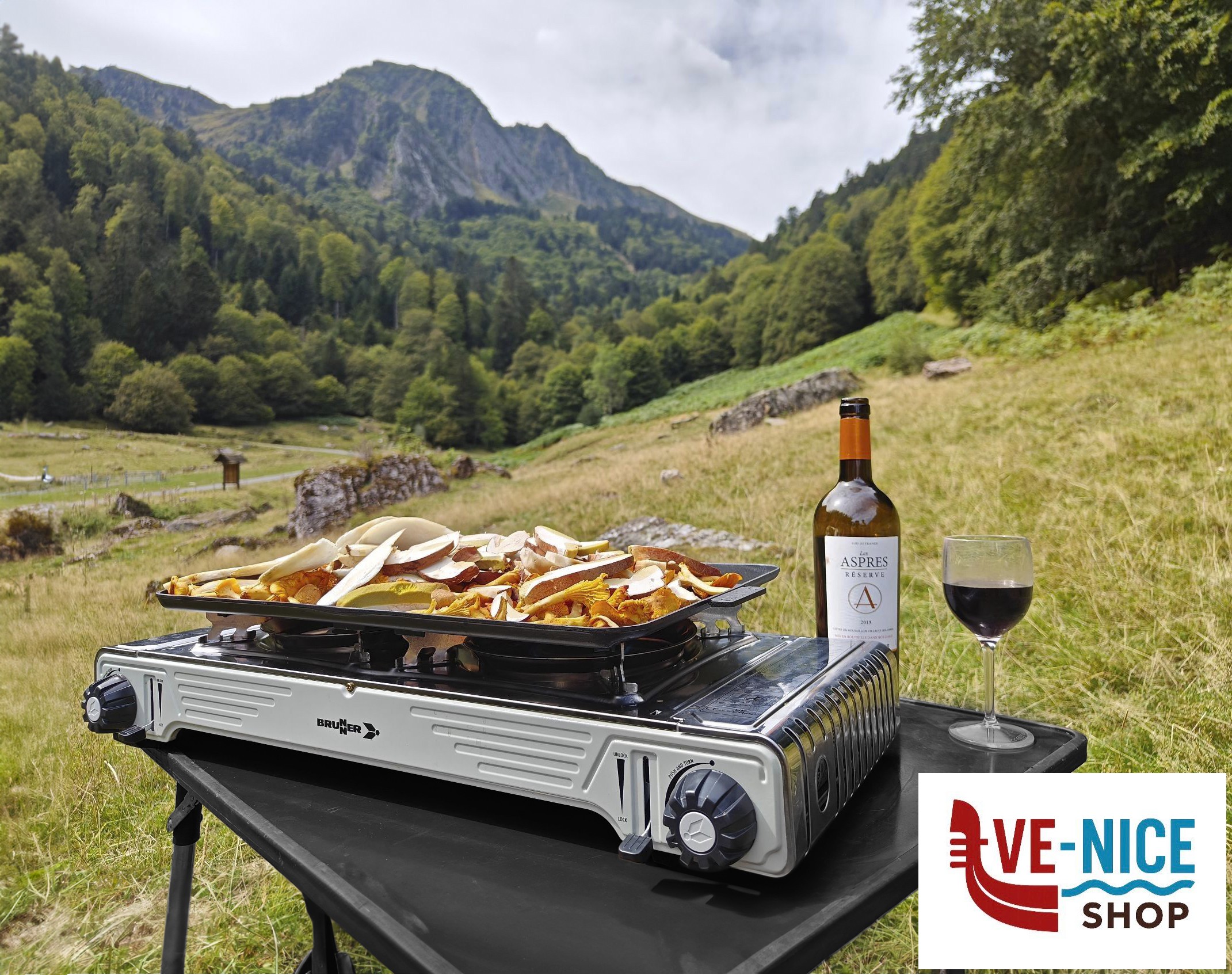 2-burner gas stove complete with grill plate, ideal for preparing different foods simultaneously anywhere outdoors.