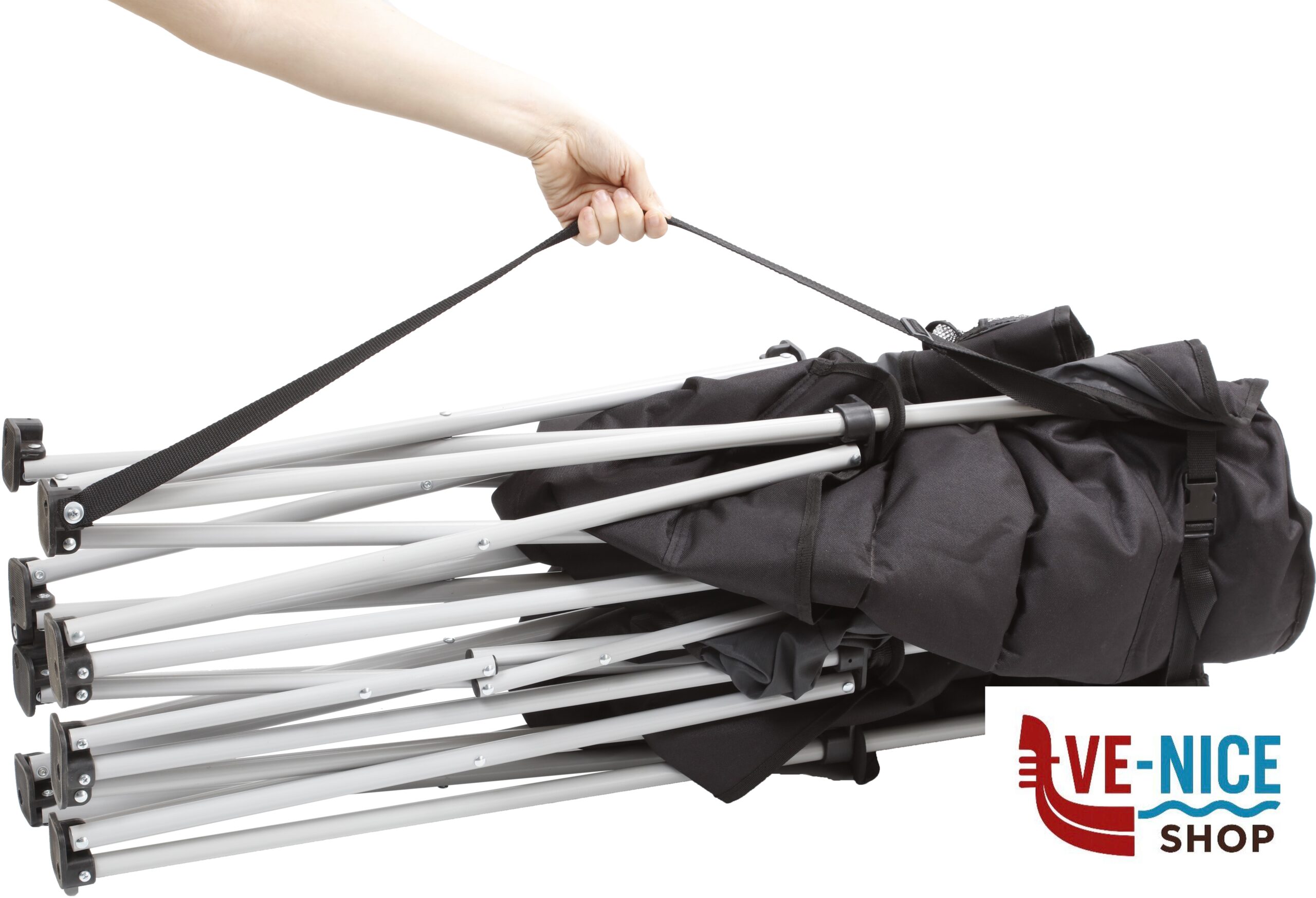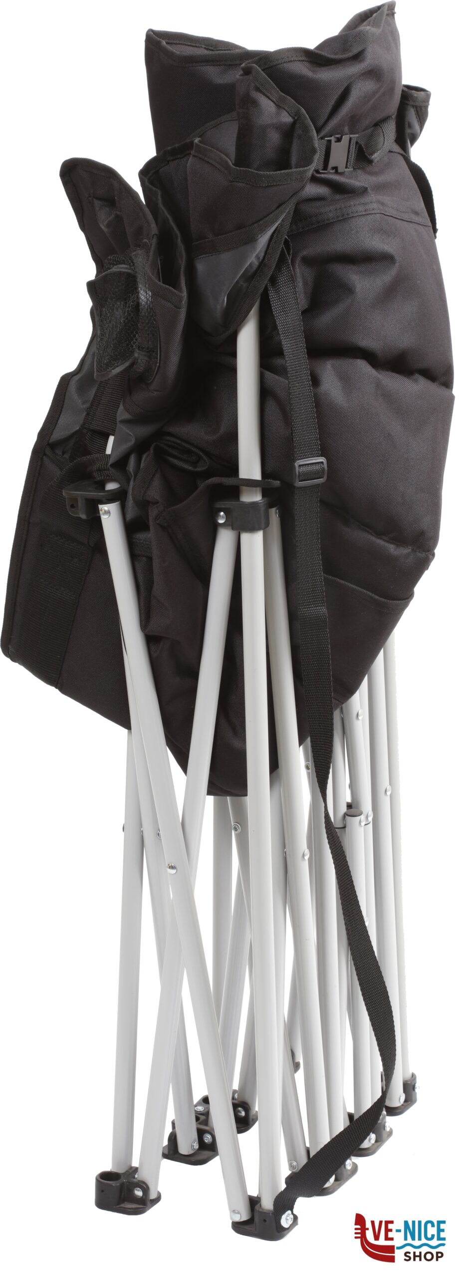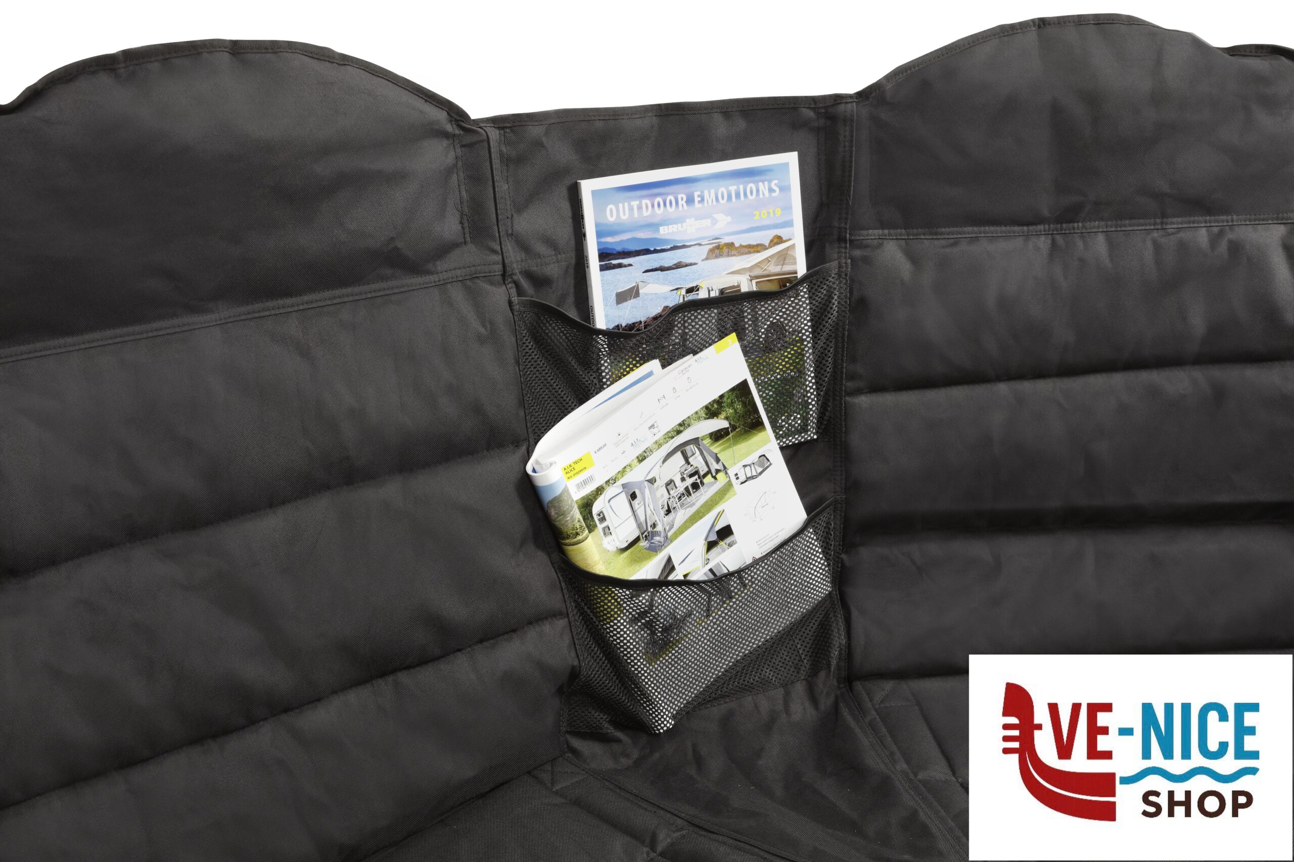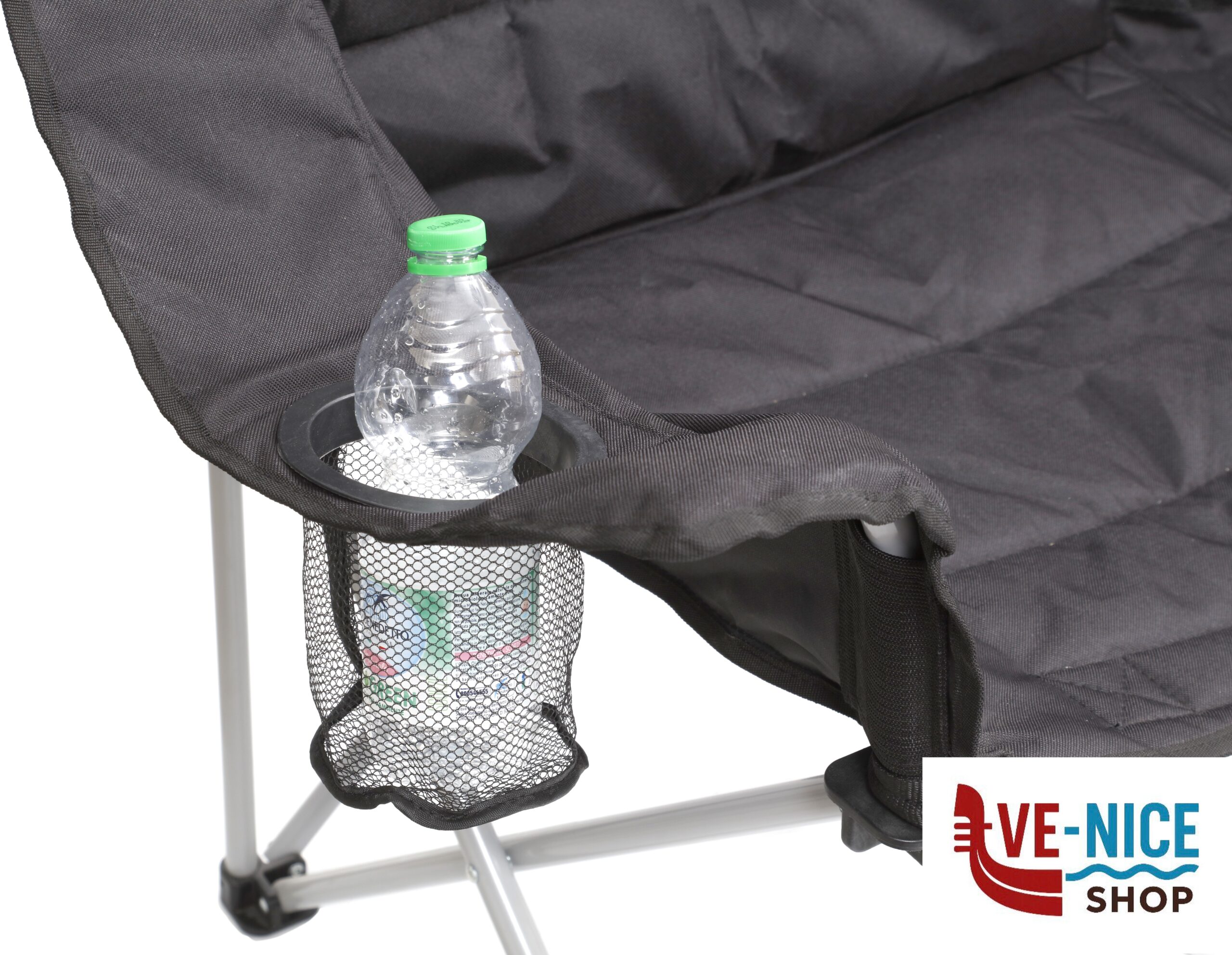 Divano per 2 persone di nuova concezione, molto confortevole, con struttura pieghevole leggermente angolata. Ideale per rilassarsi nella zona soggiorno di tende o verande. Con area organizer centrale dotata di due tasche in tessuto a zanzariera. Sedile e schienale comodamente imbottiti. Apertura e chiusura in pochi secondi senza necessità di montaggio speciale. La fornitura comprende una borsa per il trasporto e lo stoccaggio.