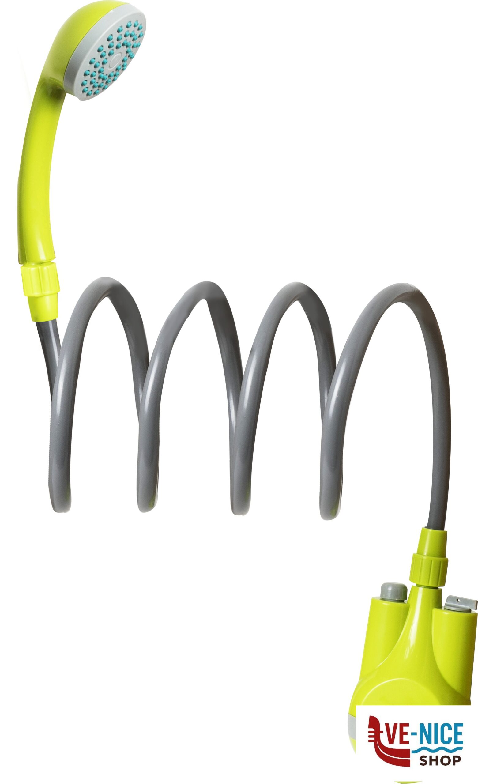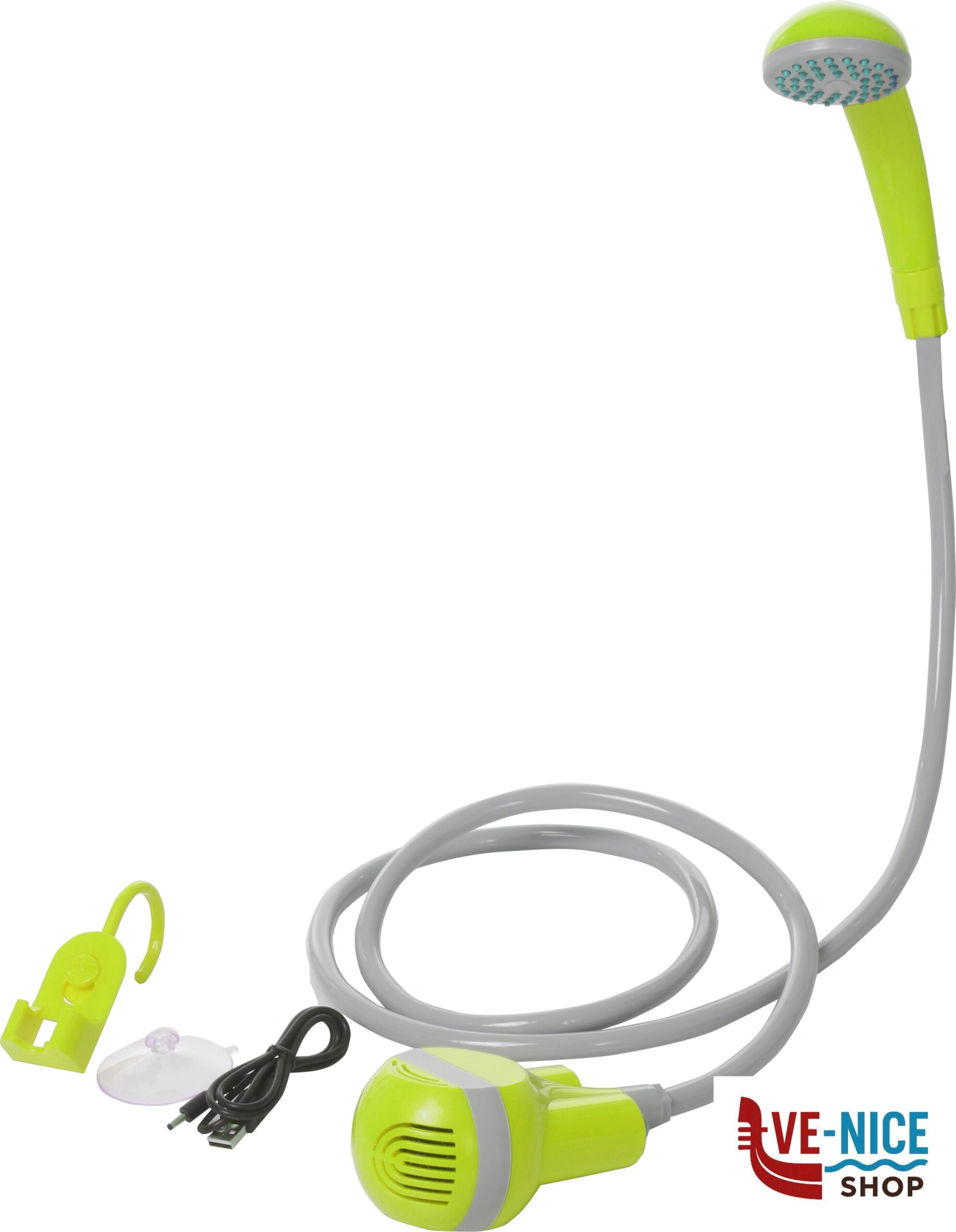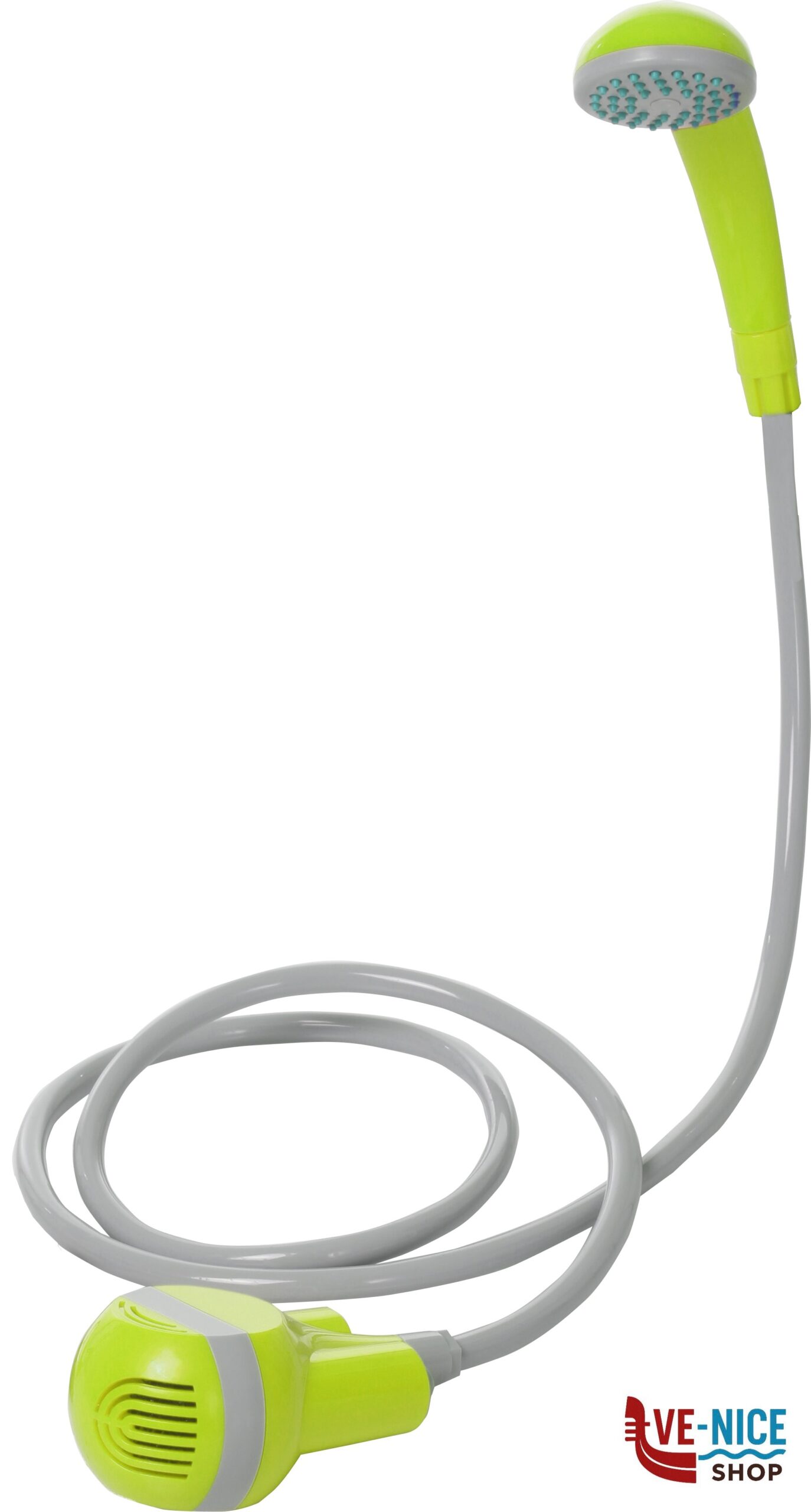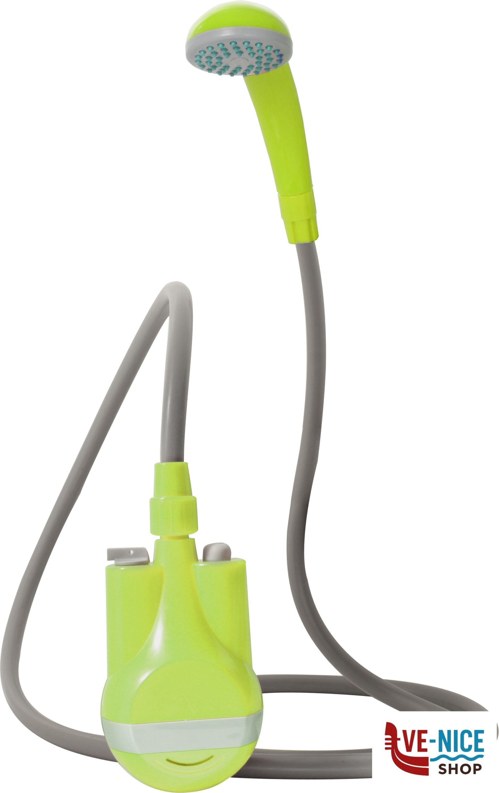 Rechargeable and portable shower with ON/OFF switch. Cordless and lightweight. Perfect for camping, beach, caravaning and other outdoor activities.
