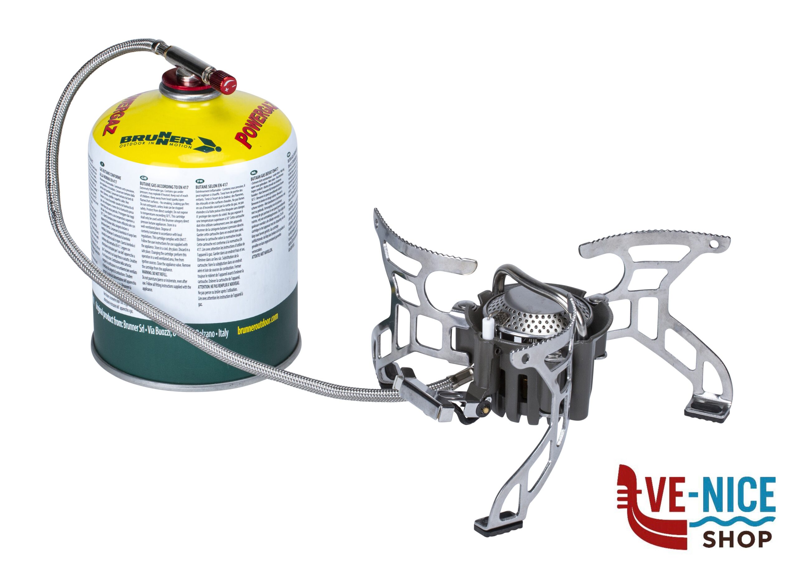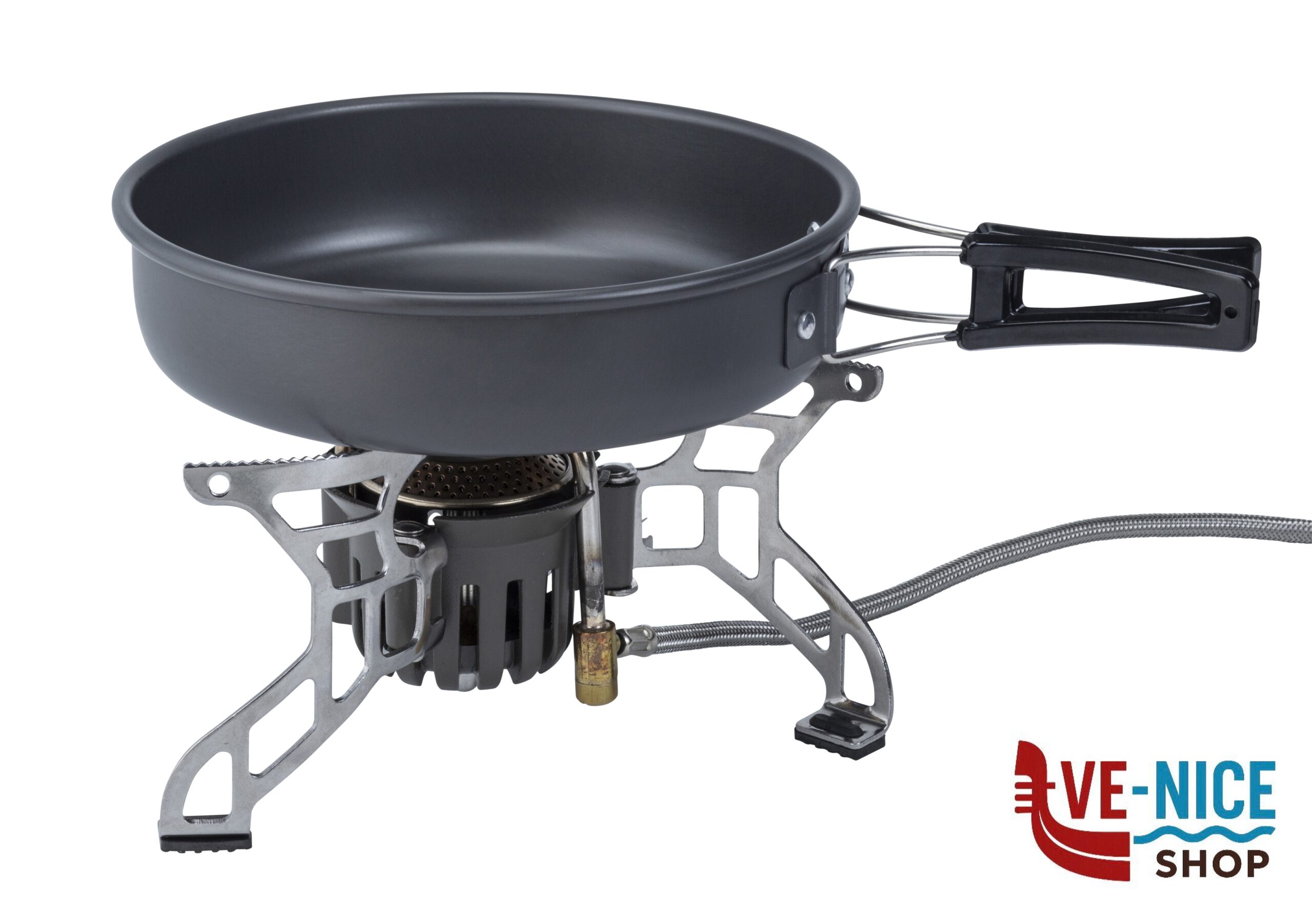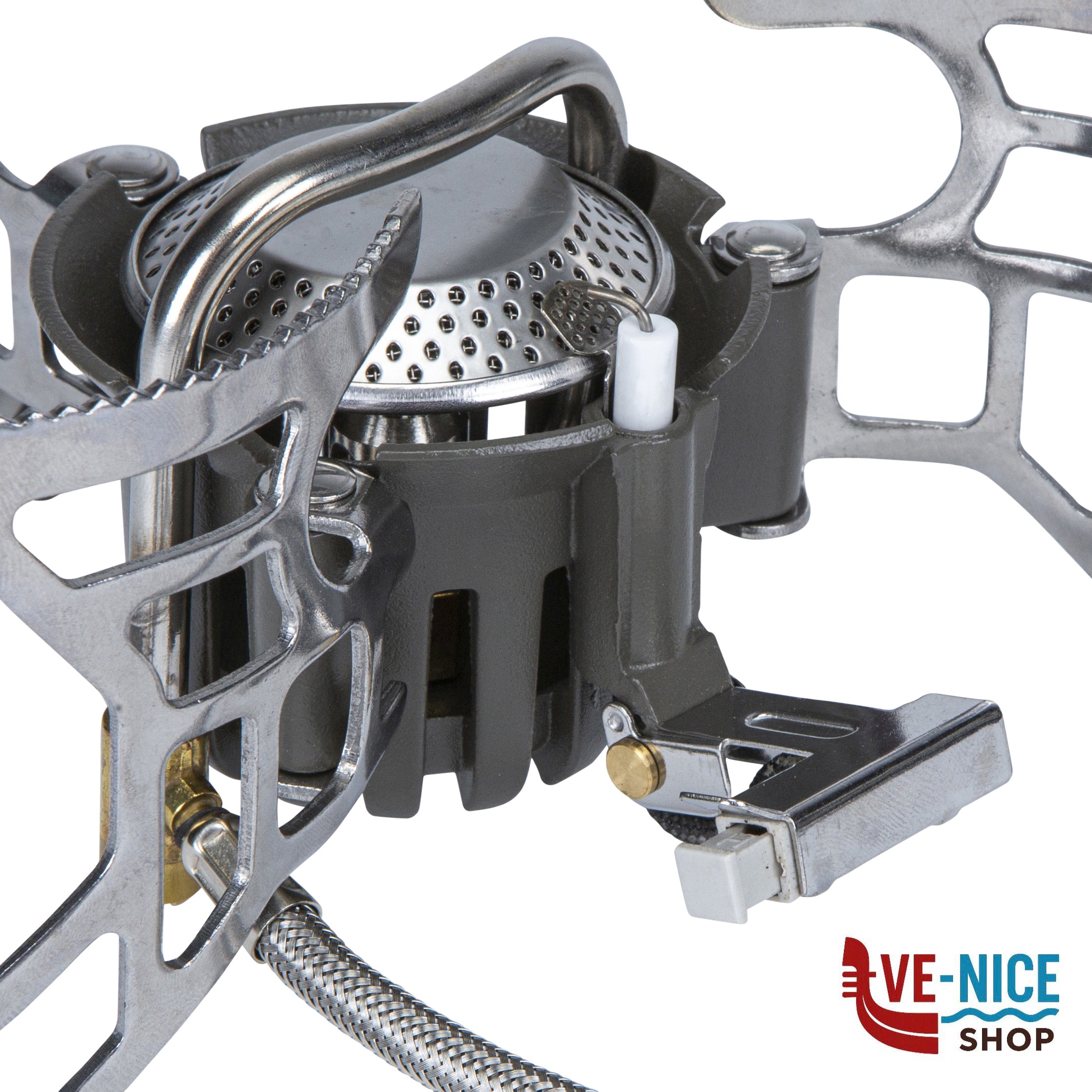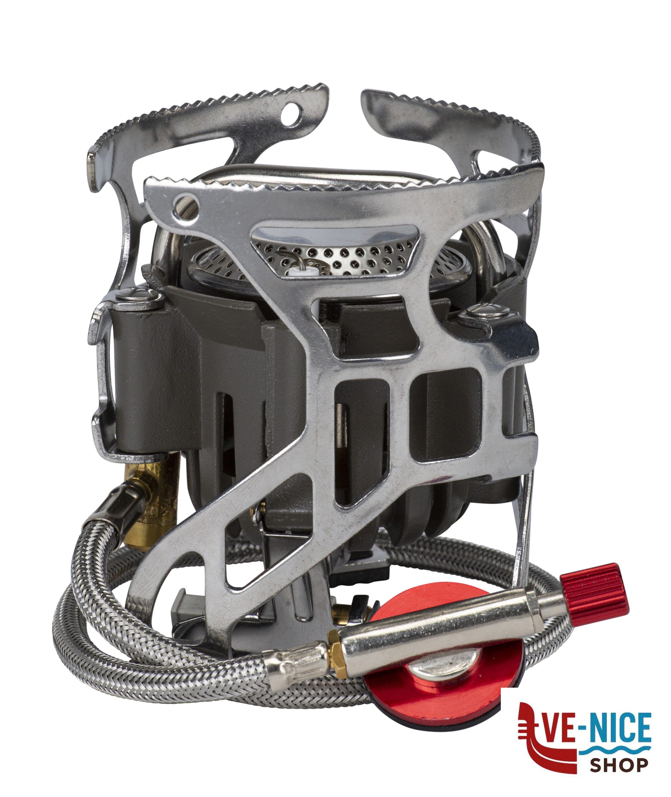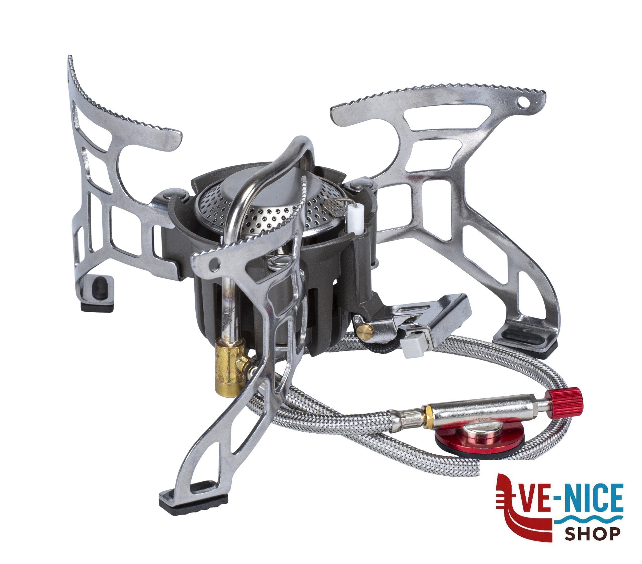 Fornello gas pieghevole ultraleggero in acciaio per camping ed Outdoor. Completo di accensione piezoelettrica e valvola di collegamento con manopola di regolazione della fiamma. Facile da riporre e trasportare nella sua pratica sacca custodia.