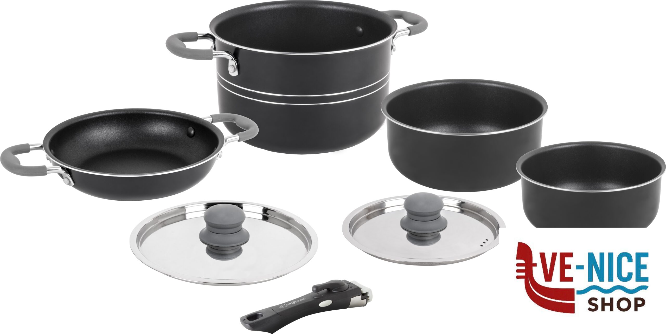 Realizzato in alluminio resistente e dotato di un innovativo rivestimento antiaderente, questo pratico set di pentole è il compagno perfetto per le vostre avventure culinarie. Il suo design impilabile consente di risparmiare prezioso spazio, mentre l’intelligente composizione offre numerose possibilità di cottura. Manici in silicone.