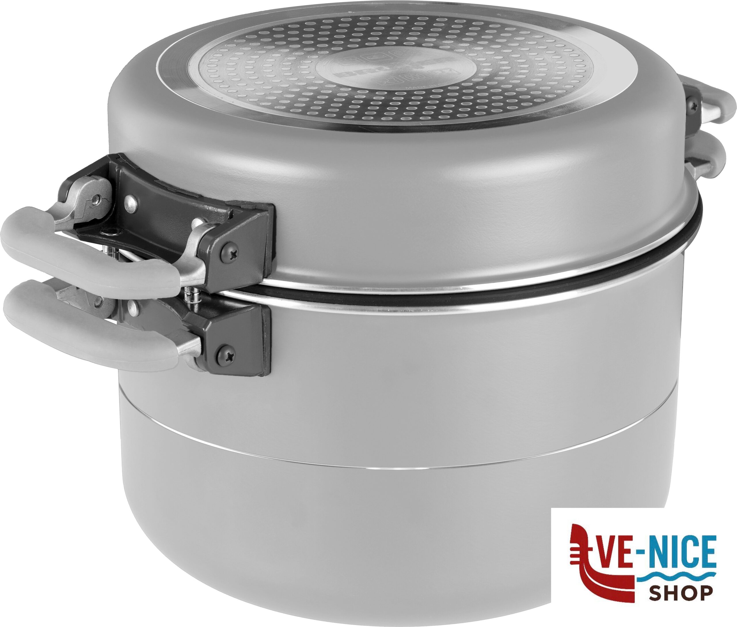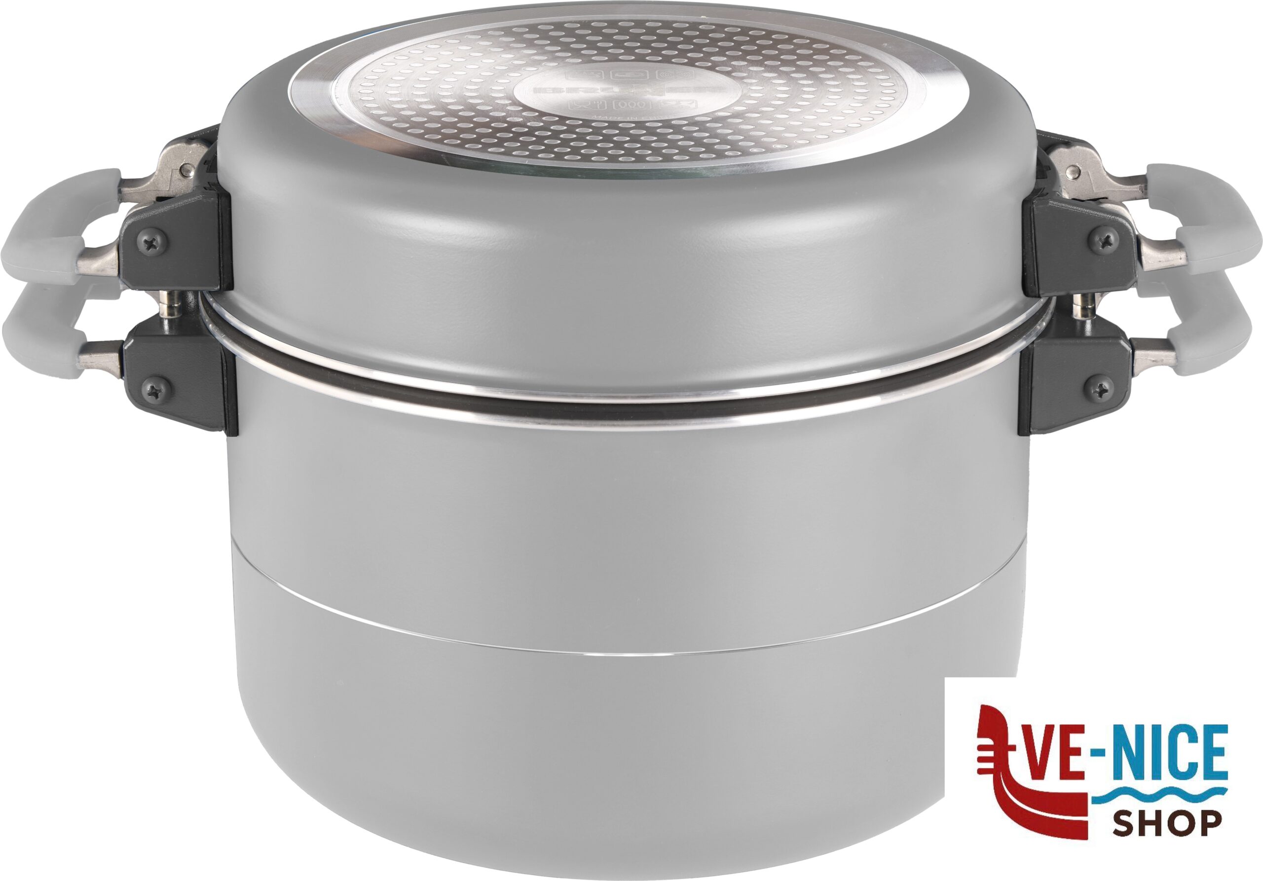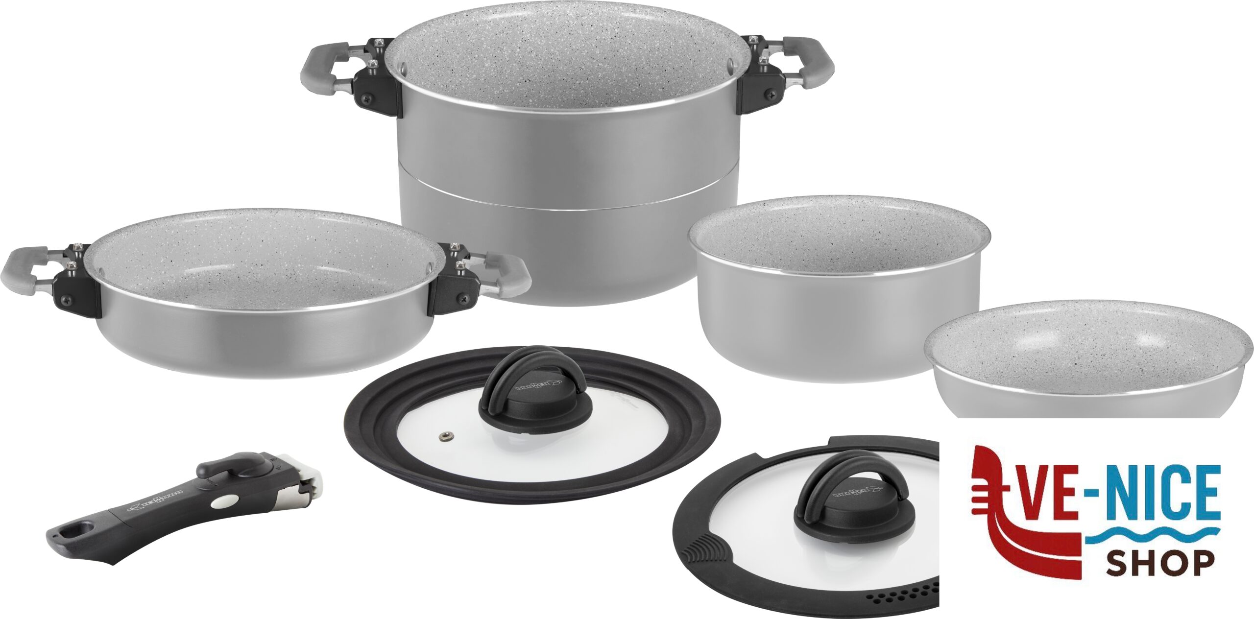 Casseruola piccola~Ø 16 cm – 1,4 l!!!Coperchio grande~Ø 20 / 18 / 16 cm!!!Coperchio medio~Ø 20 cm!!!Padella con manici~Ø 20 cm – 1,2 l!!!Padella senza manici~Ø 18 cm – 1 l!!!Pentola grande~Ø 20 cm – 4 l!!!Peso~3,4 kg!!!Pinza grip~1X
