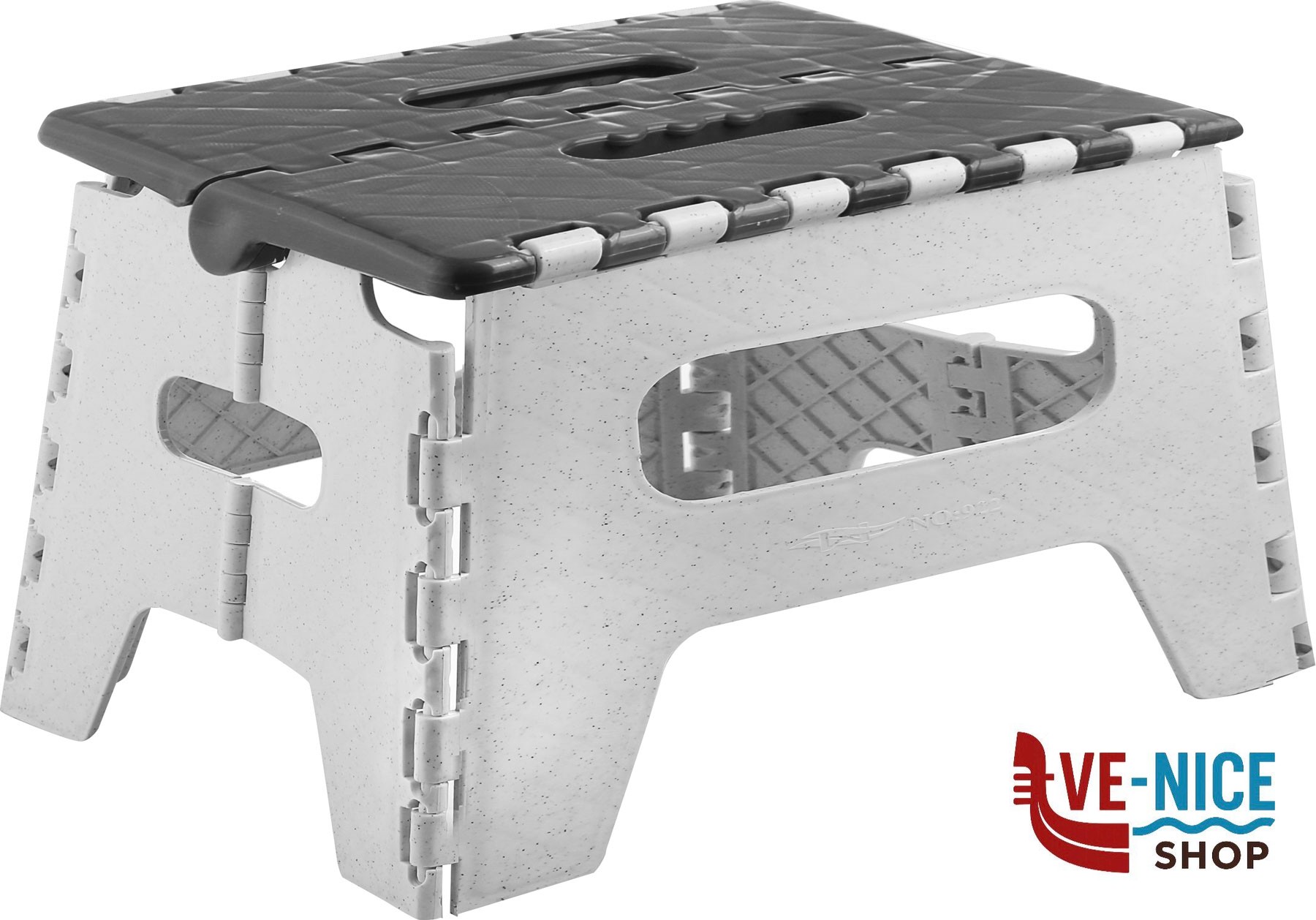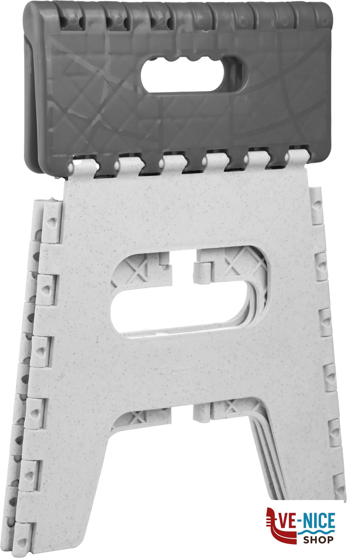 Practical folding step for camping and household made of plastic. With non-slip tread and rubber stoppers on the legs.