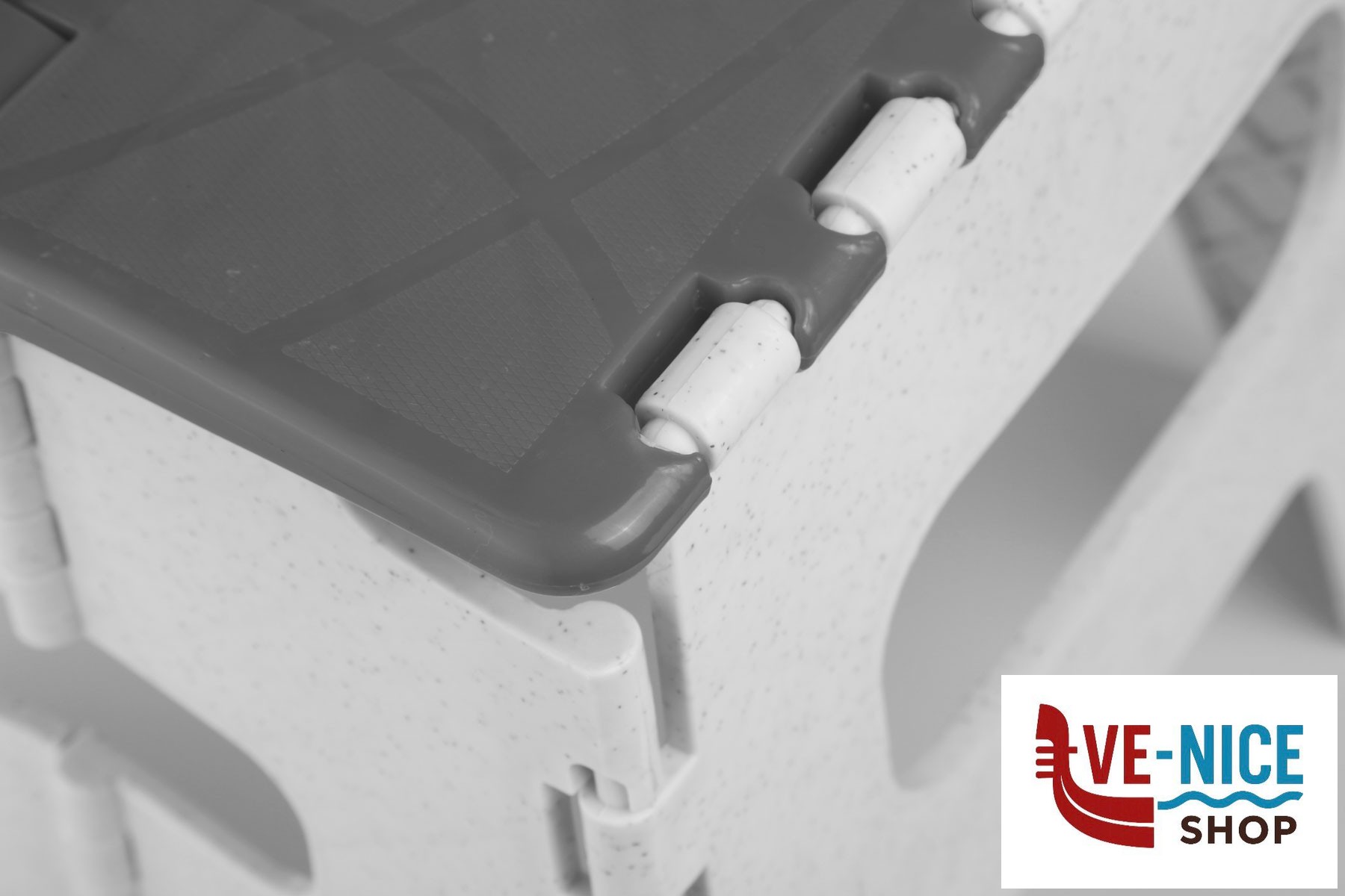 Pratico gradino pieghevole per Outdoor e uso casalingo in materiale plastico. Superficie antiscivolo e piedini in gomma.
