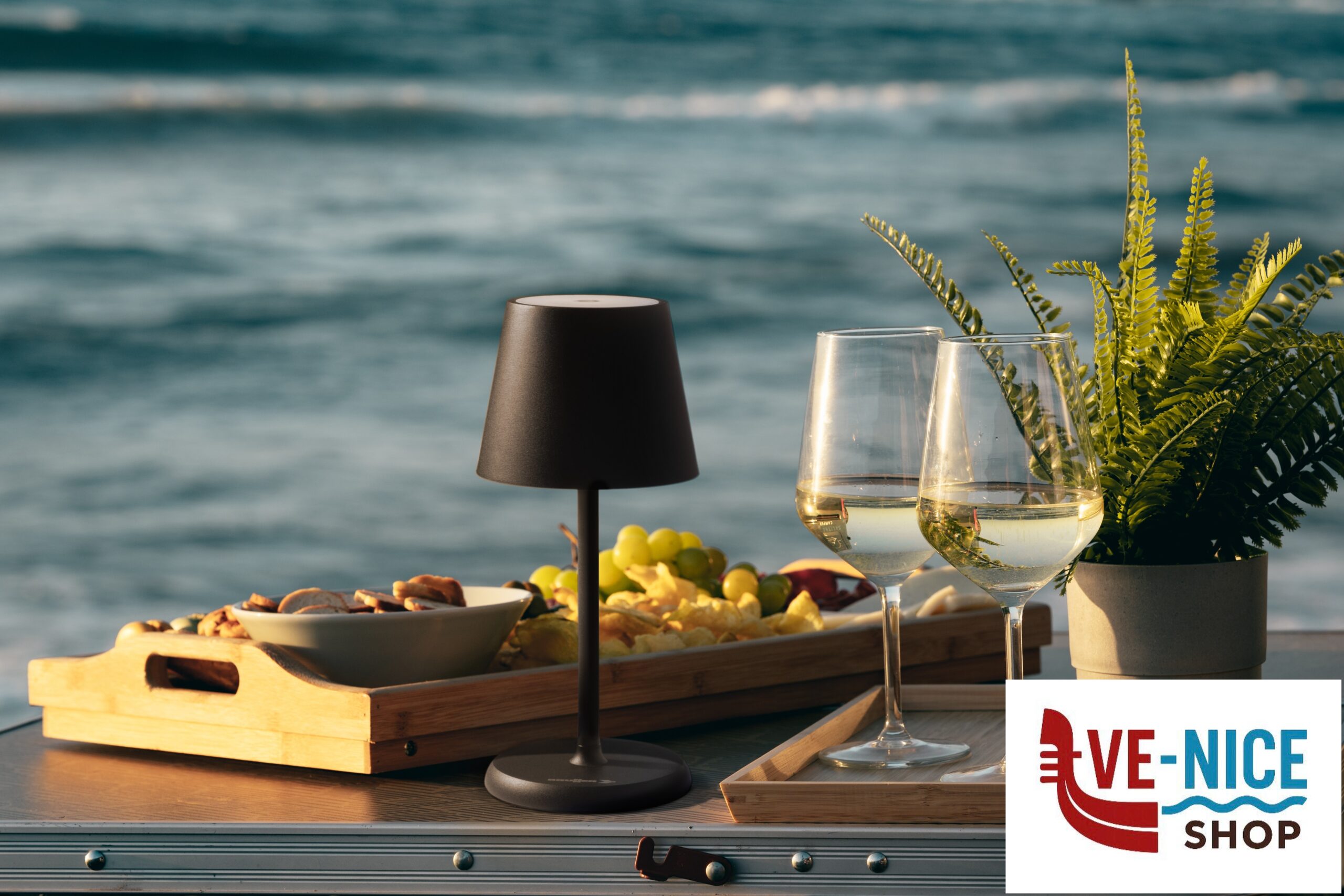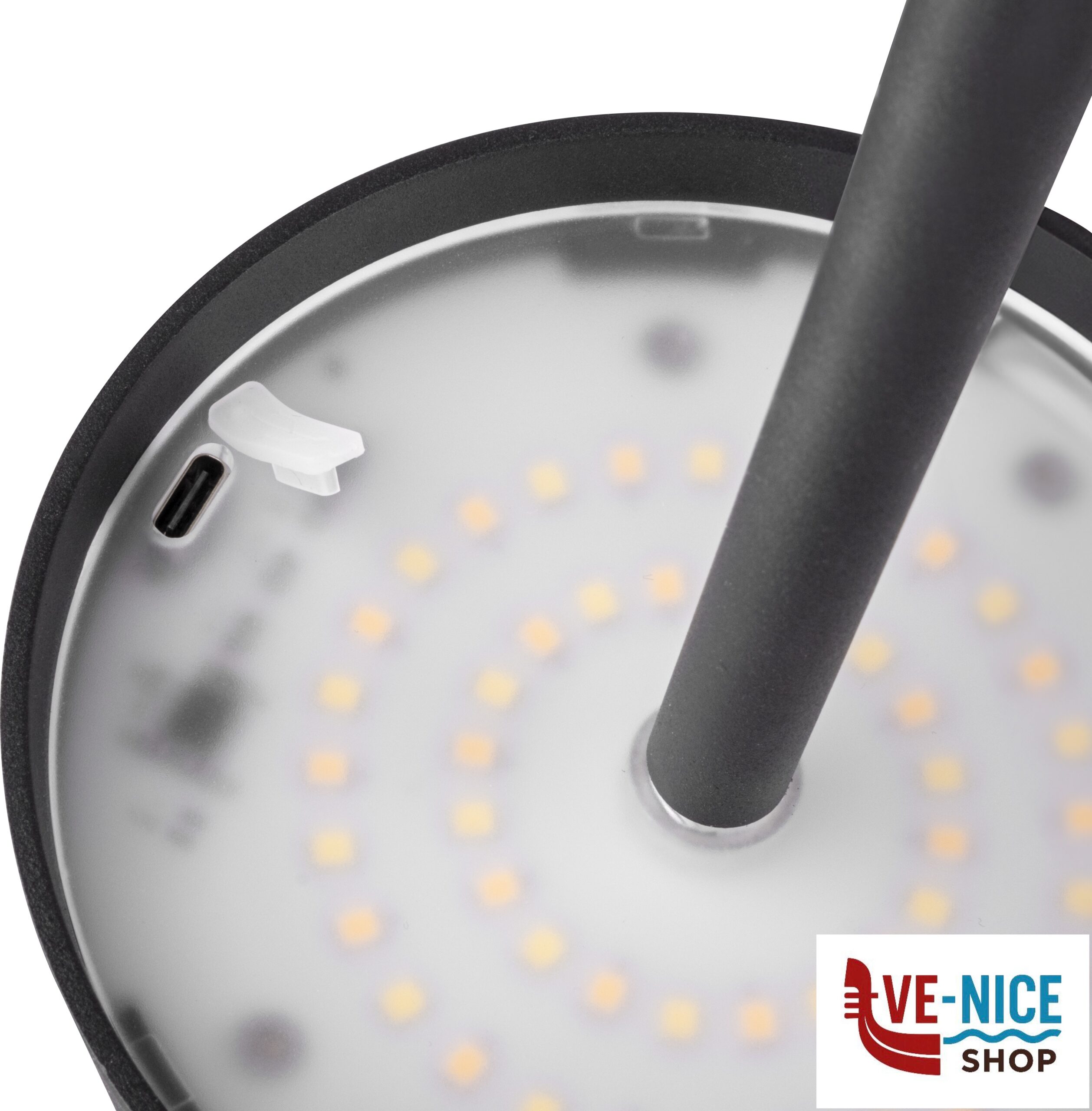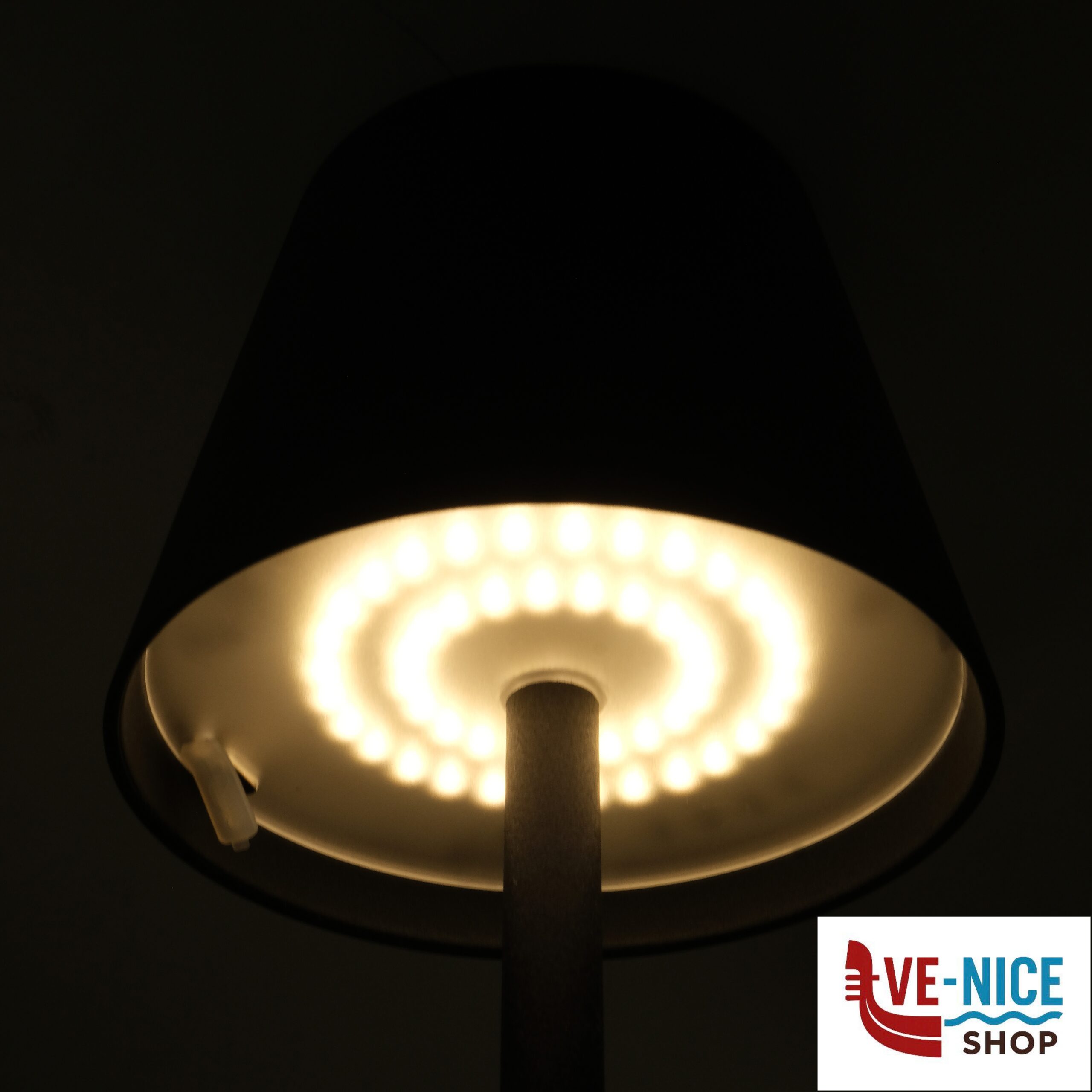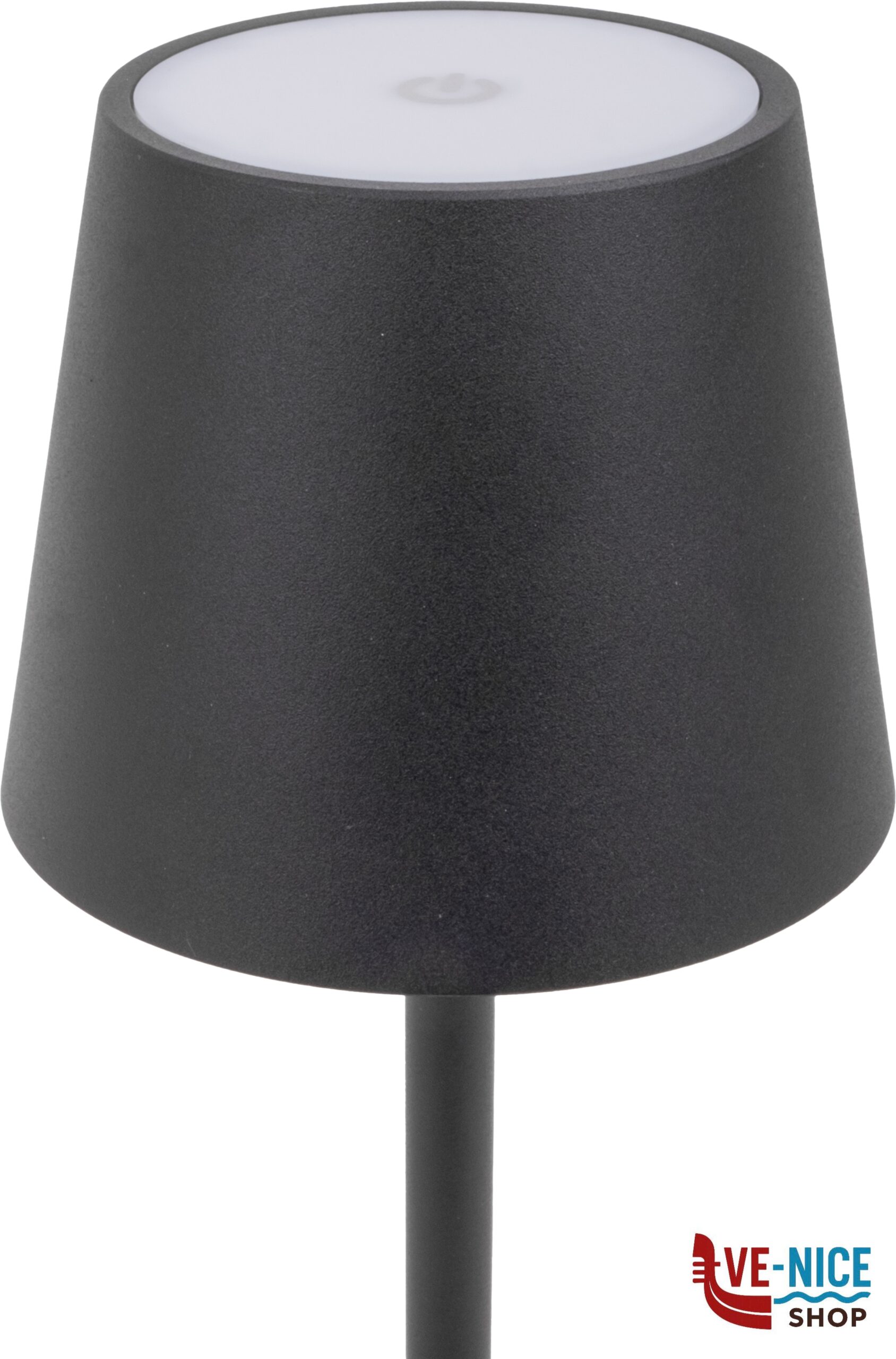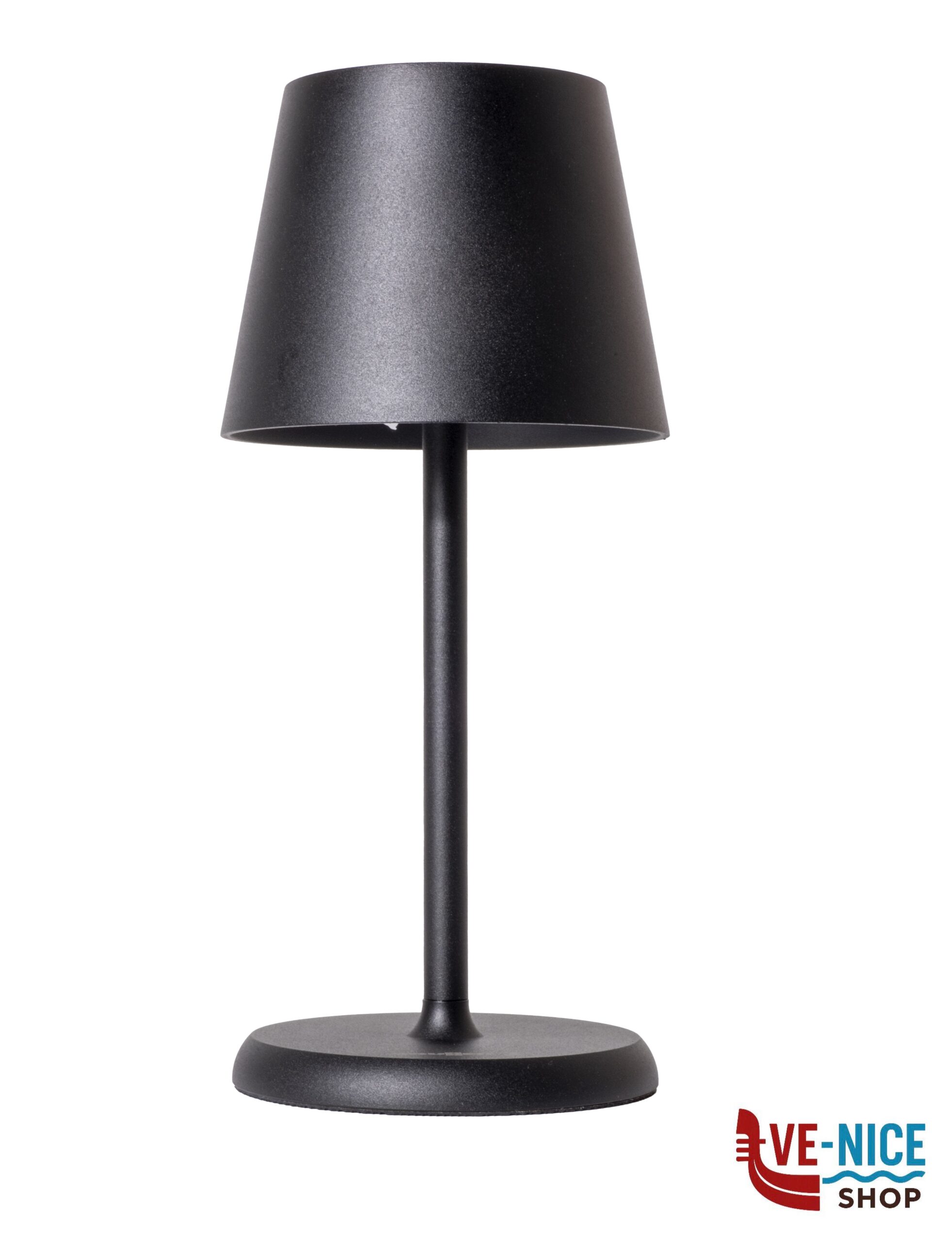 Rechargeable outdoor table lantern with a modern design and professional appearance. It provides pleasant light thanks to warm white LED illumination. Equipped with light intensity control and an elegant metal shade. The integrated lithium-ion battery can be recharged at any time via the supplied USB cable.