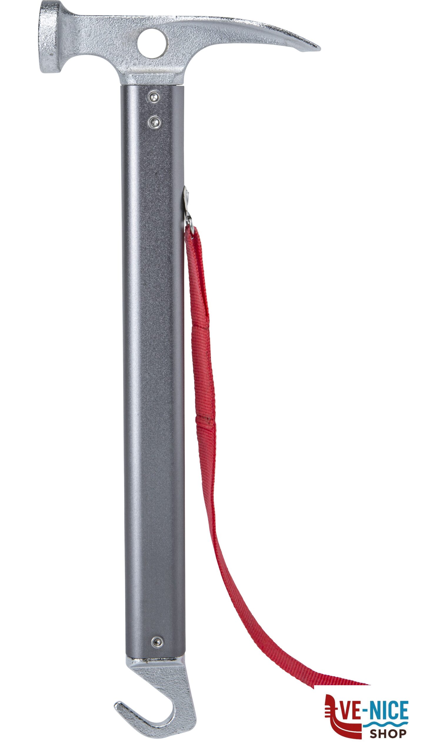 Martello per camping multifunzione realizzato interamente in metallo con solida testa a 2 battenti martello/piccozza, pratico gancio per l’estrazione dei picchetti e cinturino di sicurezza per la mano.