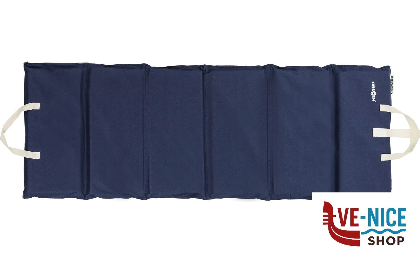Materassino con rivestimento in resistente tessuto antisdrucciolo realizzato in Polyester Oxford. Imbottitura compatta di circa 25 mm di spessore. Completo di maniglie per il trasporto e cinghia di fissaggio.
