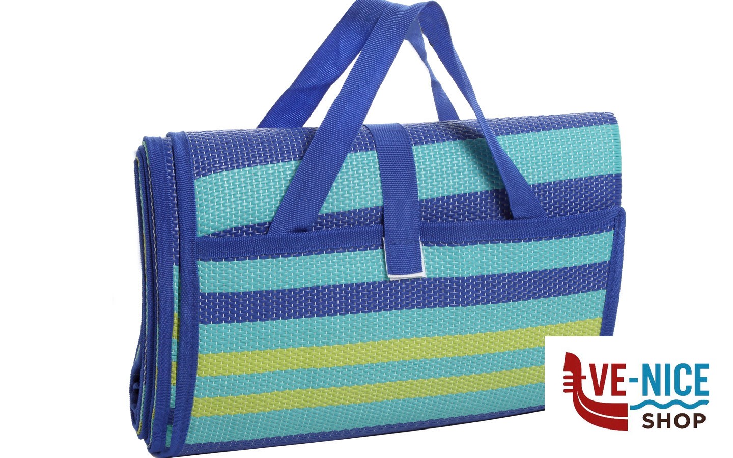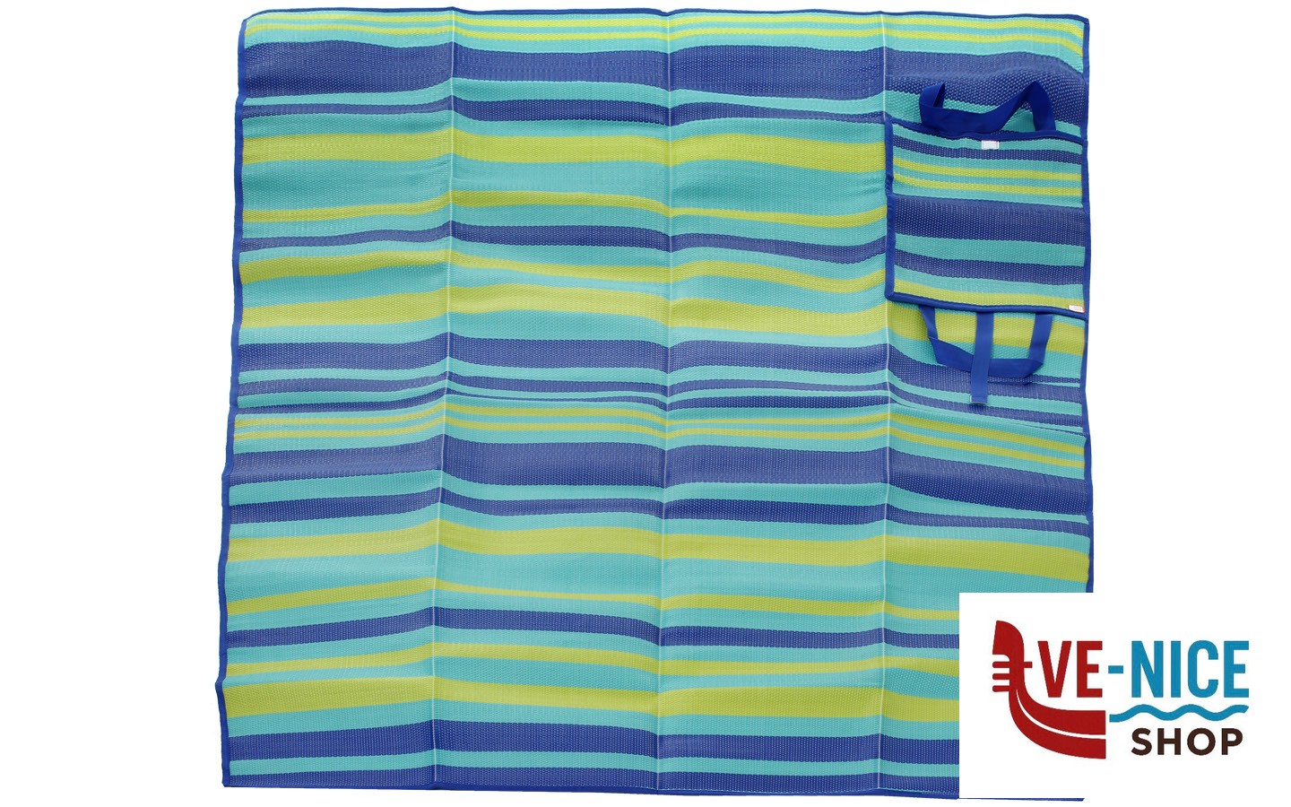 Stuoia spiaggia realizzata in tessuto PP flessibile, resistente e idrorepellente. Design moderno. Pratica da riporre e trasportare.